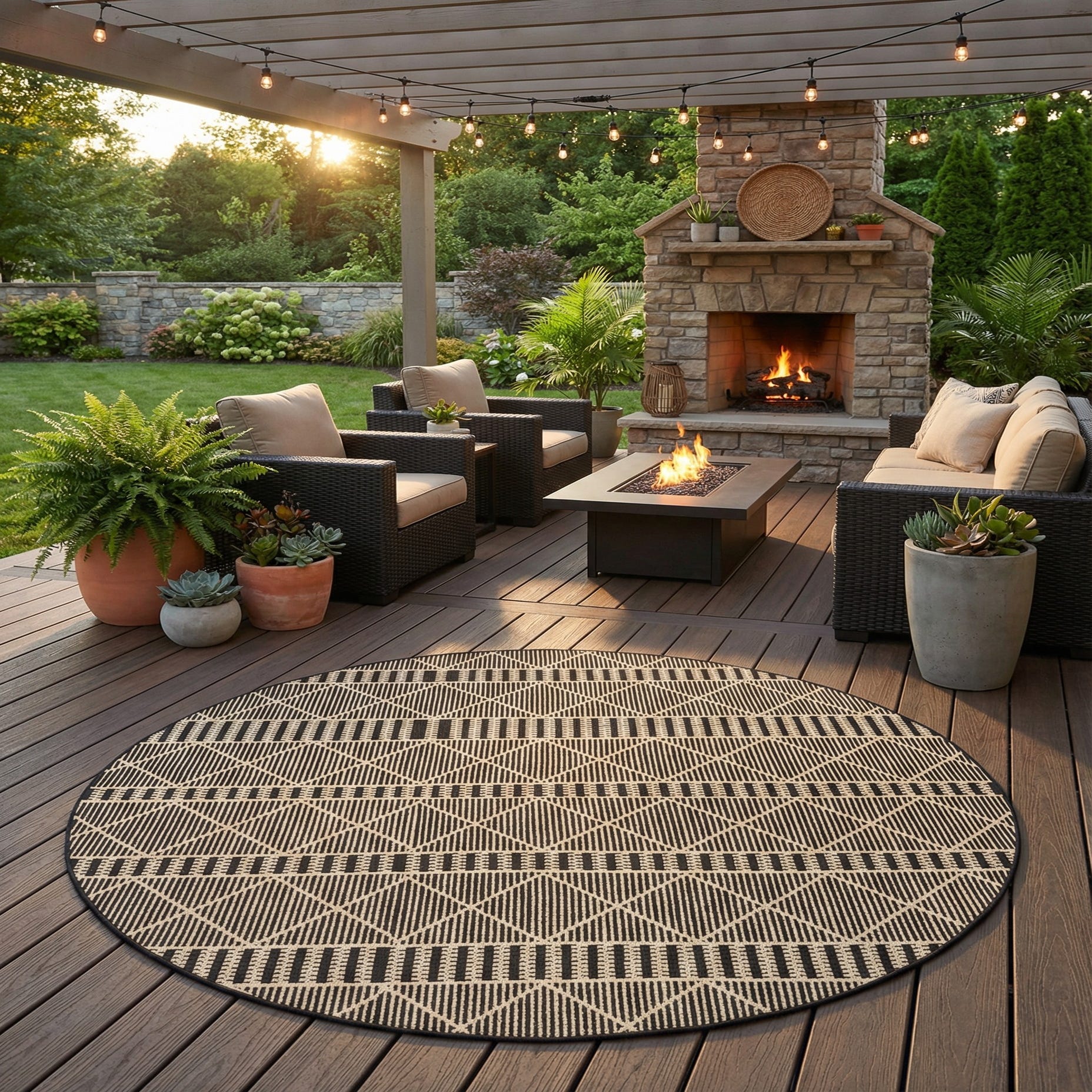The Outdoor Lattice Collection offers a modern take on classic design with this 8 Ft Round area rug. Crafted with 100% polypropylene, it features a distinctive pattern of ivory geometrical lattice on a stark black background, imbuing any space with contrasting visual interest. The machine-woven construction lends itself to a flatweave texture that feels comfortable underfoot while still being durable enough to withstand high-traffic areas.