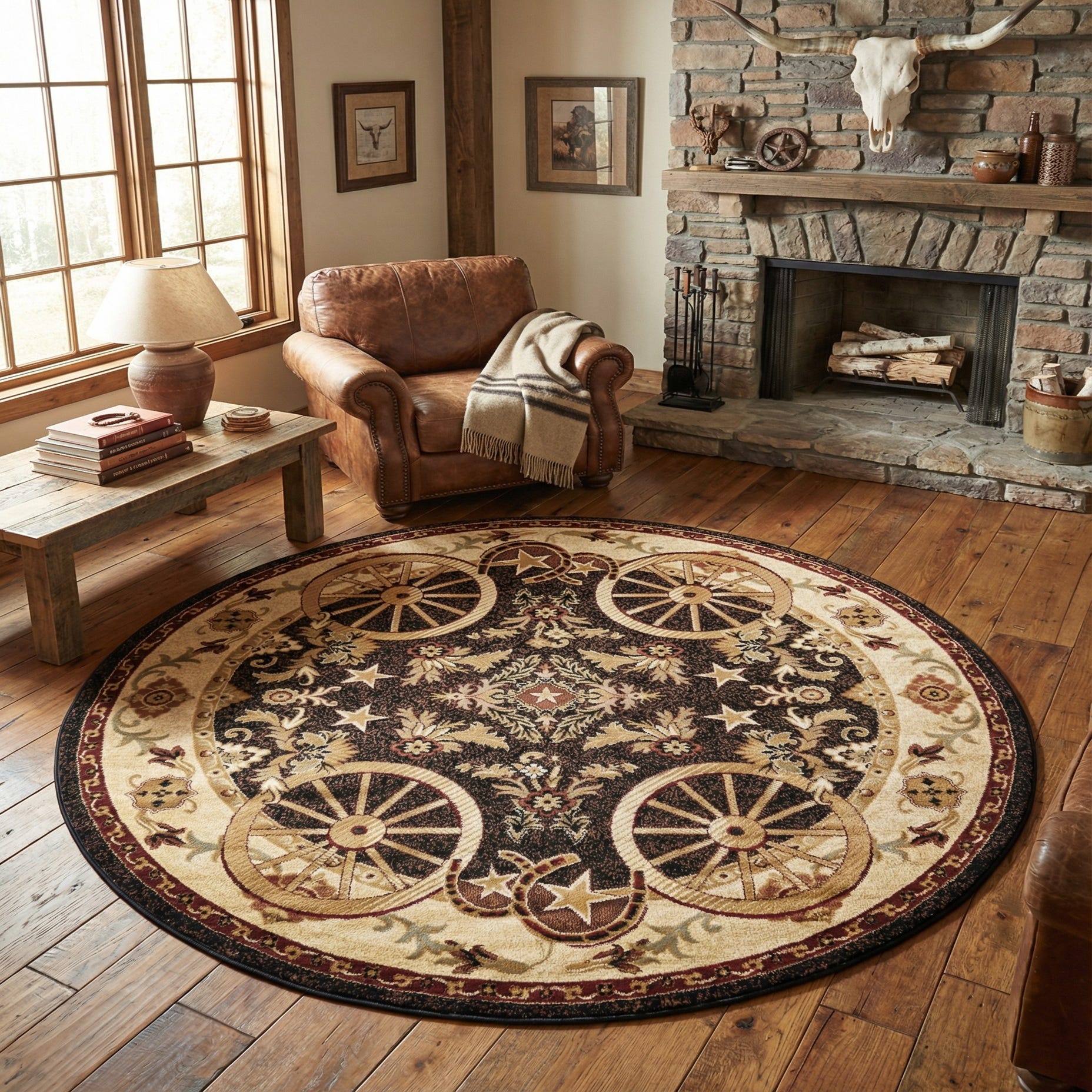 Round black and beige rustic rug featuring a central medallion, wagon wheels, horseshoes, and stars.