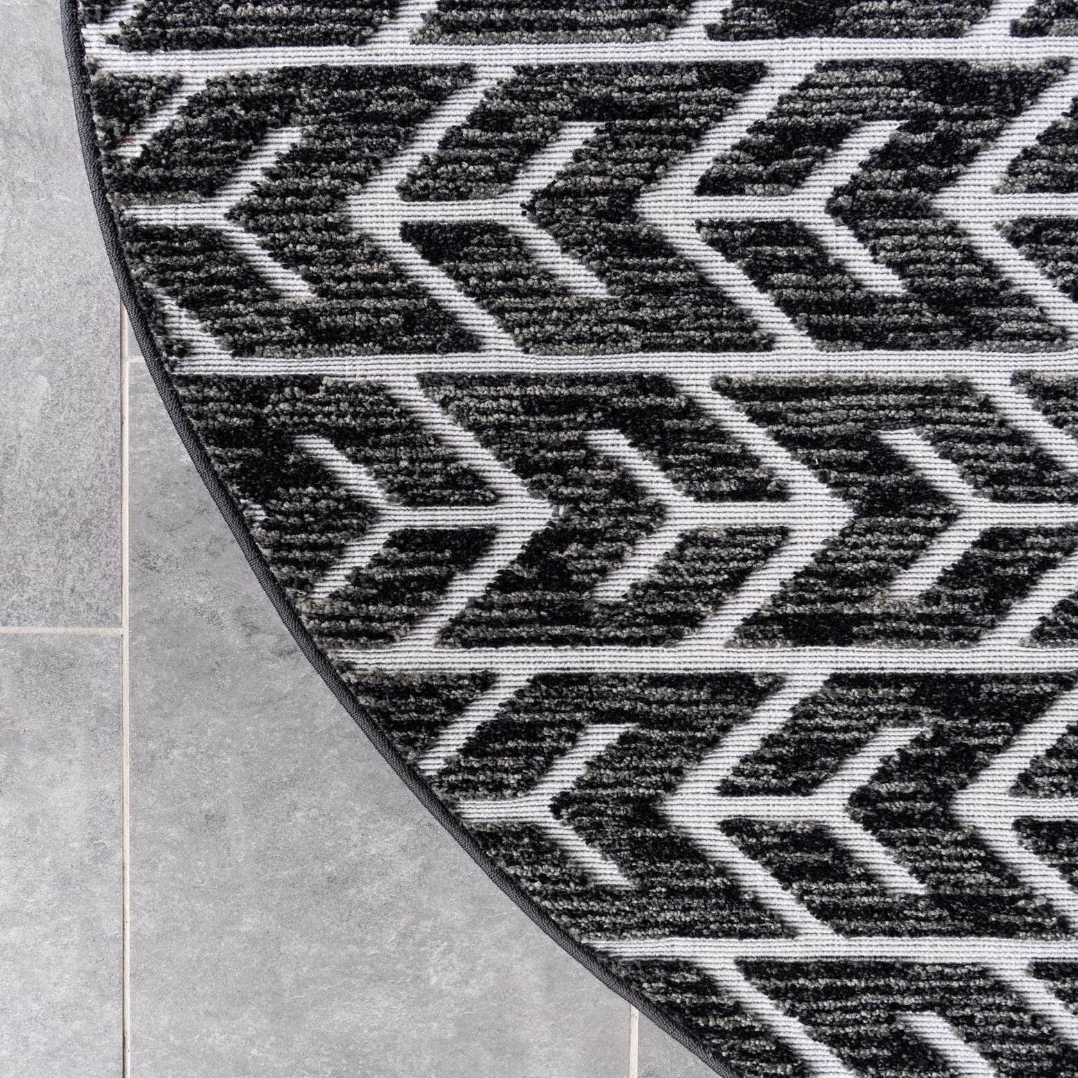 A round 8' black and white polypropylene rug with a modern tribal chevron pattern, suitable for indoor or outdoor use.