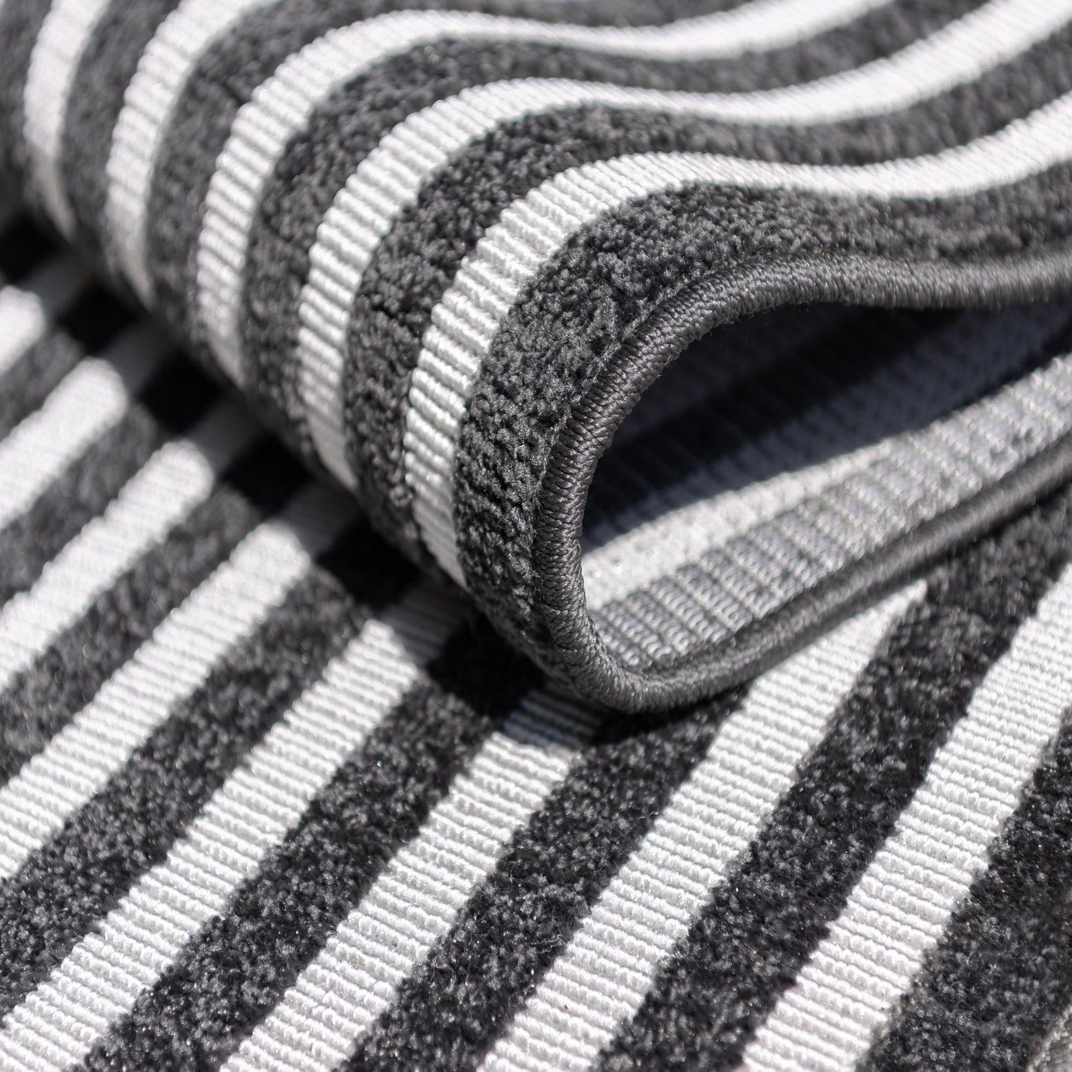 Concentric gray rings radiate from the center across a deep black background, forming a clean, graphic bullseye that brings movement and modern geometry to any setting. The low-profile surface is machine made of 100% polypropylene, with a tightly woven texture that feels firm underfoot and highlights the crisp contrast between the black ground and gray bands.
