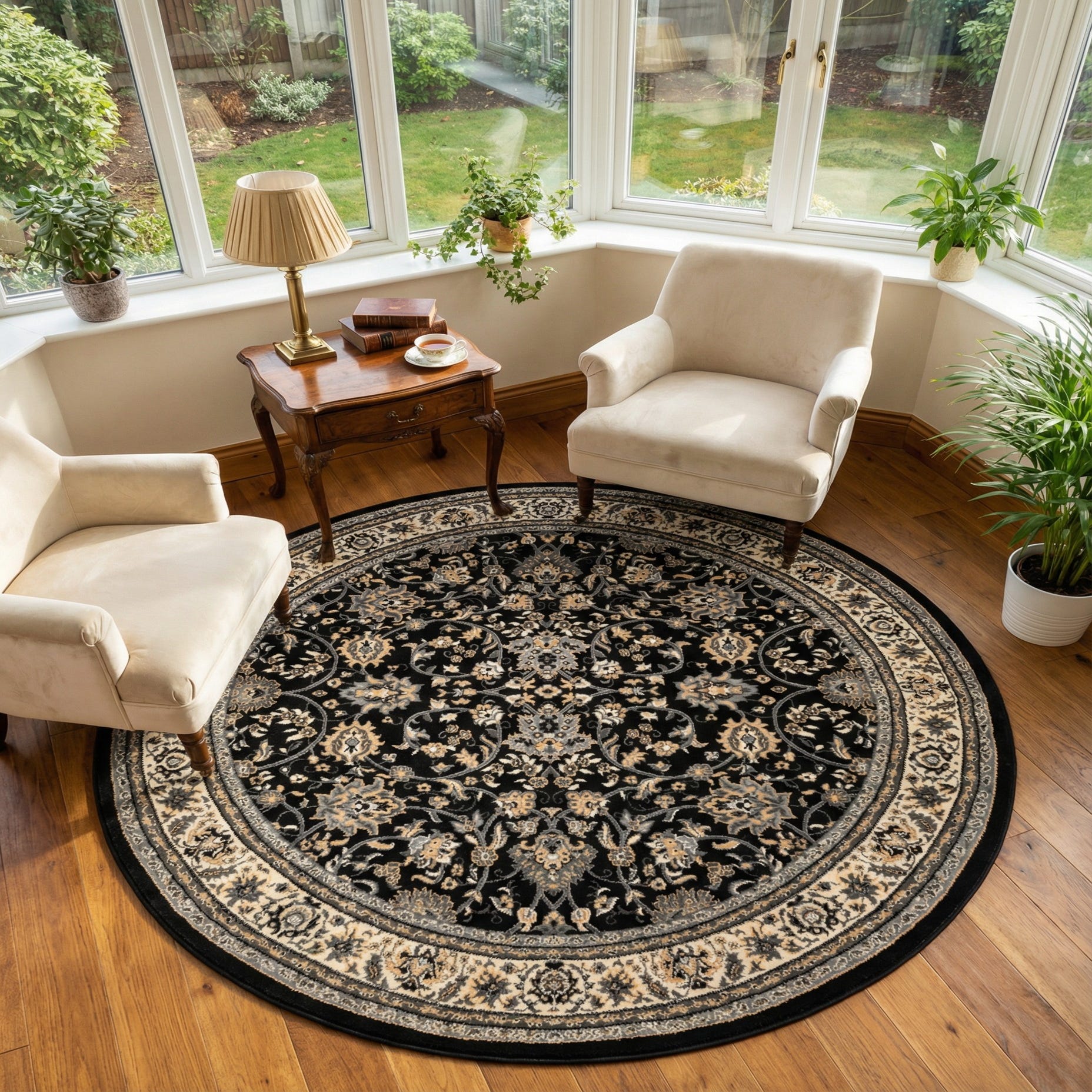 Primary color is Black. Colors in this rug include: Black, Gray, Tan, Ivory.