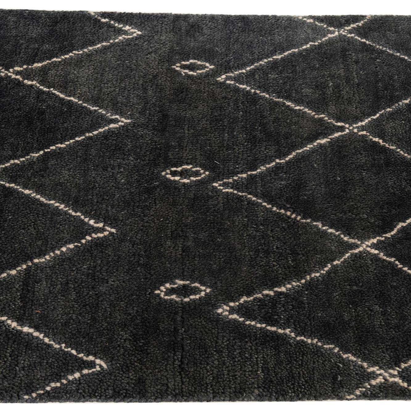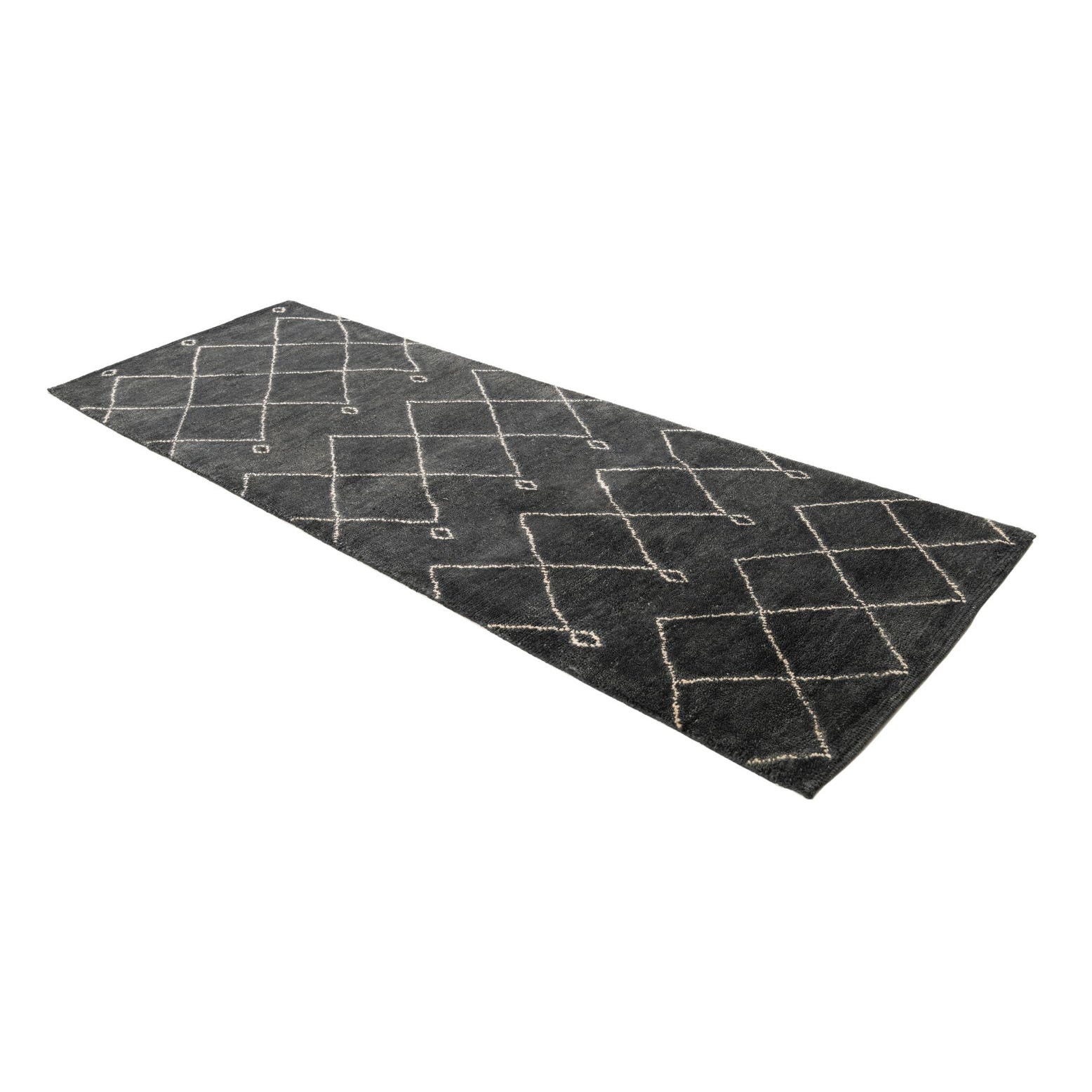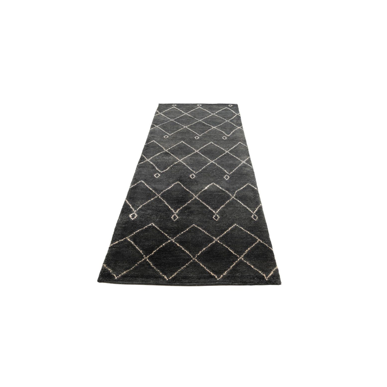 A dark gray 8 ft runner rug with a high pile and modern geometric diamond pattern in off-white, perfect for a hallway.
