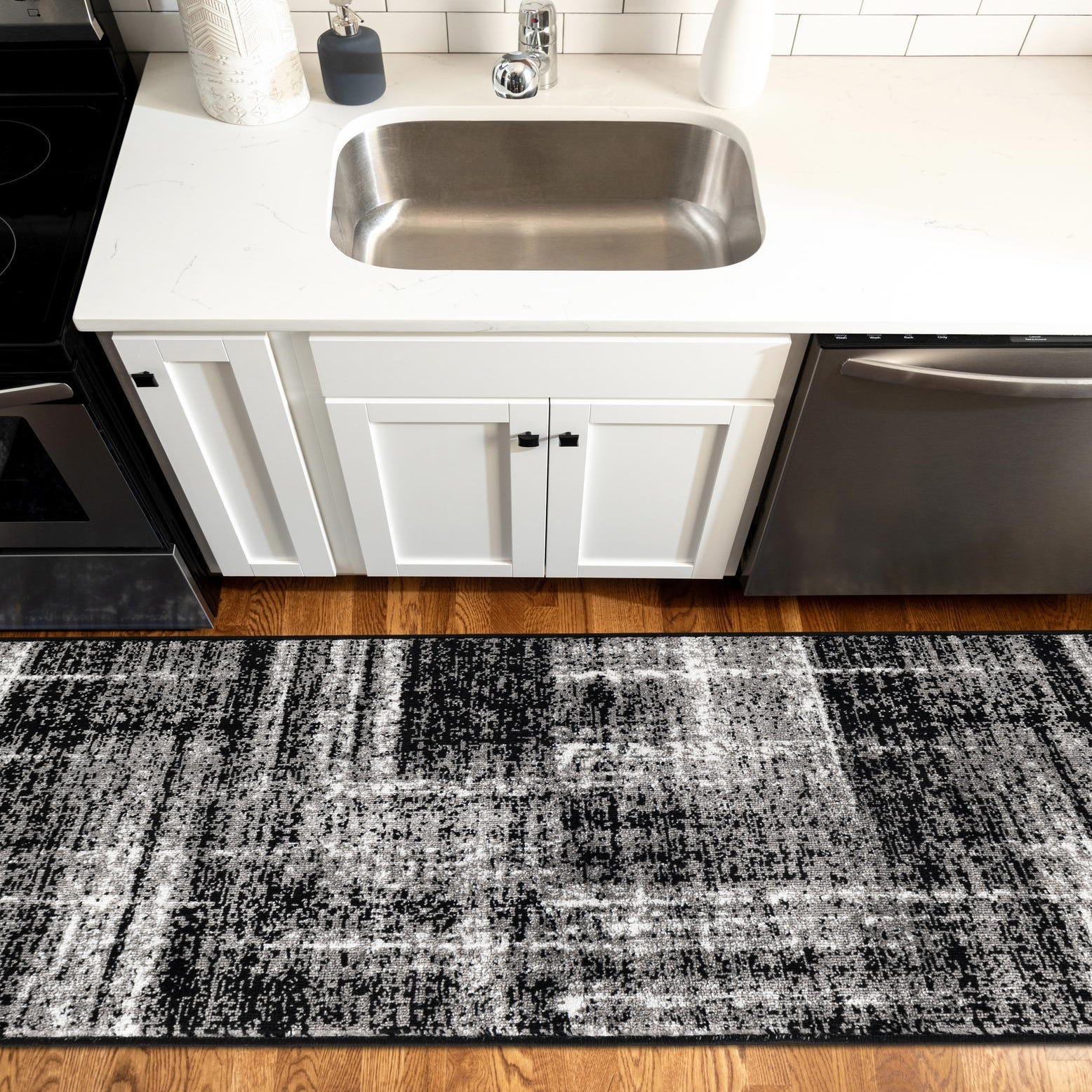A black and grey 8 ft runner rug with a distressed, abstract pattern, ideal for a hallway or kitchen.