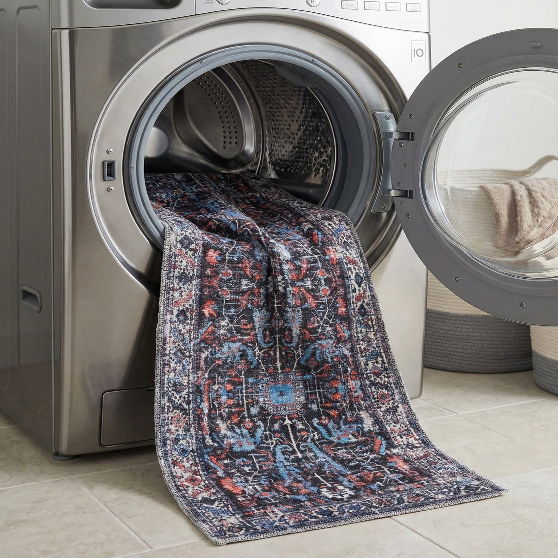 A black 8 ft runner rug with a distressed traditional tribal pattern in shades of blue, red, and white, featuring a non-slip backing.