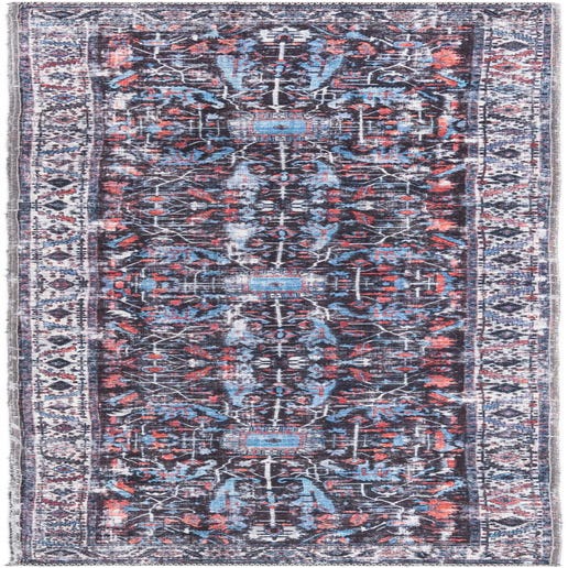 Primary color is Black. Colors in this rug include: Black, Blue, Ivory, Light Blue, Peach, Red.