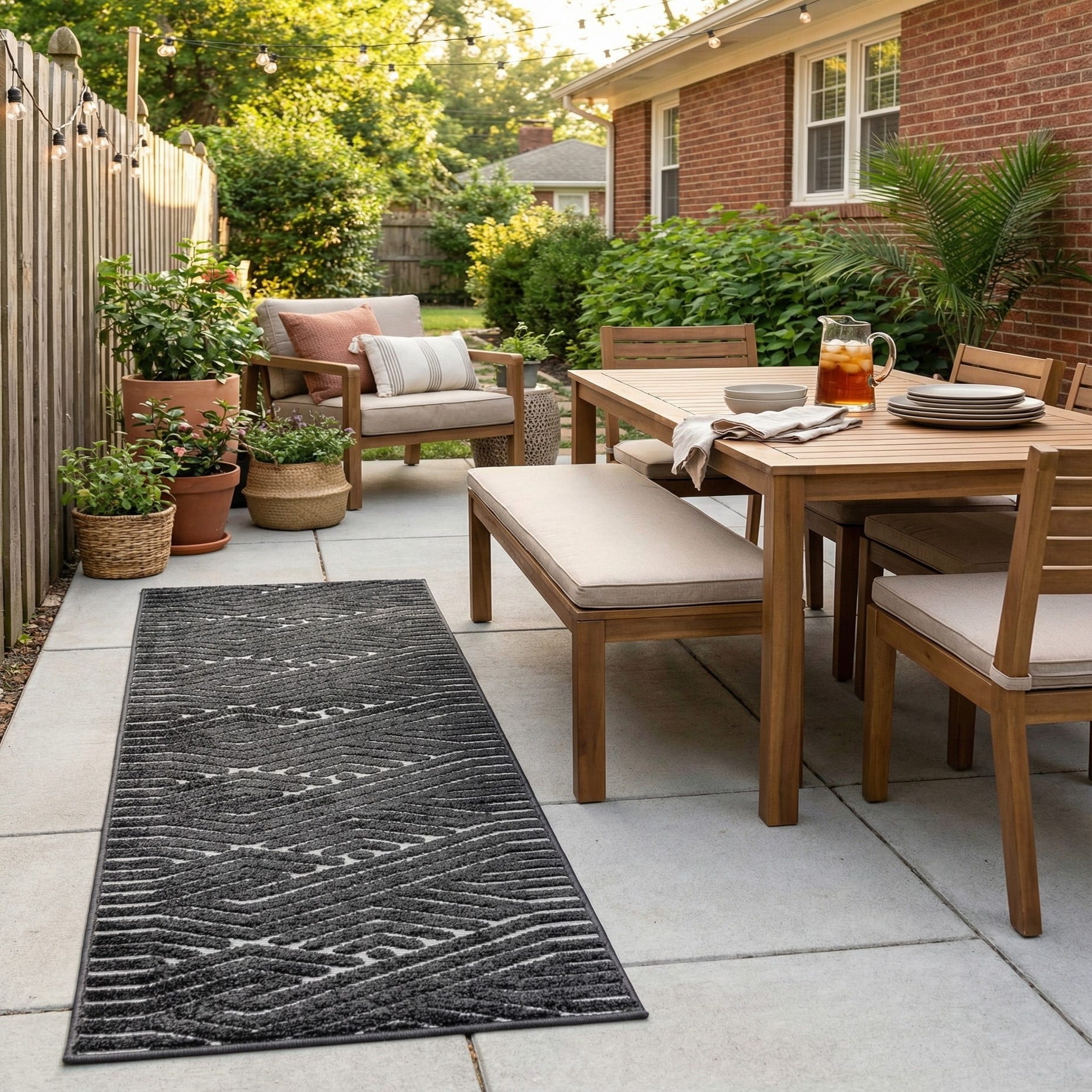 This runner works well in narrow, high-traffic areas where its linear pattern enhances movement—think entryways, hallways, kitchens, or the passage between rooms. It also pairs nicely with minimalist, industrial, or monochrome interiors; try it against light wood floors to heighten contrast, beneath a slim console table to anchor an entry, or on a covered patio to define an outdoor seating path. Its graphic look complements simple furnishings and woven accents, offering a strong visual foundation for layered styling.