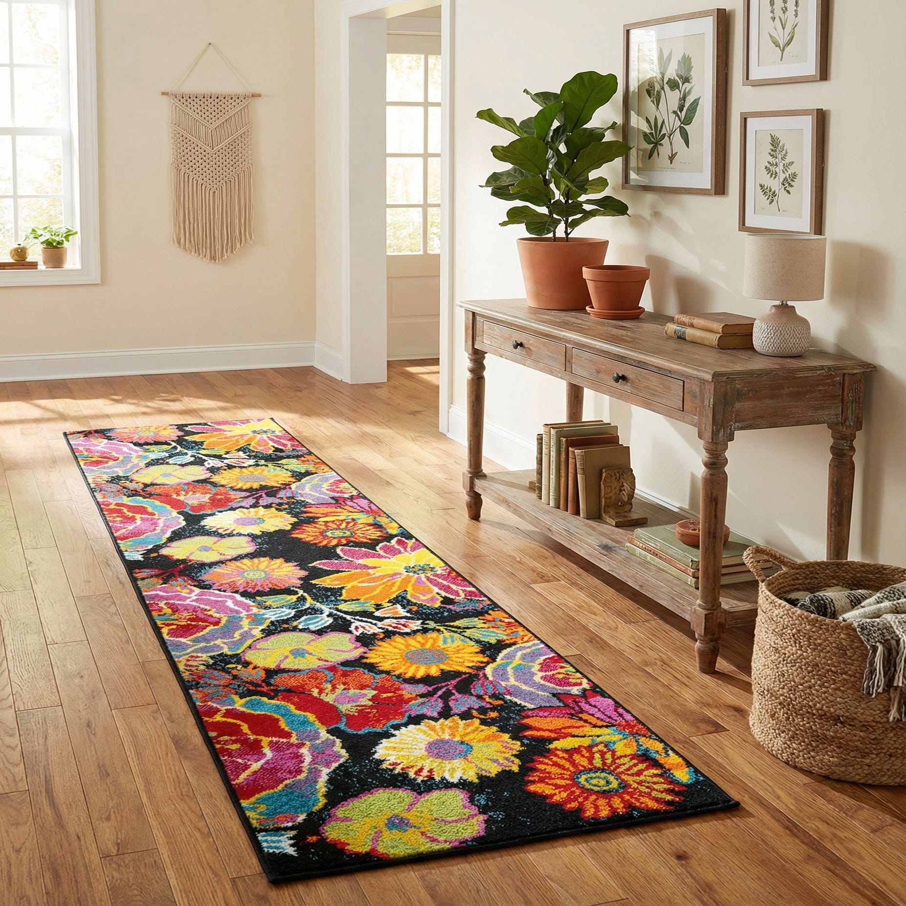 A bold, contemporary floral runner with a black ground that makes each bloom pop. Oversized flowers and layered petals are rendered in energetic color—sunny yellow and orange, hot pink and red, pops of blue and green with ivory highlights—outlined and detailed to create a lively, hand-painted effect. The pattern reads as an artful mix of large daisies, peonies and scattered foliage, giving the piece an eclectic, modern-bohemian spirit that anchors narrow spaces with visual interest.