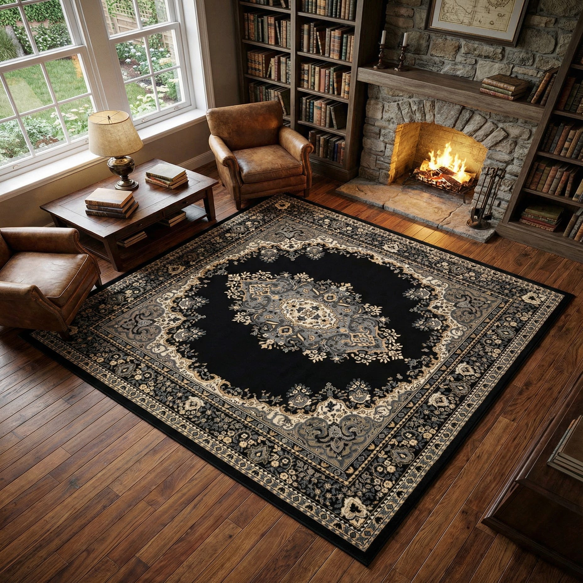A traditional medallion anchors the design, set against a deep black ground that makes the light blue and beige details stand out. Intricate floral scrollwork and corner spandrels radiate from the center, while a layered floral border frames the composition. The palette of black, beige and light blue gives the rug a grounded, refined look that pairs ornate patterning with a clear, balanced color story.