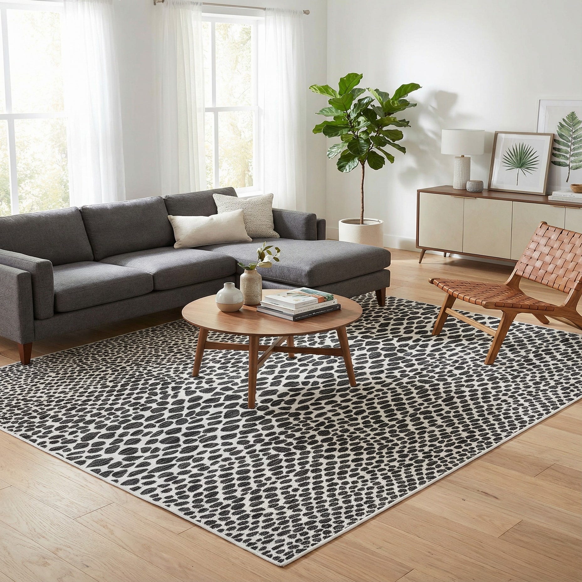 This piece works well on a covered patio or balcony where a modern, monochrome look is desired, and it can also anchor a minimalist living room or a sunlit dining area when used indoors. Pair it with light linen or natural rattan furniture for contrast, or use it with black metal accents and simple, sculptural pieces to emphasize the graphic pattern.