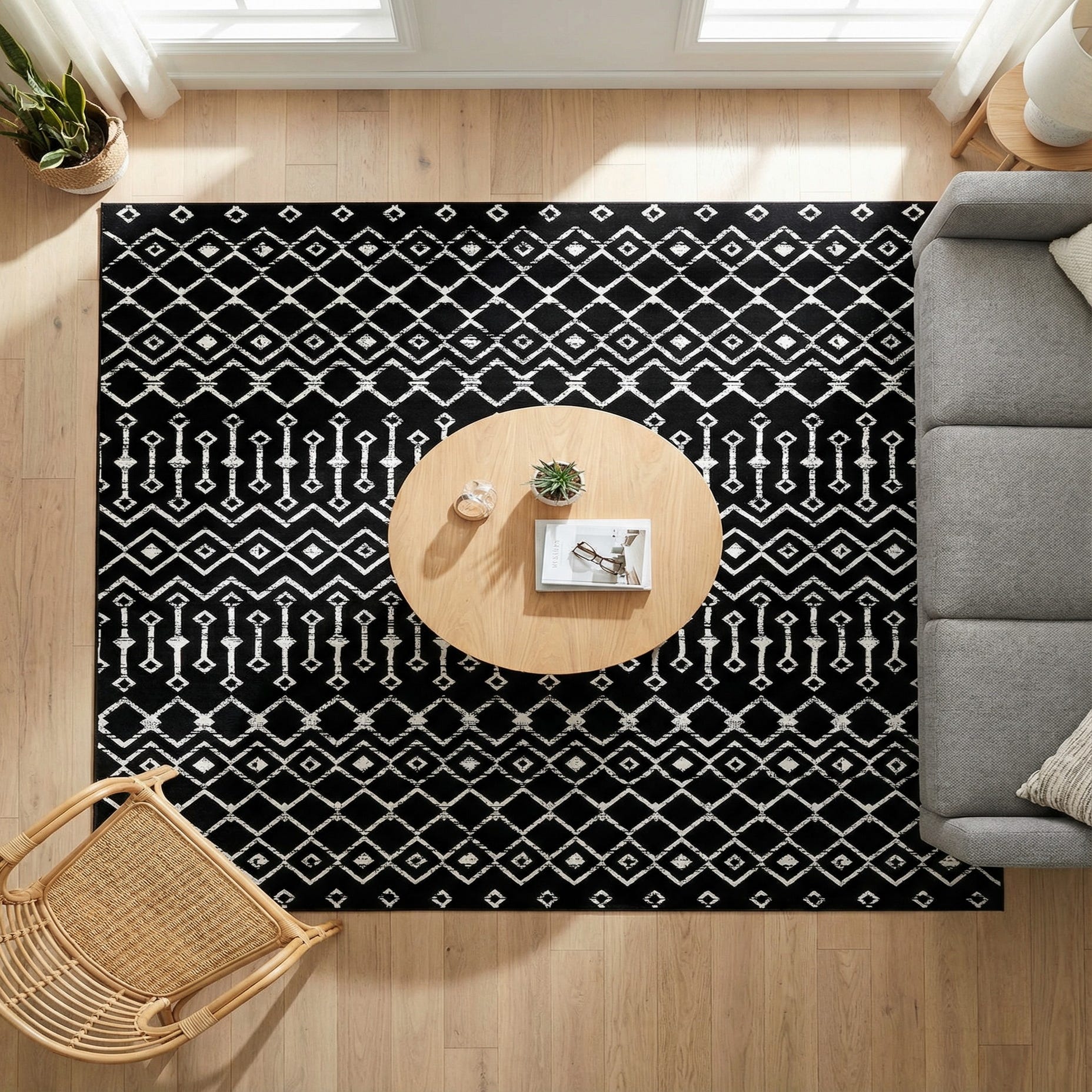 This rug pairs naturally with contemporary and minimal interiors where bold contrast and clean lines are desired, but it also layers well in eclectic or boho schemes to add structure. Use it to anchor a seating area in the living room, define an entryway with a strong first impression, or place it beneath a dining table to introduce graphic pattern without overpowering surrounding decor. Its monochrome palette complements mid-century modern furnishings, industrial accents, or soft neutrals for a modern, pulled-together look.