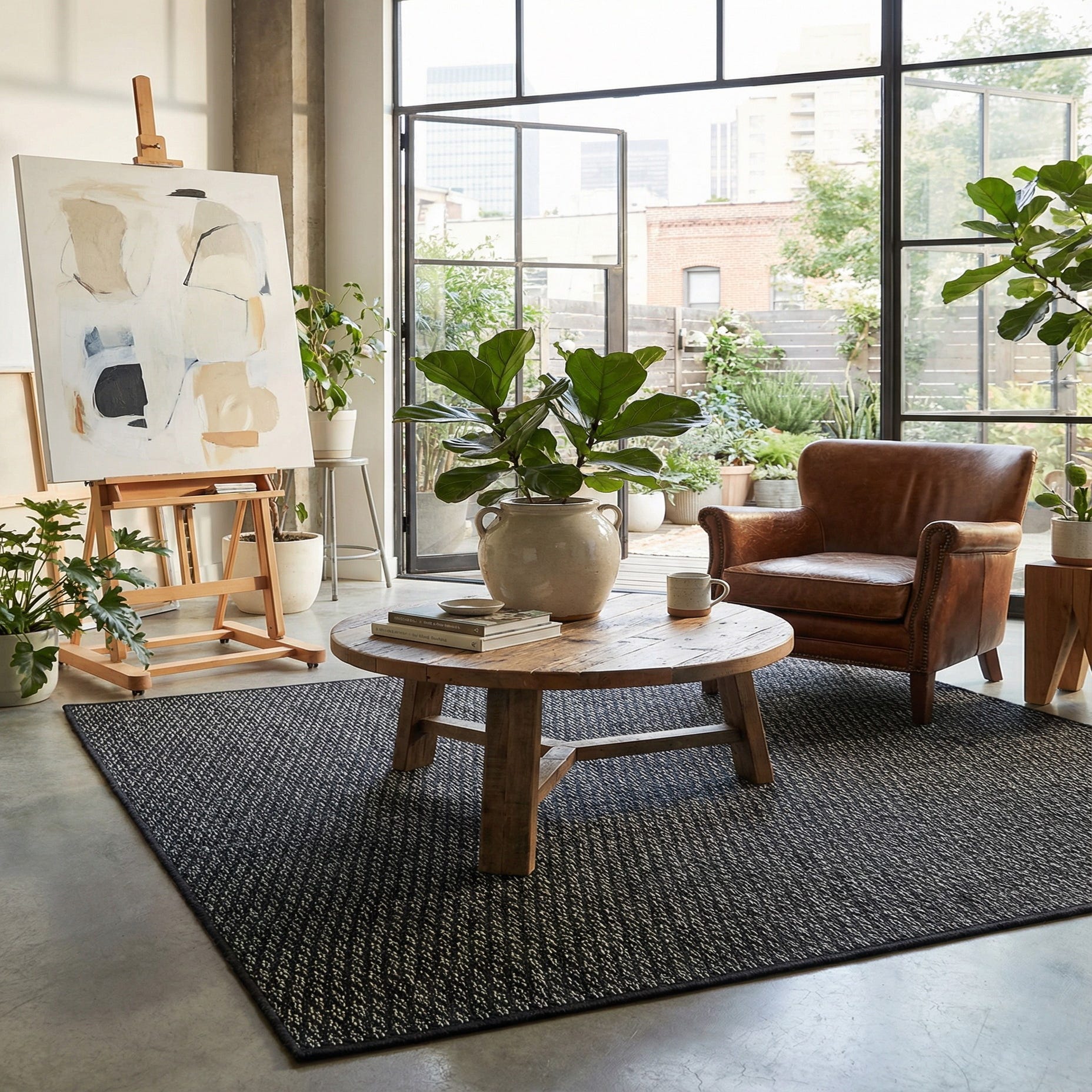 A close-up, overhead view of a black square rug with a subtle, textured lattice pattern, made from wool and cotton.