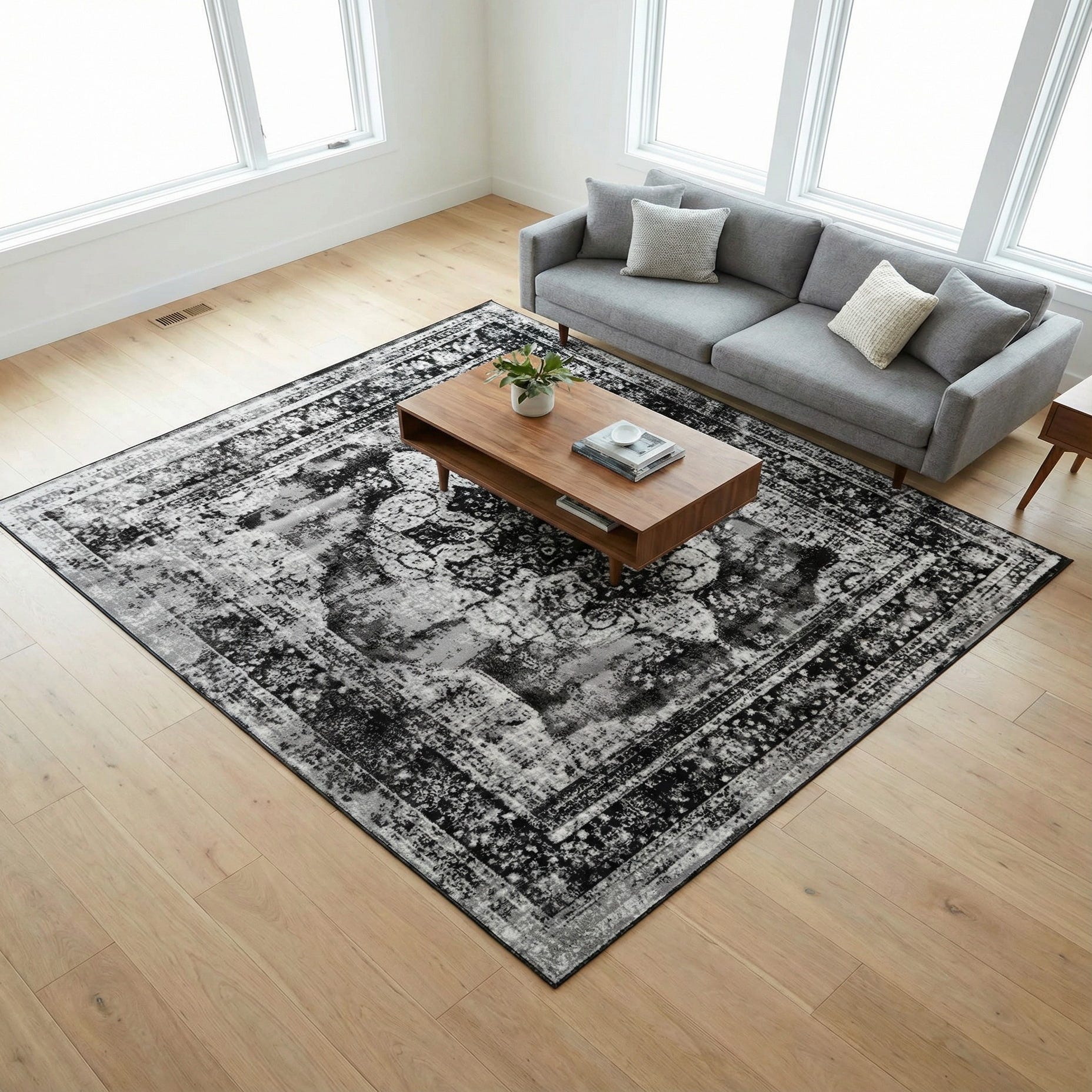 The Monte Carlo Collection presents a refined 8-foot square rug, machine woven to precision using 100% polypropylene fibers. This rug showcases a dynamic interplay of black, gray, and ivory hues set against a commanding black background. The pattern is reminiscent of a distressed vintage tapestry, offering a blend of elegance and time-worn sophistication.