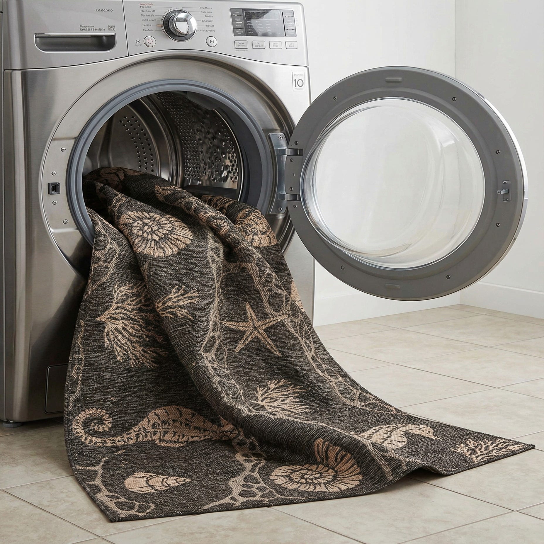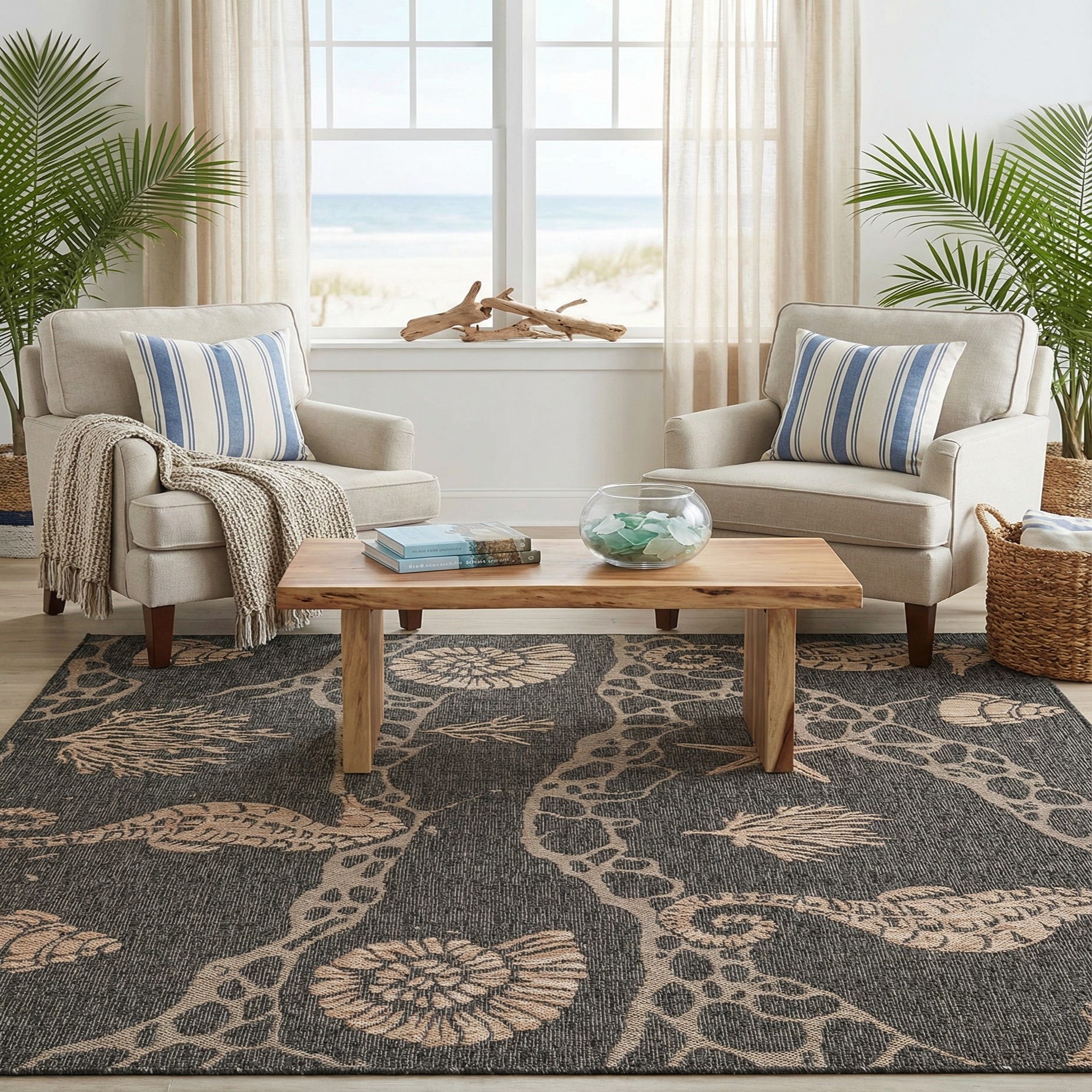 A coastal-inspired pattern of seahorses, shells, starfish and coral drifts across a deep black ground, the motifs rendered in warm sand and taupe tones for clear contrast. The design combines natural marine imagery with a subtle, net-like lattice that adds visual movement without overwhelming the composition. Clean lines and a muted palette give the rug a relaxed, nautical sensibility that fits both indoor and outdoor settings.