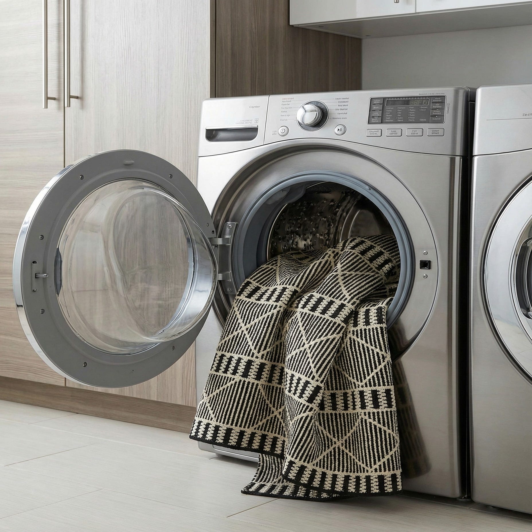 The monochrome palette and bold geometry work well in contemporary, transitional, or minimalist settings. Place it on a covered patio or sunroom to anchor seating, pair it with light wood or metal furniture for a modern coastal or industrial look, or use it under a dining table to define a casual eating space. Its graphic pattern keeps the room visually engaging and pairs easily with textured accents like woven baskets, linen cushions, or matte finishes.