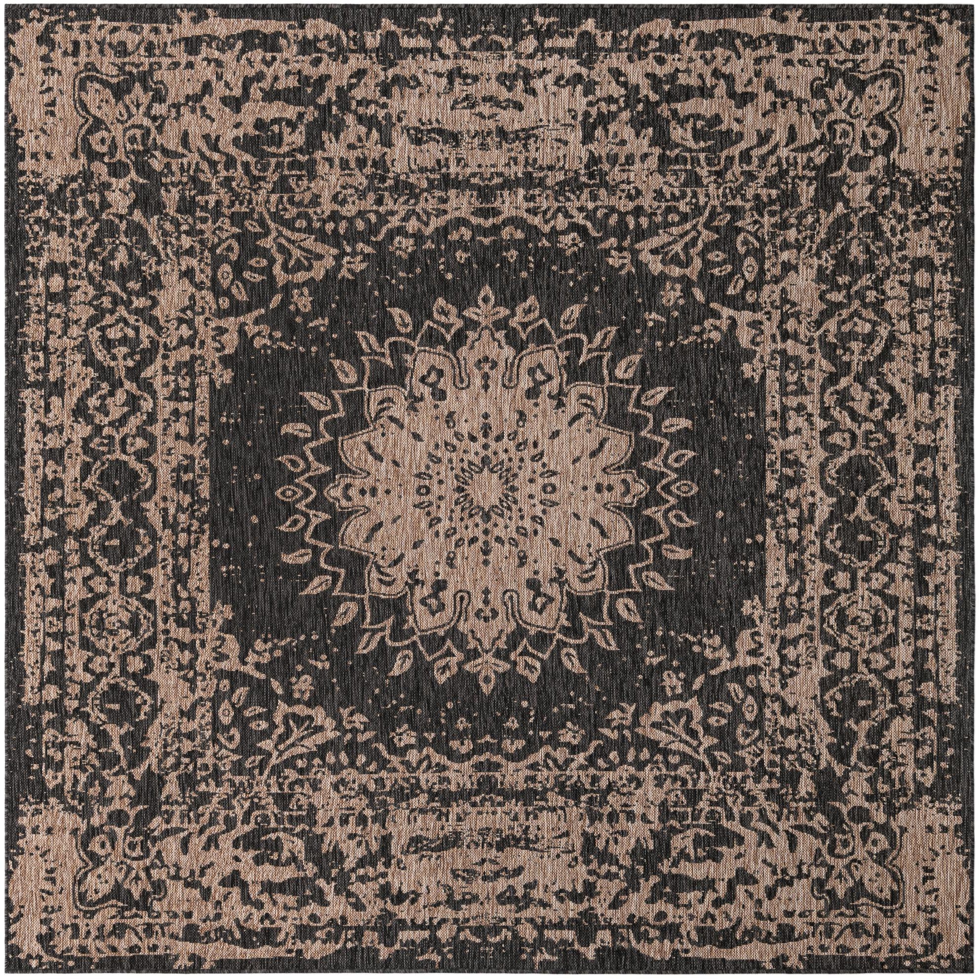 A 7' 10 x 7' 10 square black and beige vintage medallion rug with a textured flatweave.