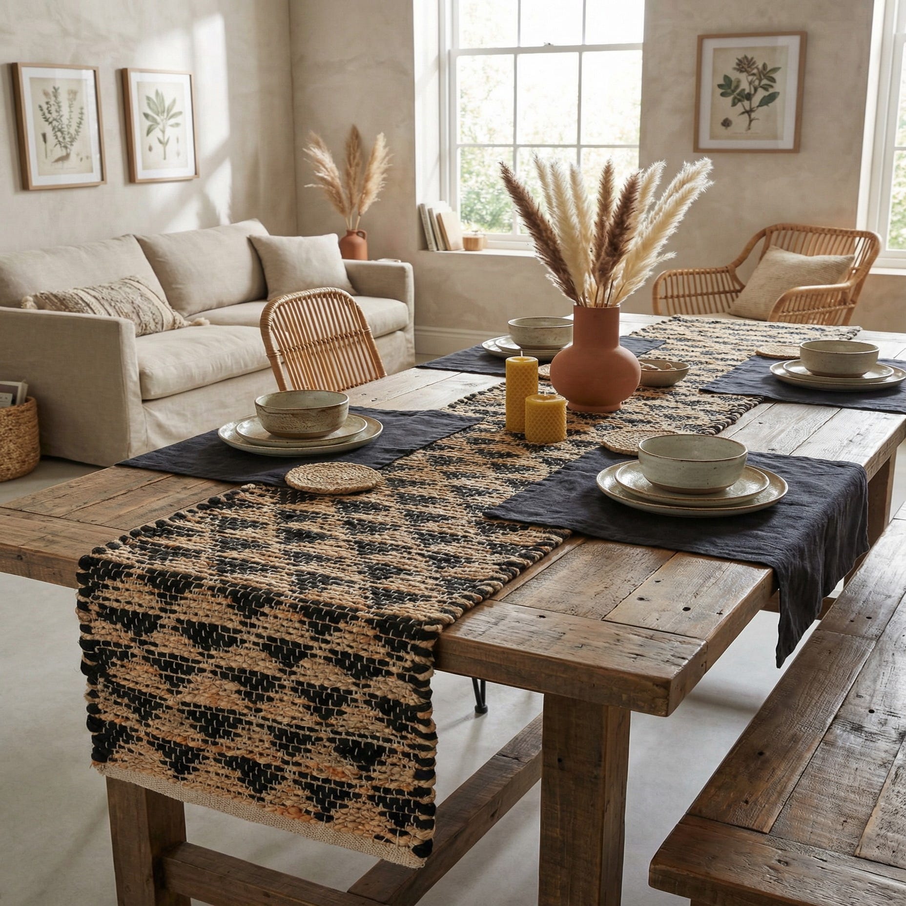 This piece is well suited to casual and refined settings alike — use it on a dining table to anchor simple ceramic place settings, across a console table beneath lamps and bowls, or down a kitchen island for a touch of woven warmth. It pairs particularly well with unfinished or medium-toned woods, matte black metal accents, and neutral linens, making it a good match for modern farmhouse, coastal, bohemian, or industrial-inspired interiors.