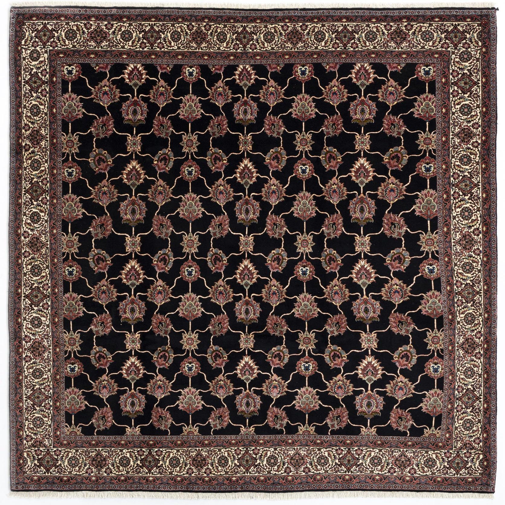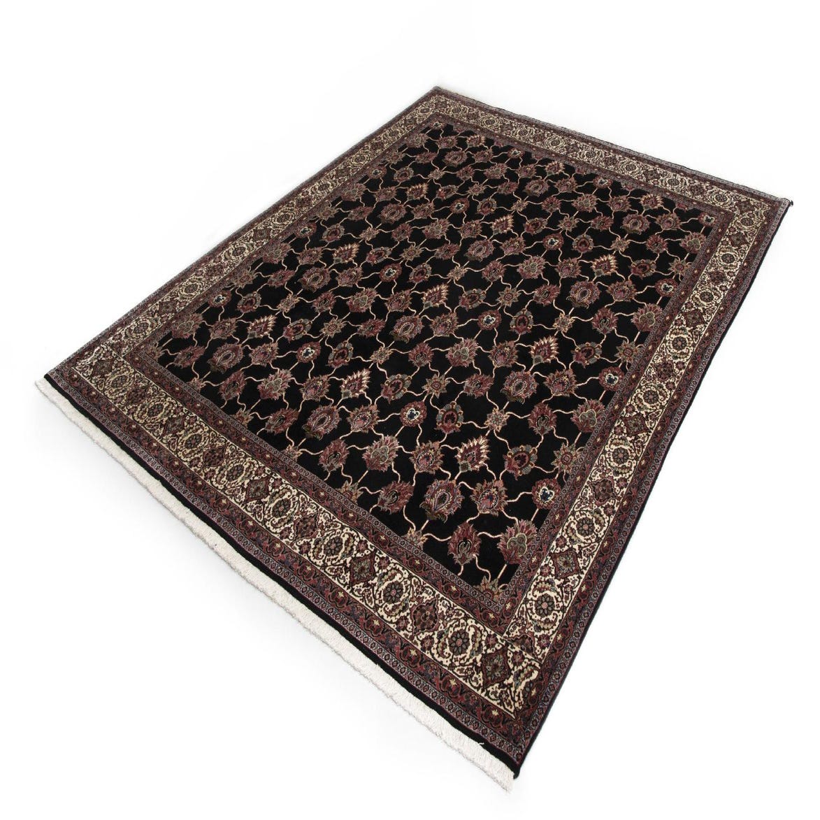 This Bidjar Fine collection piece presents an intricate pattern displayed over its generous 8x10 size, meticulously handmade from 100% wool. The rug features a dense weave, displaying a traditional design characterized by a symmetrical arrangement of floral motifs, expertly positioned throughout the rich black field. The palette primarily consists of black, combined with accents of brown, beige, and green, creating visual warmth and depth. A detailed border encapsulates the central design, adding to the classic appeal.