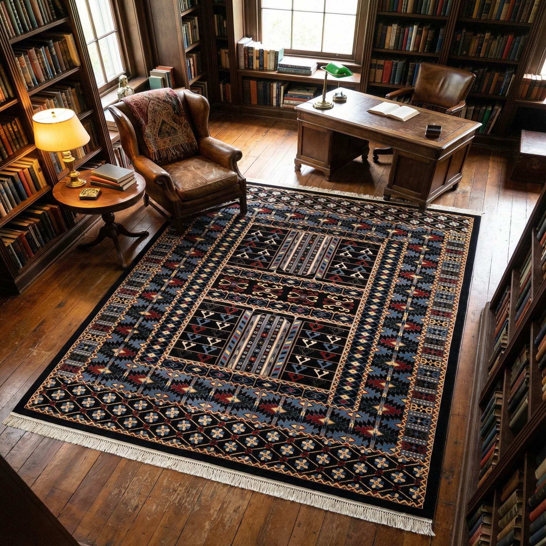 The pattern and colorway suit a range of interiors. Place it beneath a coffee table in a living room with warm wood tones and leather seating for a grounded, traditional look, or use it in a study or library to add visual structure beside bookshelves. It also works in transitional and industrial spaces where the black background and precise geometry offer a bold counterpoint to lighter upholstery and metal accents; coordinate with navy or beige textiles and brass hardware to draw out the rug’s accent hues.