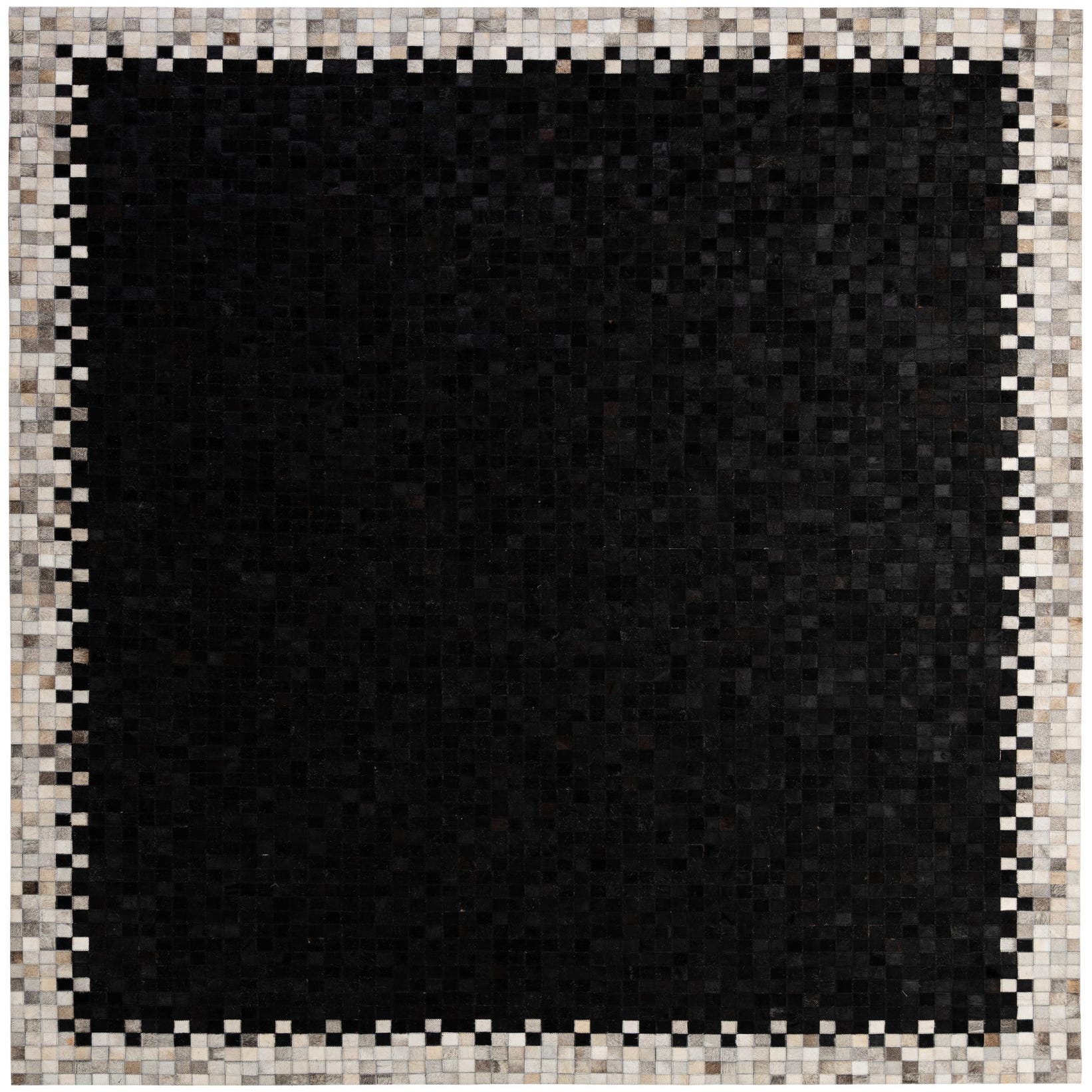 A rectangular 8x10 modern black cowhide rug with a checkered border of black, white, and grey squares.