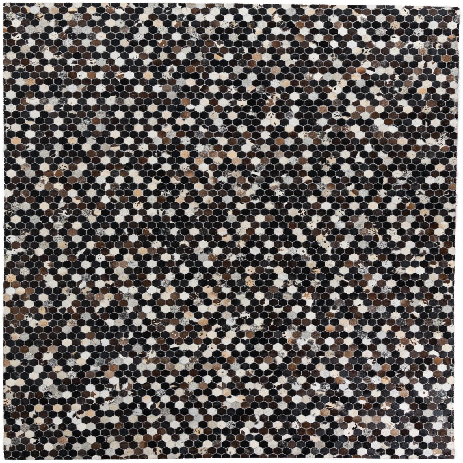 A rectangular 8x10 black, brown, and white modern cowhide rug with a honeycomb pattern, ideal for a living room.