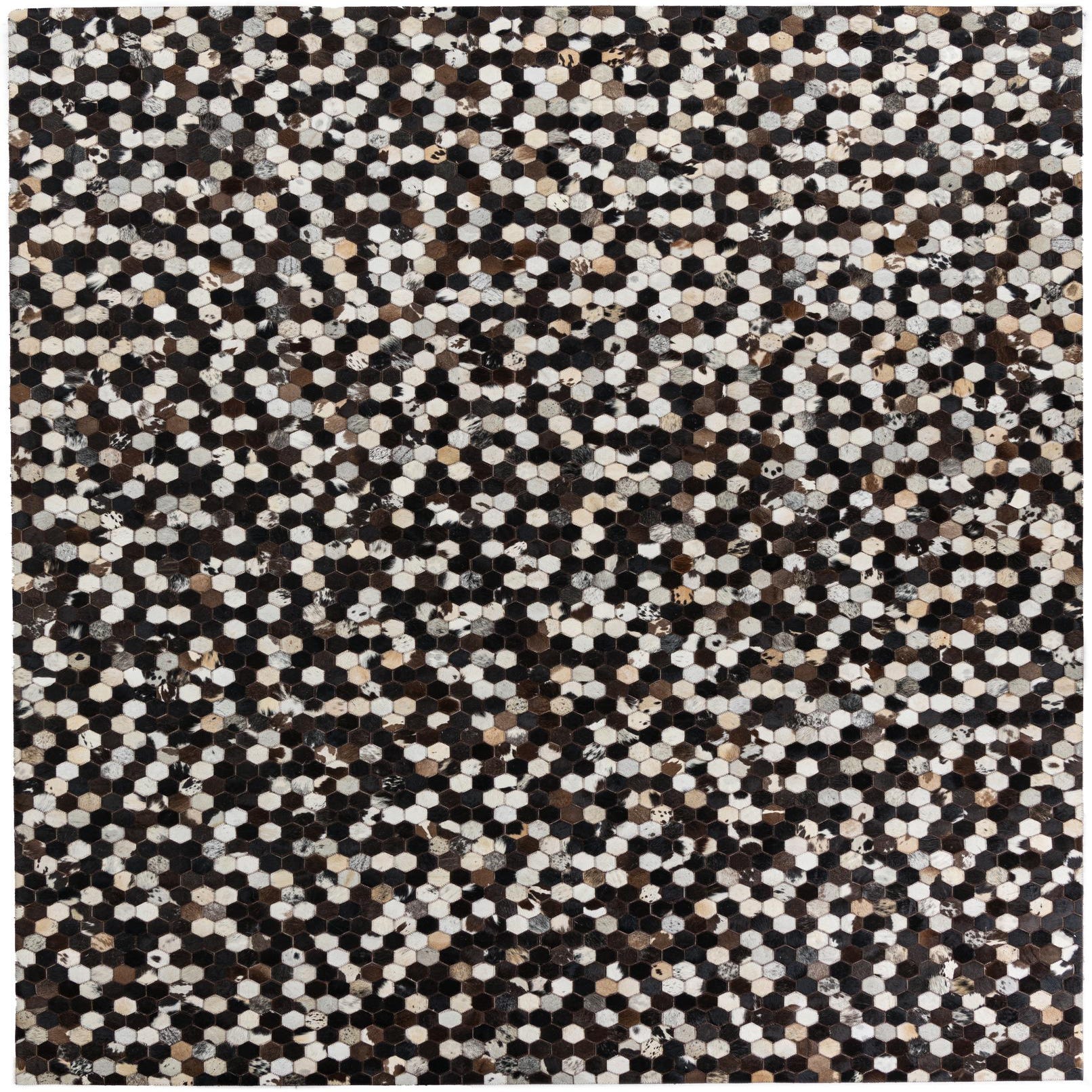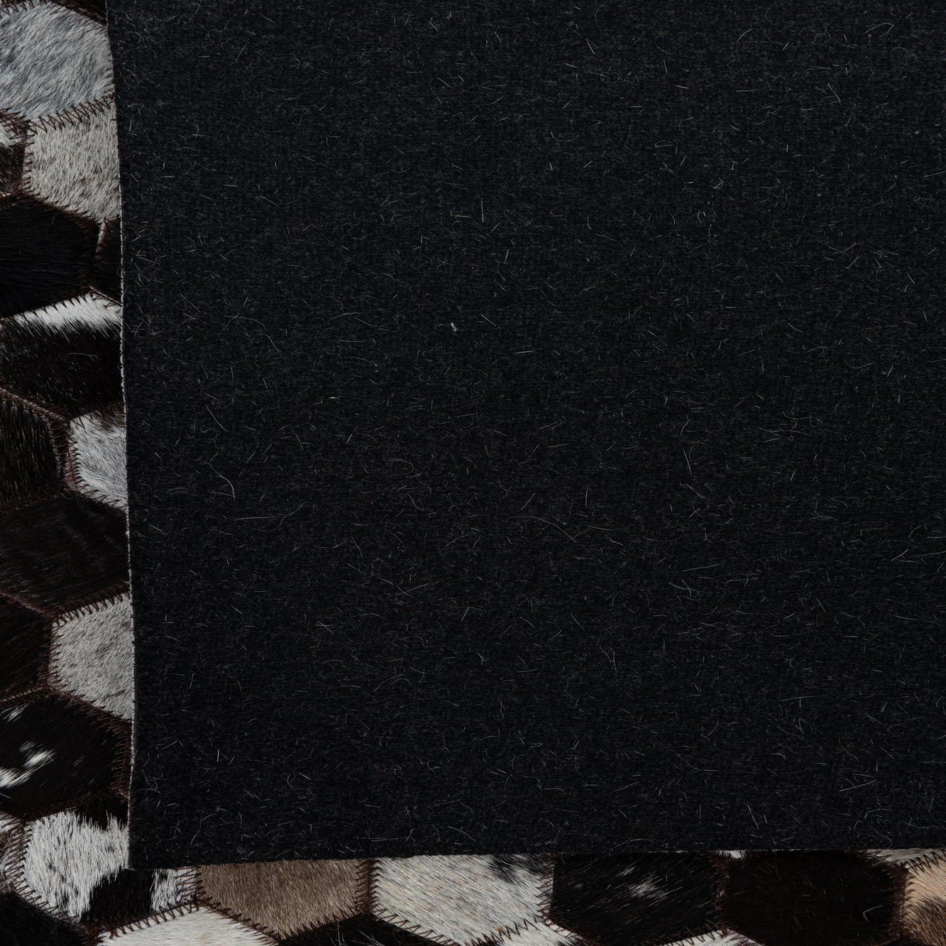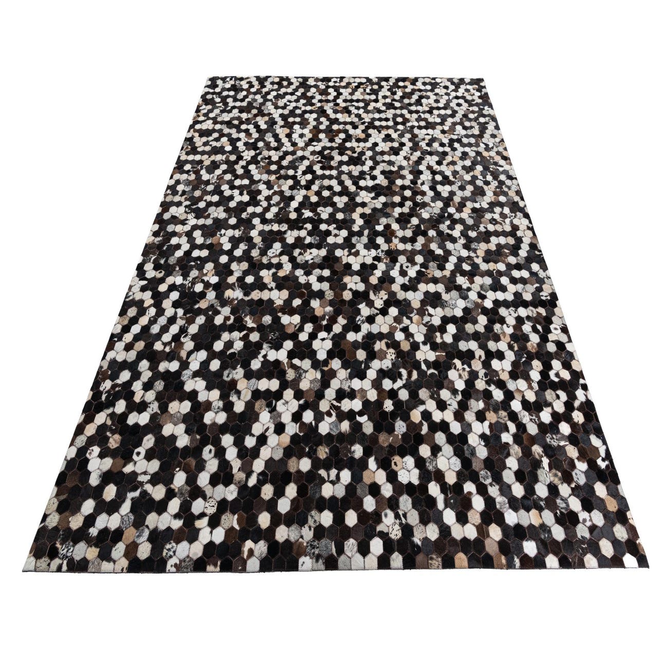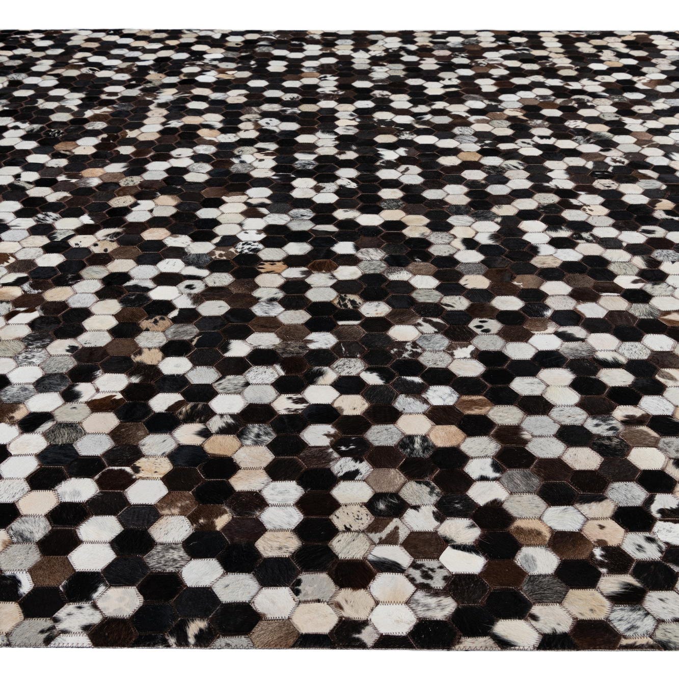 A rectangular 8x10 black modern cowhide rug with a mosaic pattern of small hexagonal leather patches in varying shades of black, white, and brown.