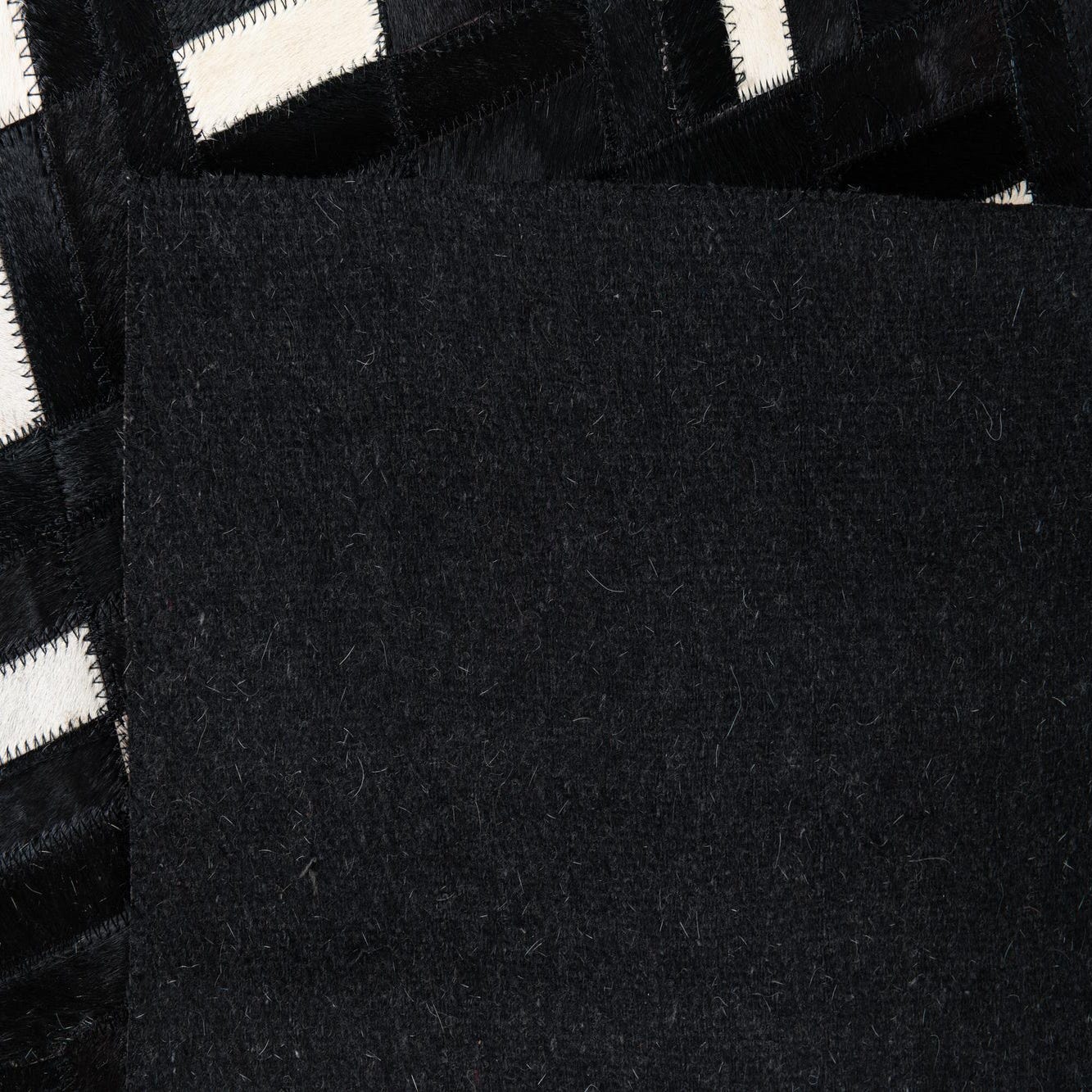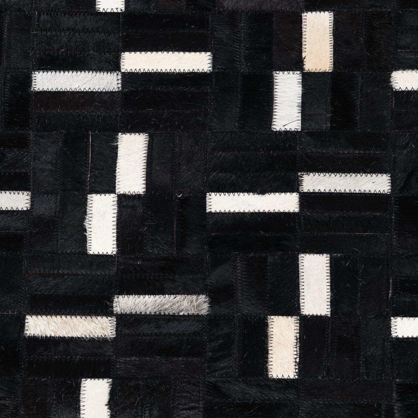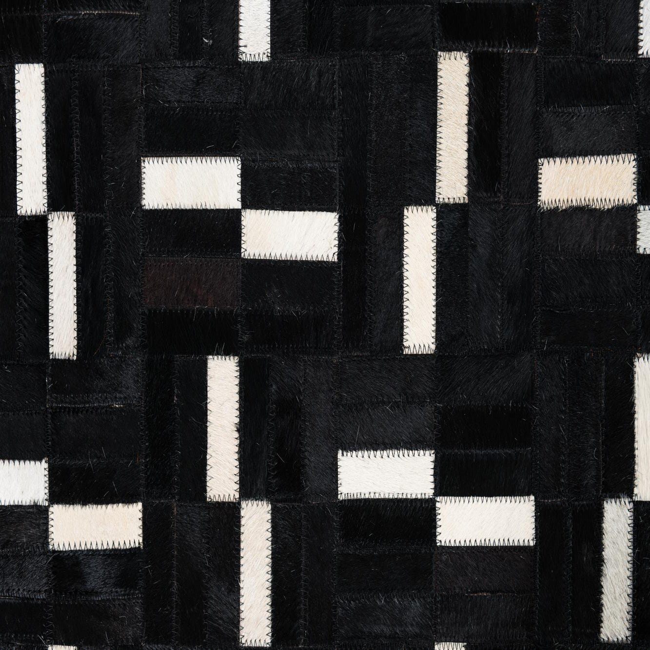 This Cowhide Leather collection 8x10 rug offers a distinctive and modern pattern with its array of black and ivory hues set against a primarily black background. The handcrafted design boasts a mosaic of rectangles and lines that create a dynamic and textural visual interest. The use of genuine cowhide and leather lends the piece an organic feel, while the interplay of colors provides a sophisticated and versatile aesthetic appeal.