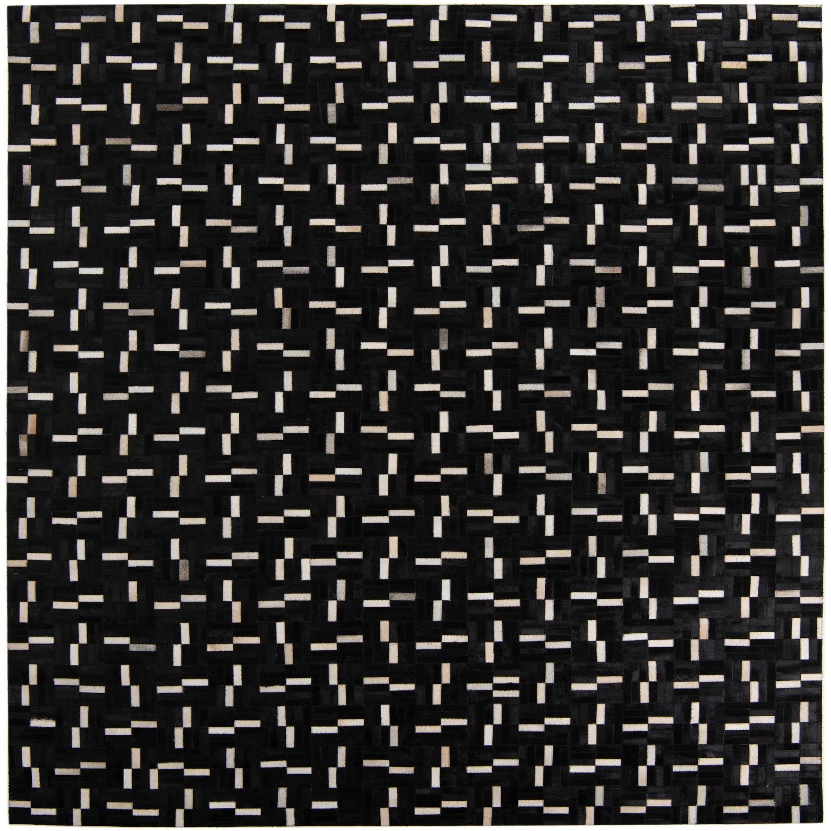 A rectangular 8x10 black cowhide and leather rug with a modern abstract pattern of white and light brown dashes.