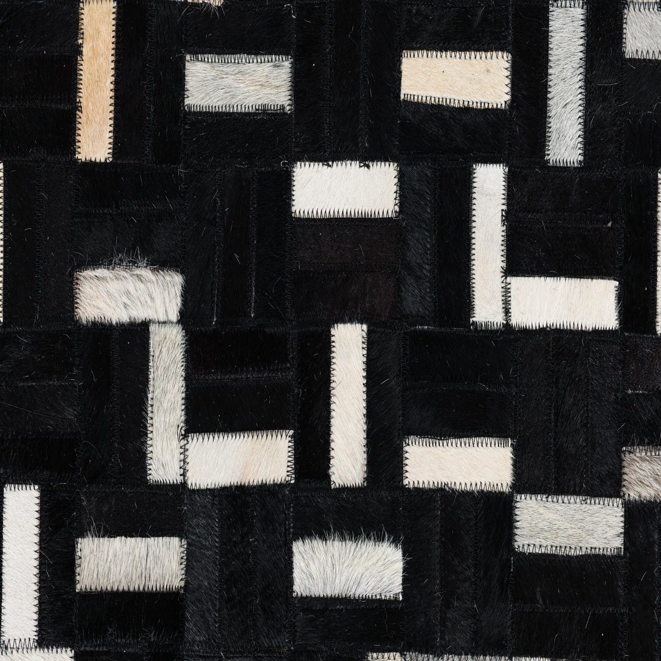 8x10 rectangular black cowhide rug with a modern abstract pattern of white, grey, and tan leather pieces.