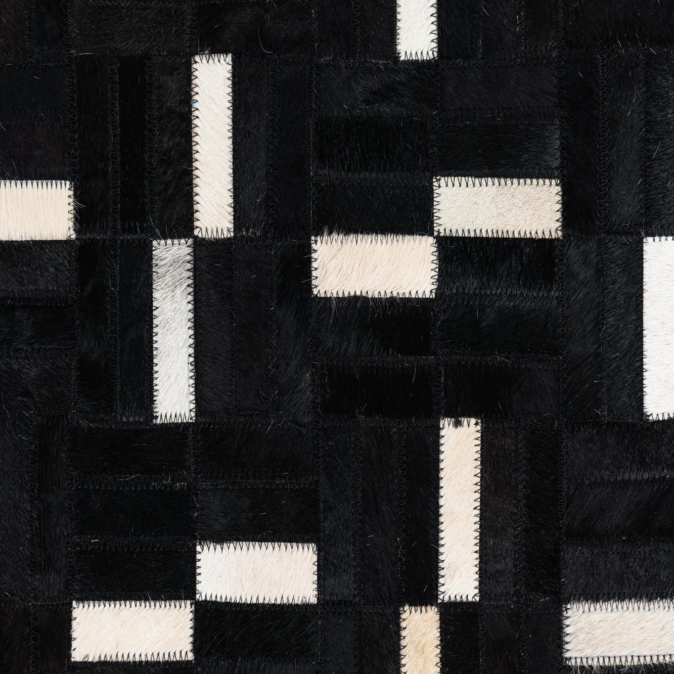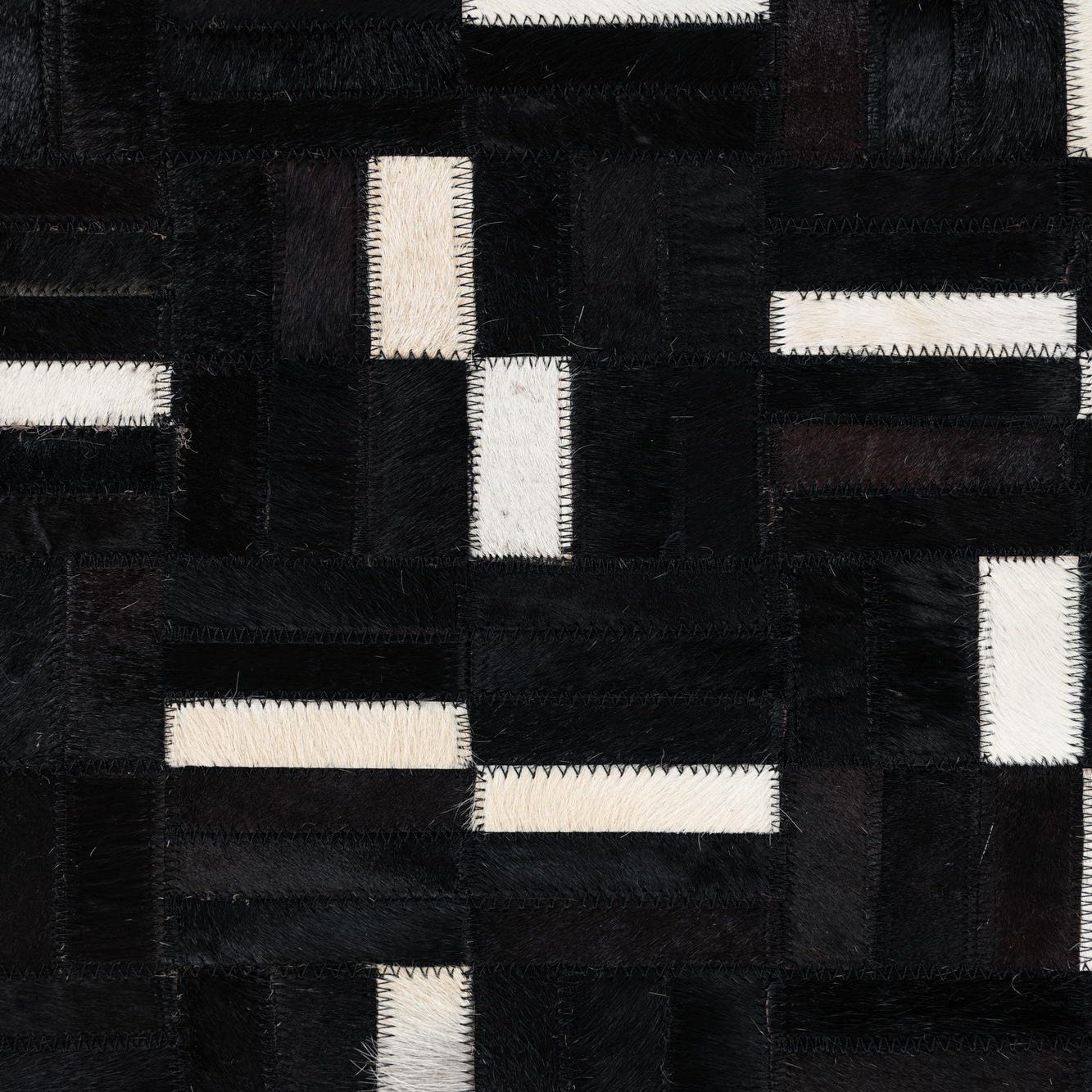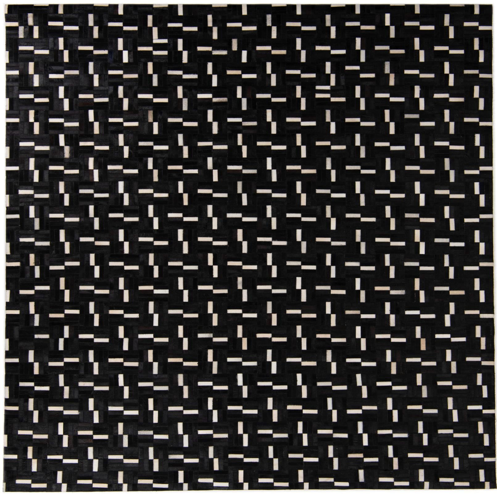 A rectangular 8x10 black cowhide leather rug with a modern stripe pattern, featuring small white rectangular accents.