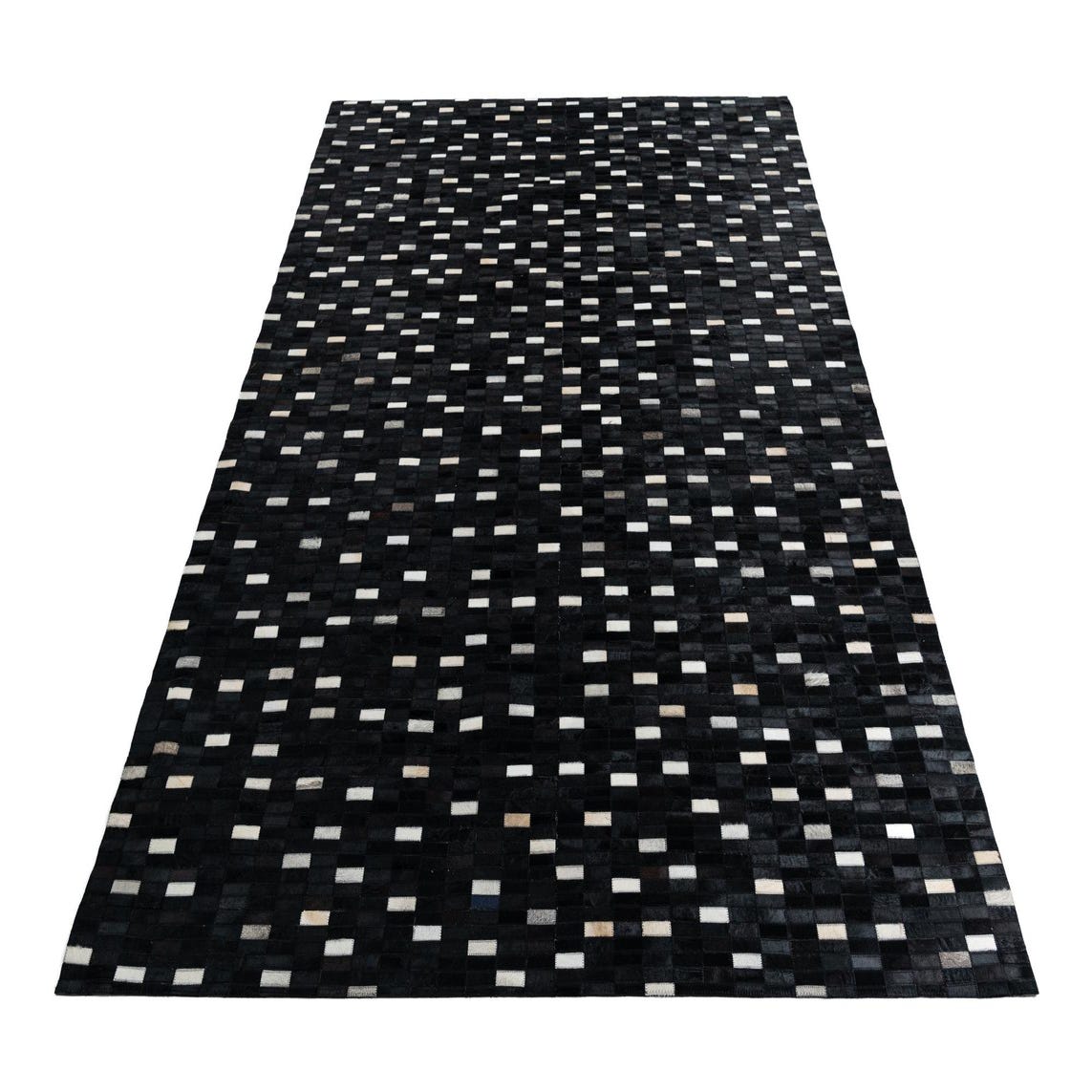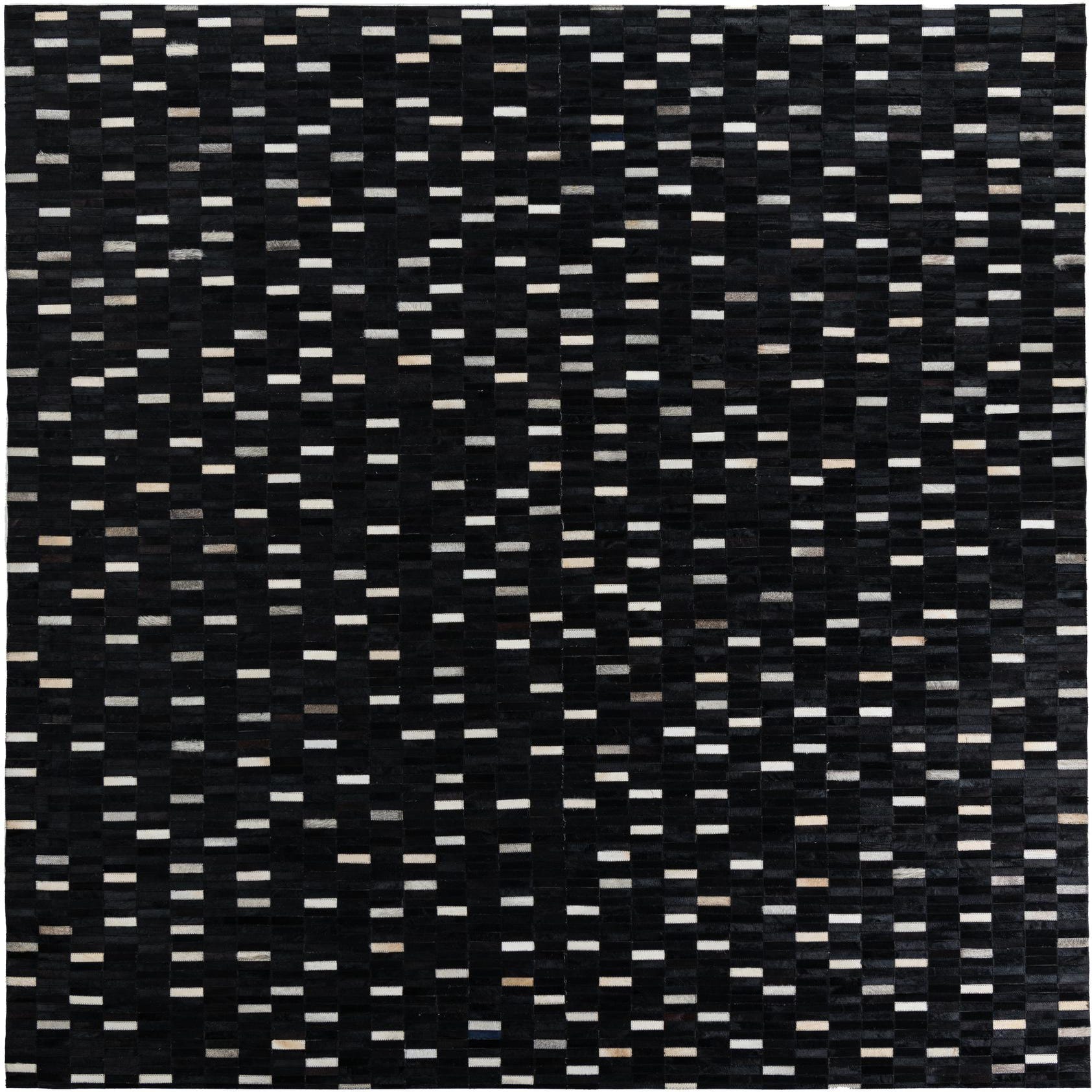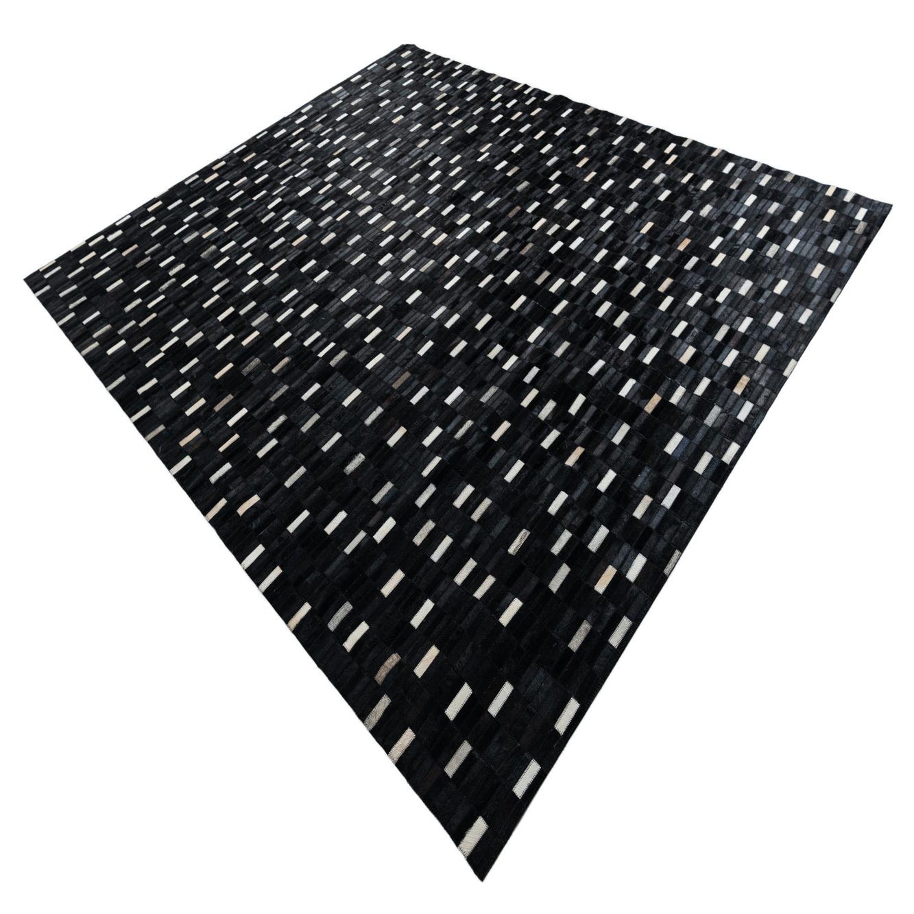 A rectangular 8x10 black cowhide rug with a modern stripe pattern featuring small white and grey rectangular patches.
