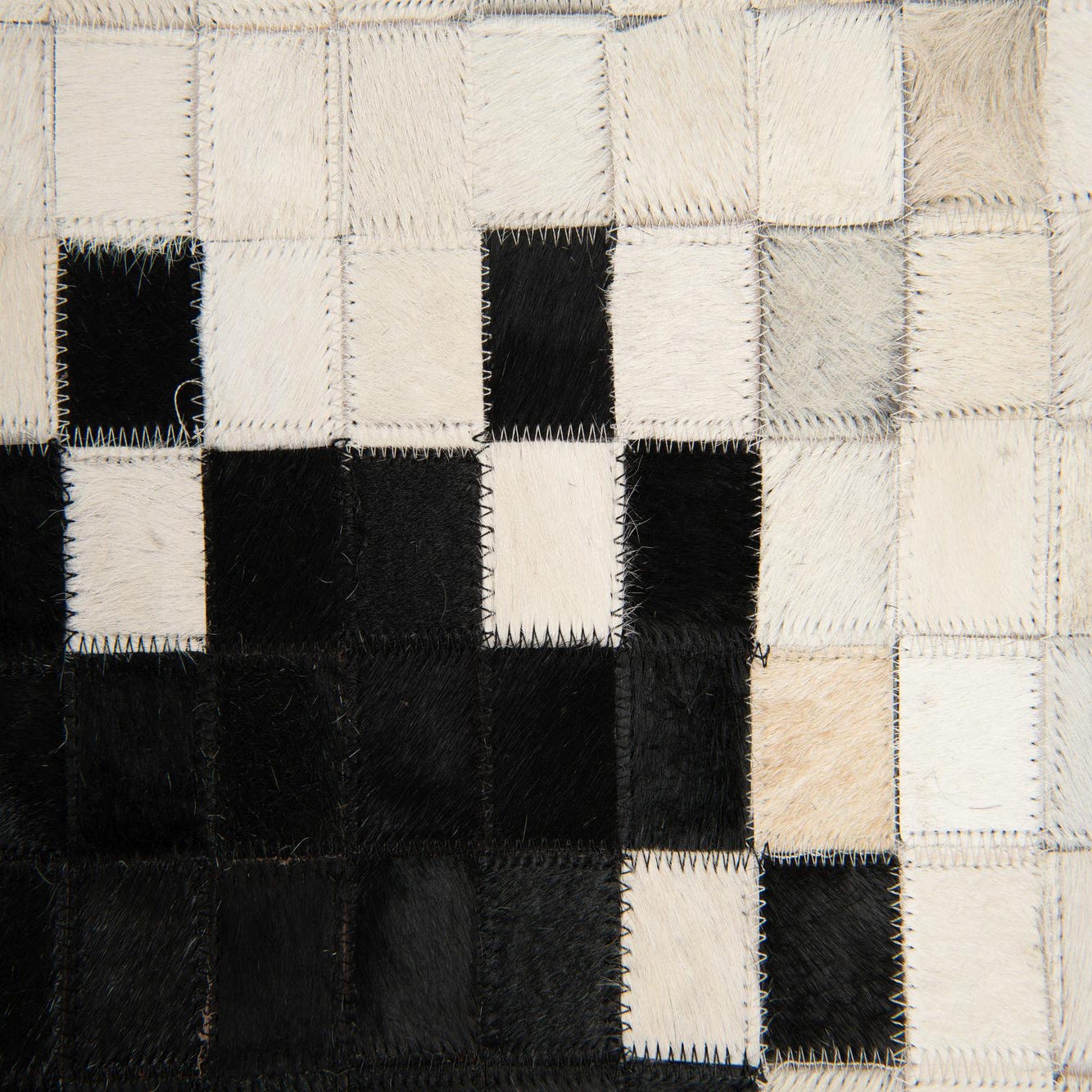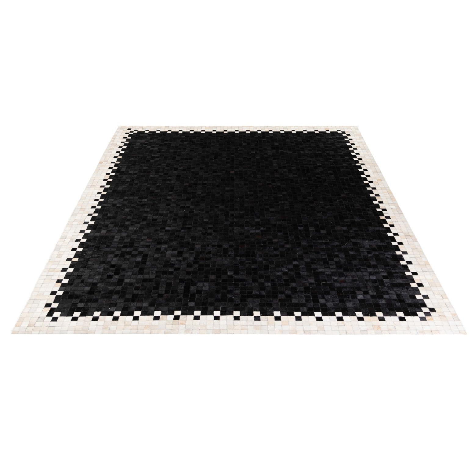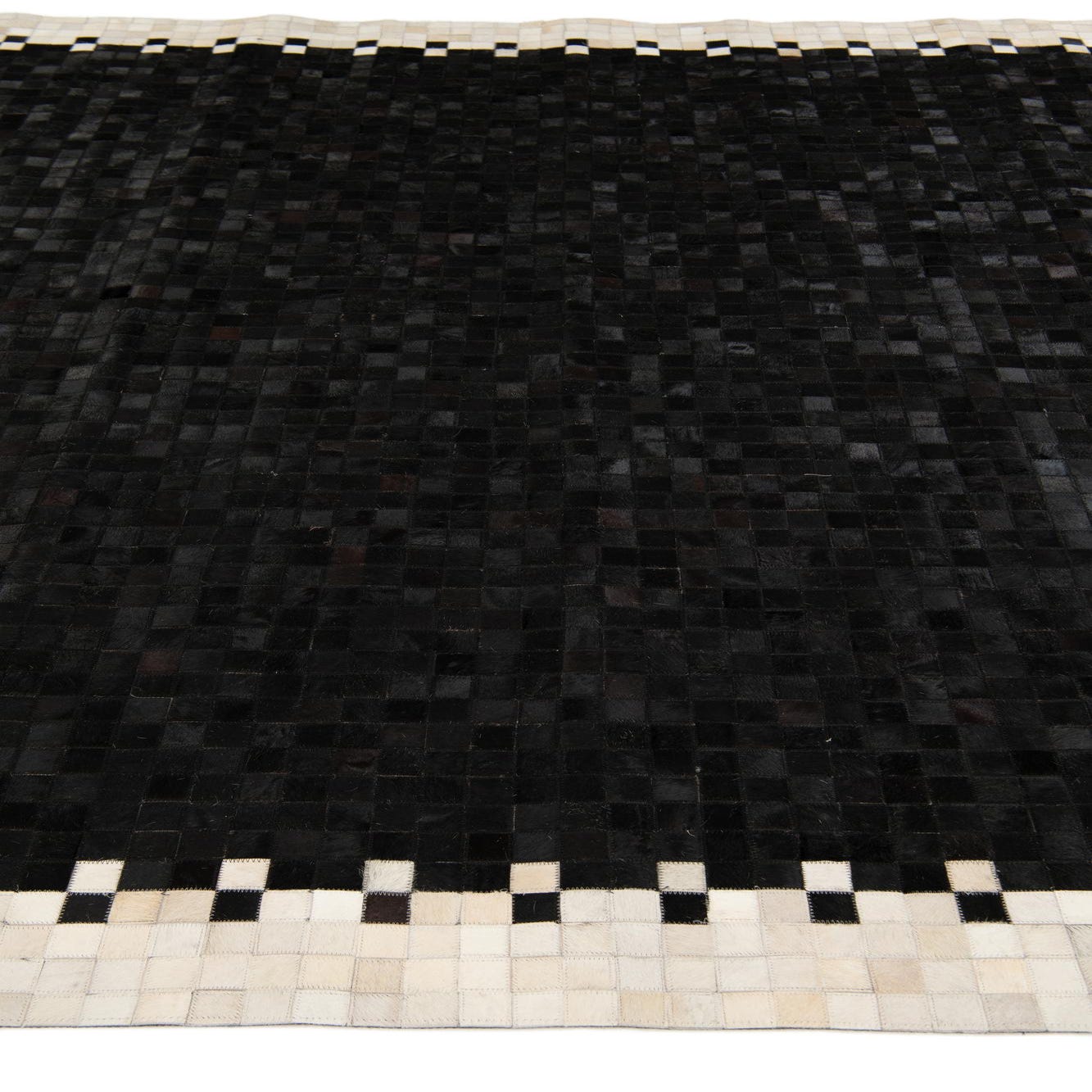 8x10 rectangular modern rug with a solid black cowhide center and a white and black checkered border.