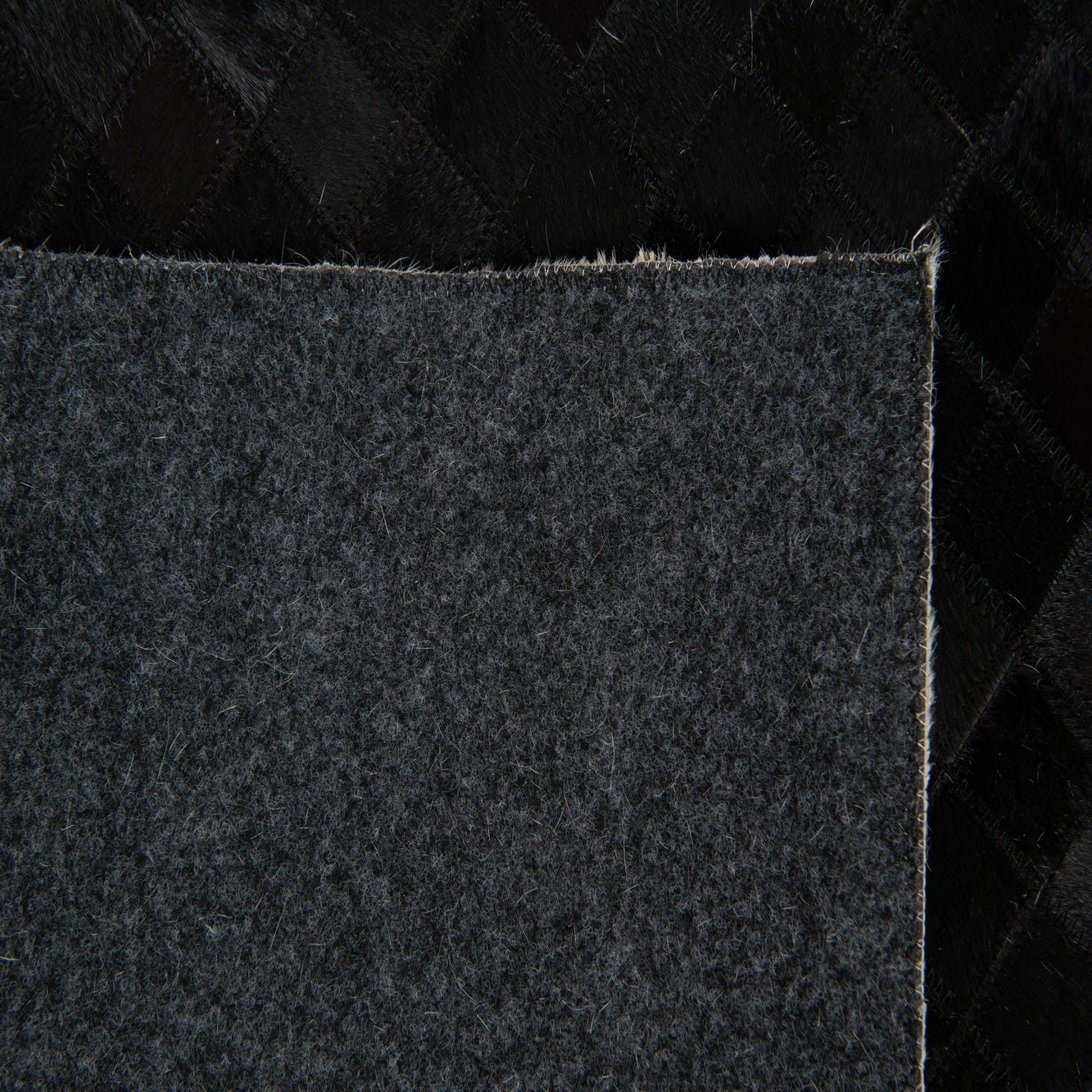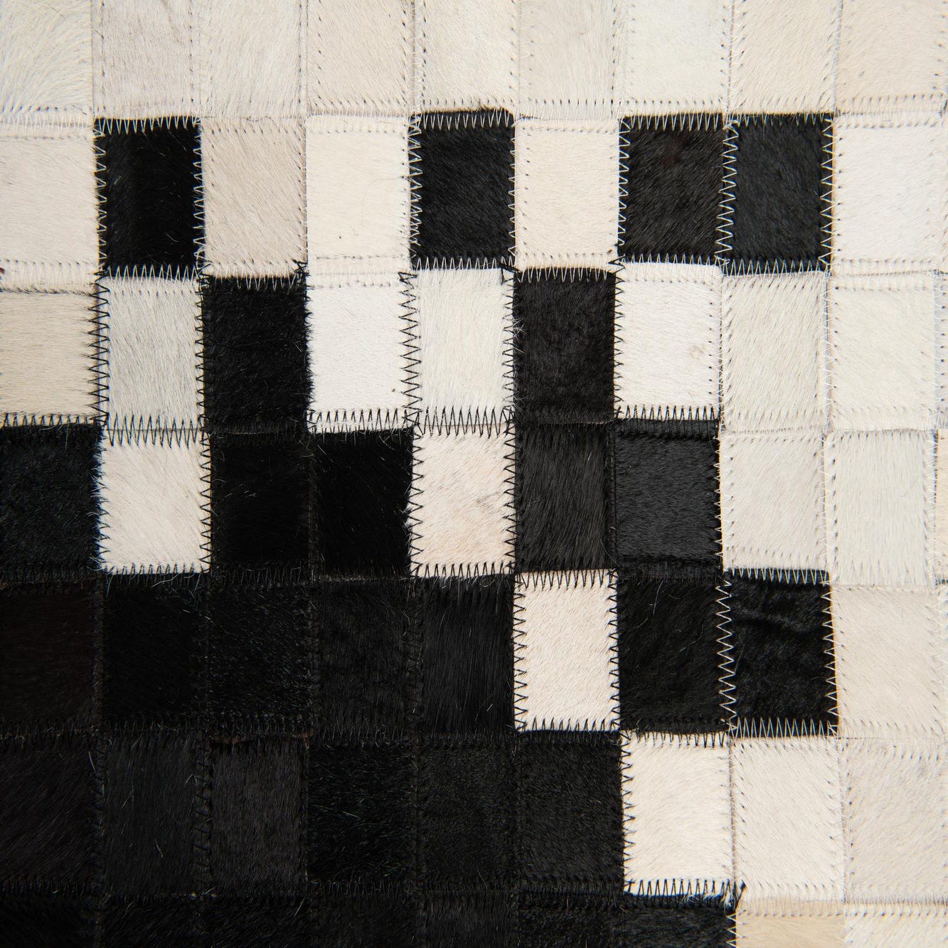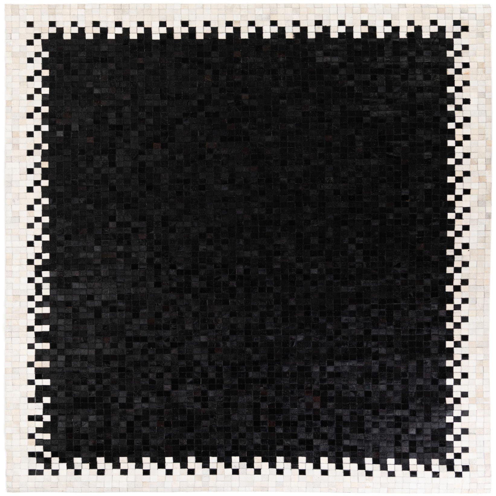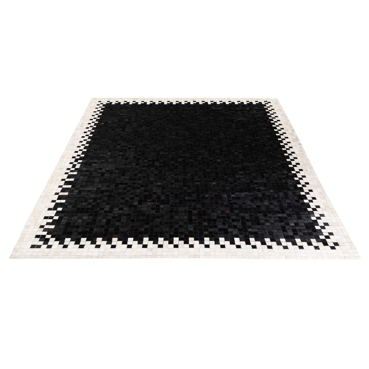 A rectangular 8x10 black patchwork cowhide rug with a white and black geometric border.
