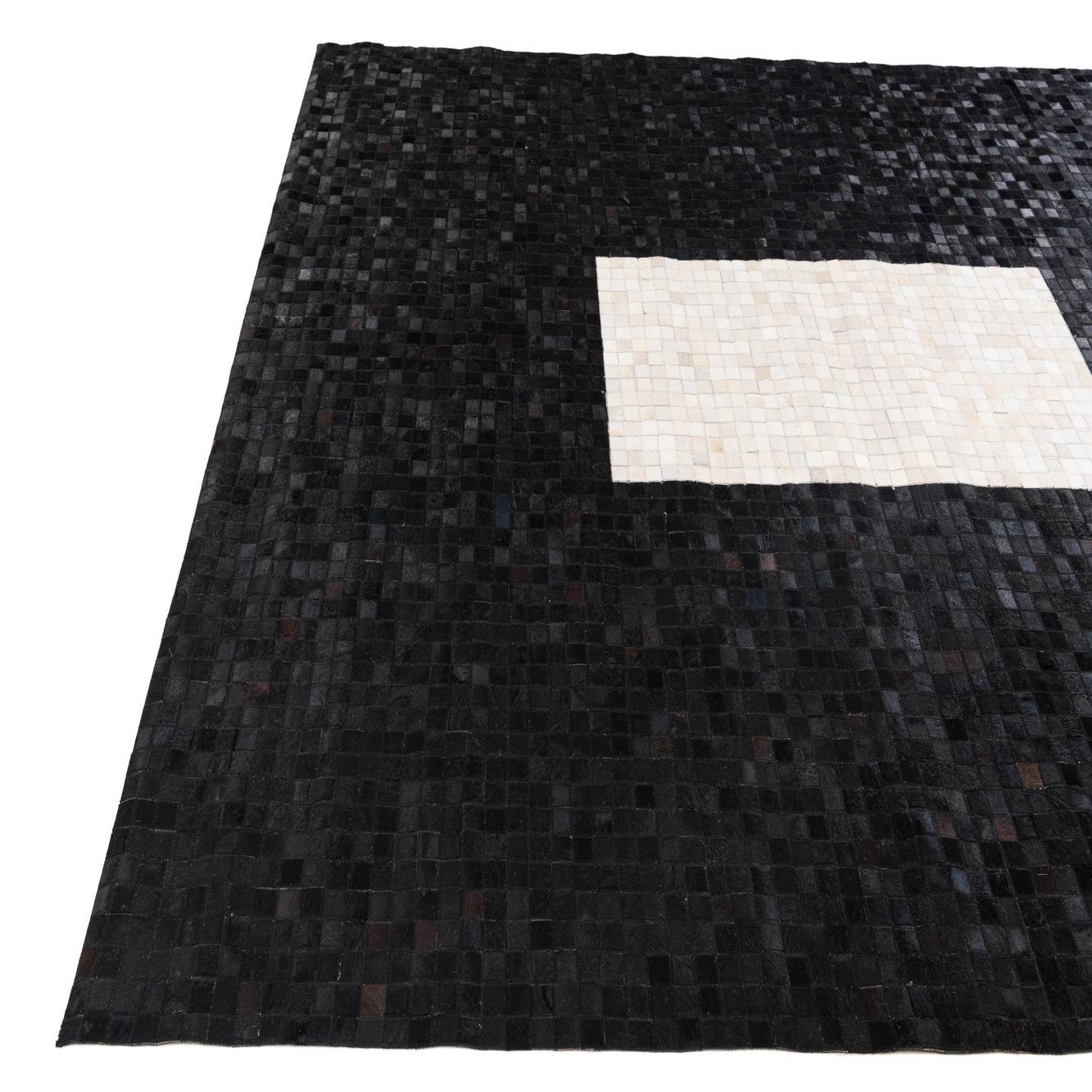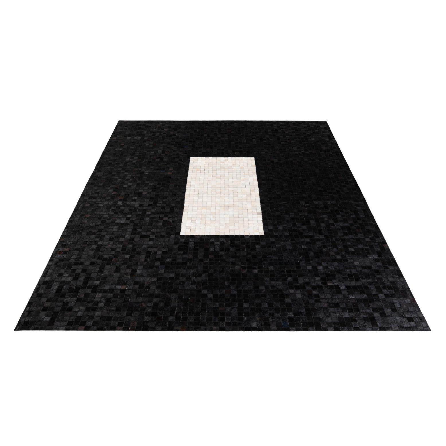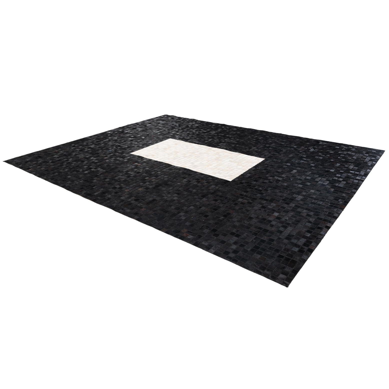 A modern 8x10 rectangular rug made of black and white cowhide squares, featuring a large white rectangle in the center.