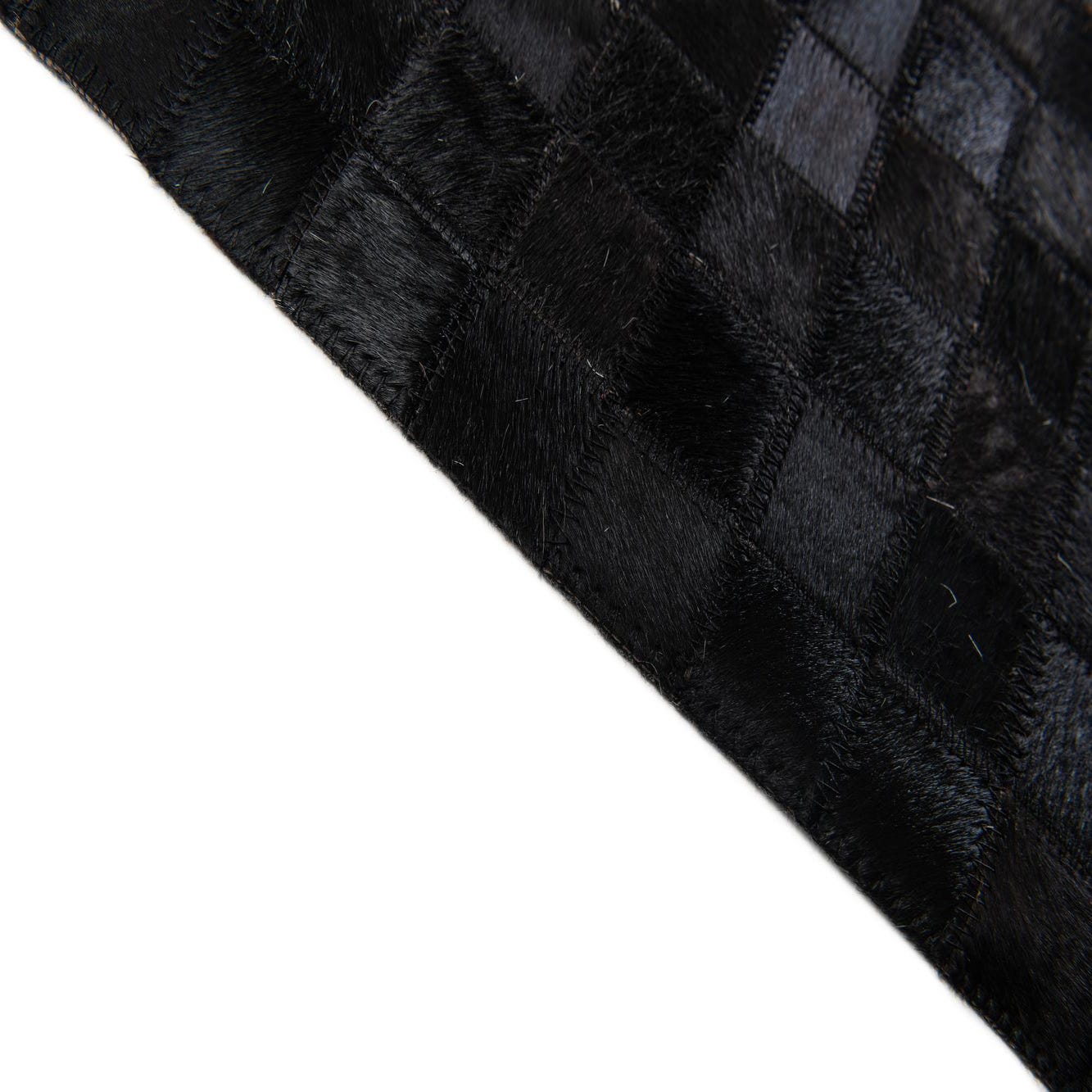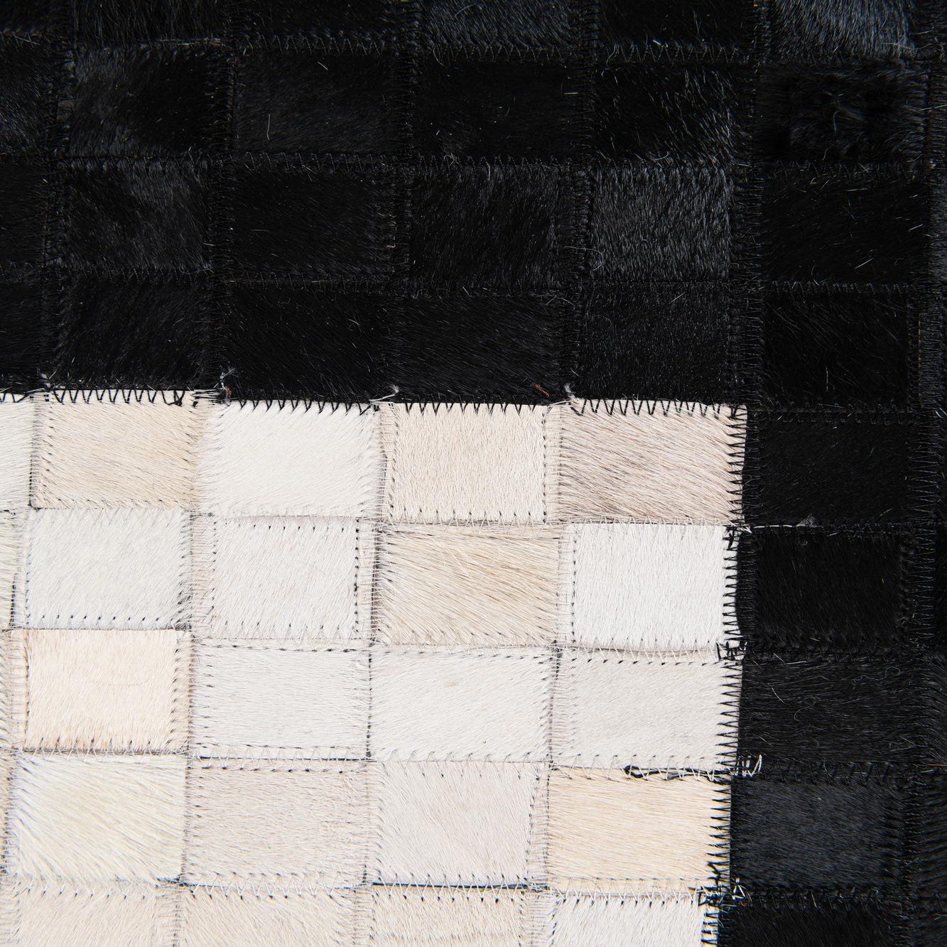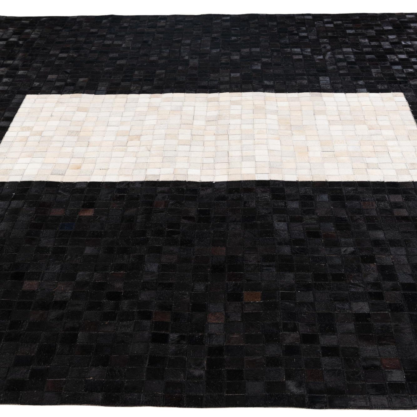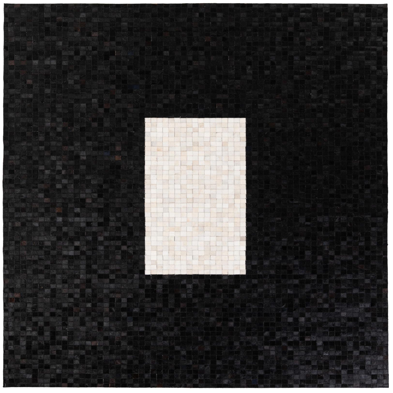 A modern 8x10 rectangular rug made of black and white cowhide squares, featuring a large white rectangle in the center.