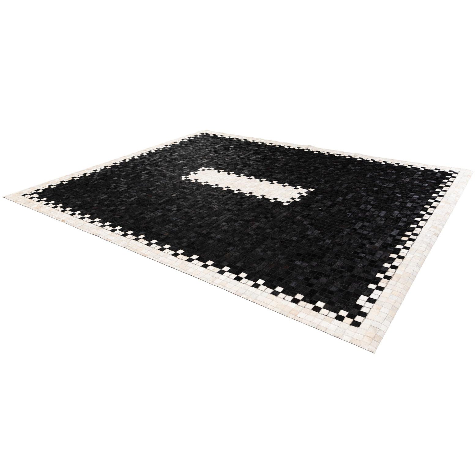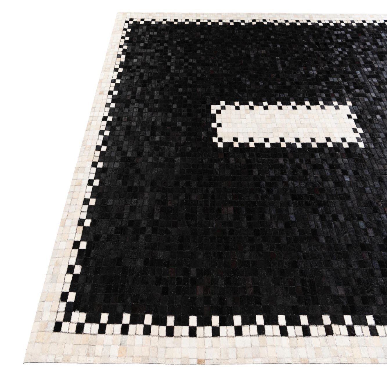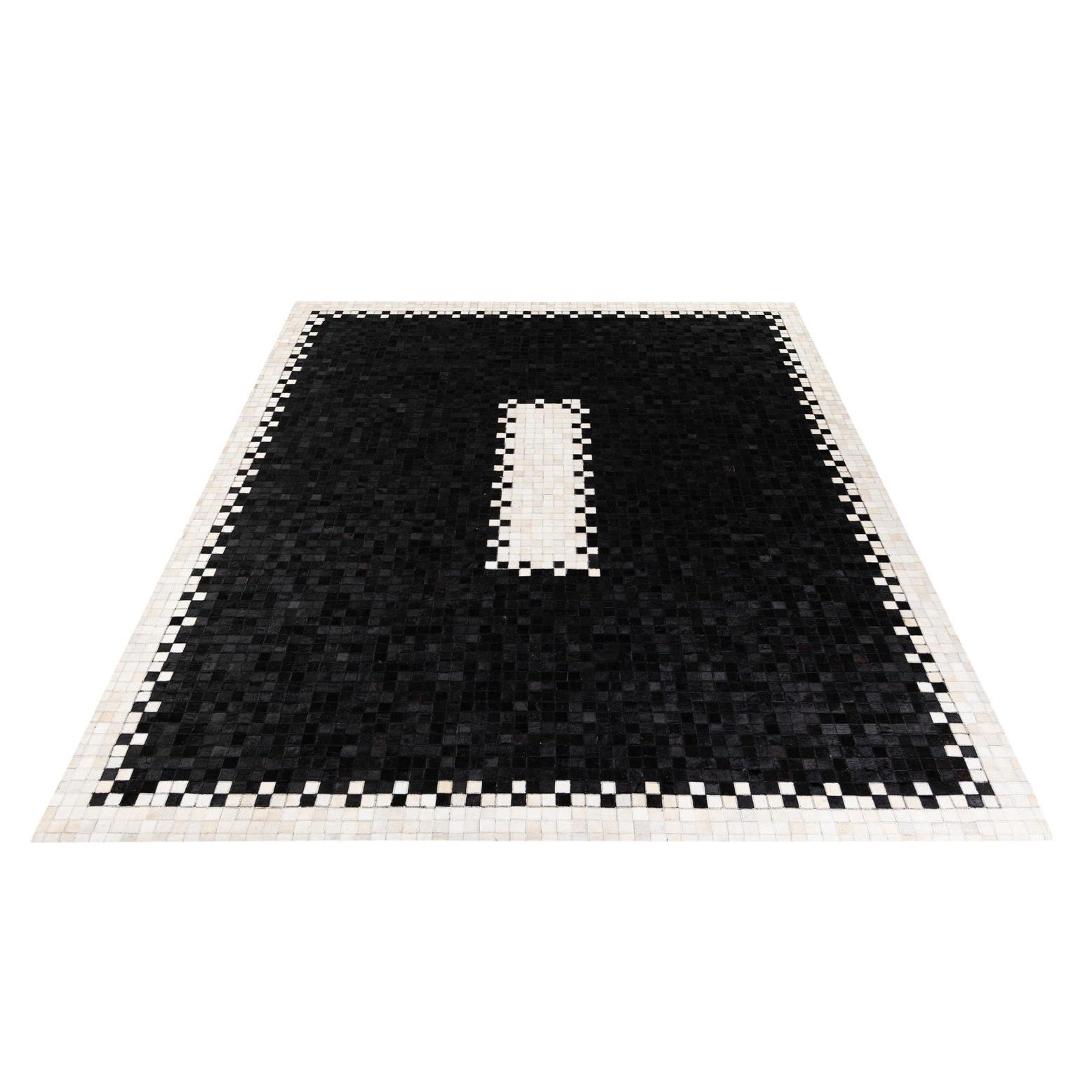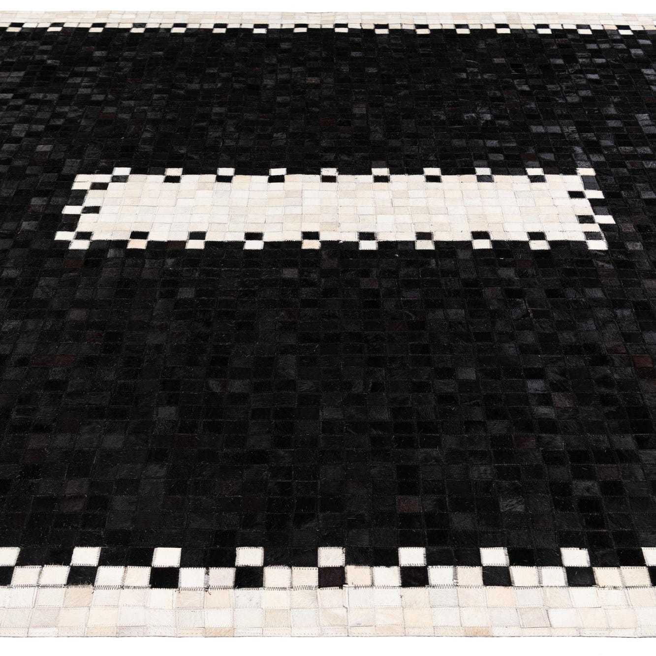 A modern 8x10 rectangular black cowhide rug with a white border and a central white rectangular accent, handmade for indoor spaces.