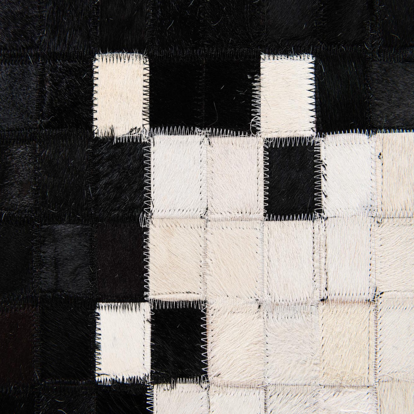 Hand made of cowhide and leather, this rug presents a bold, graphic look built from a grid of small, stitched hide squares. A deep black field forms the background while an ivory rectangular panel anchors the center, its edges scalloped with a tight black-and-ivory checker motif that echoes the stepped check border running around the rug. Subtle tan and ivory tones within the light patches add a soft warmth against the dominant black, and the handmade patchwork gives the surface a gentle variation in nap and sheen—smooth leather edges meet the velvety hair of the hide for a tactile, dimensional feel underfoot.
