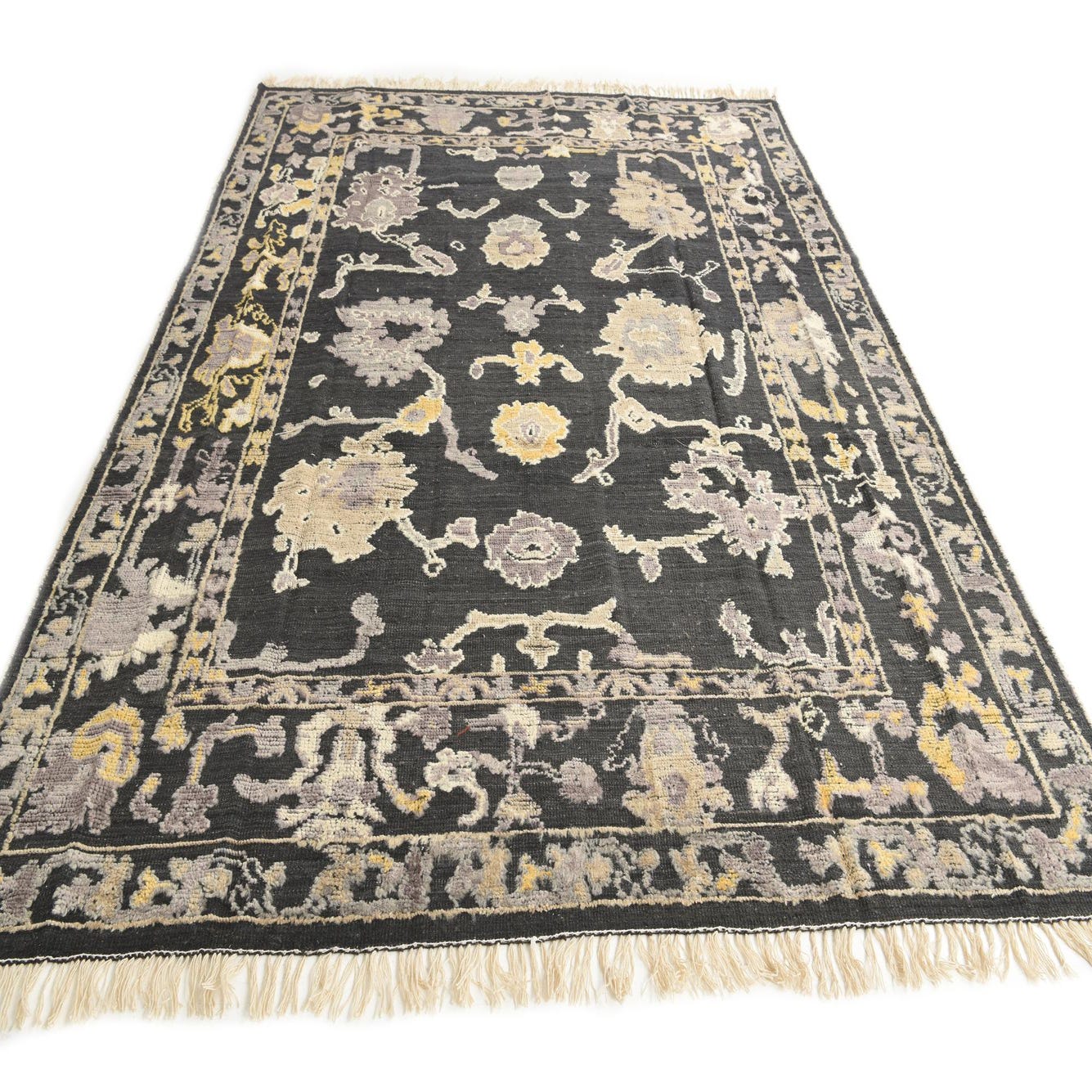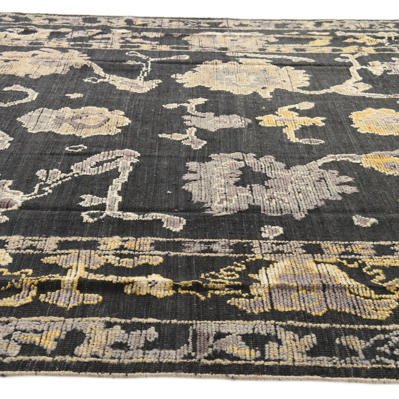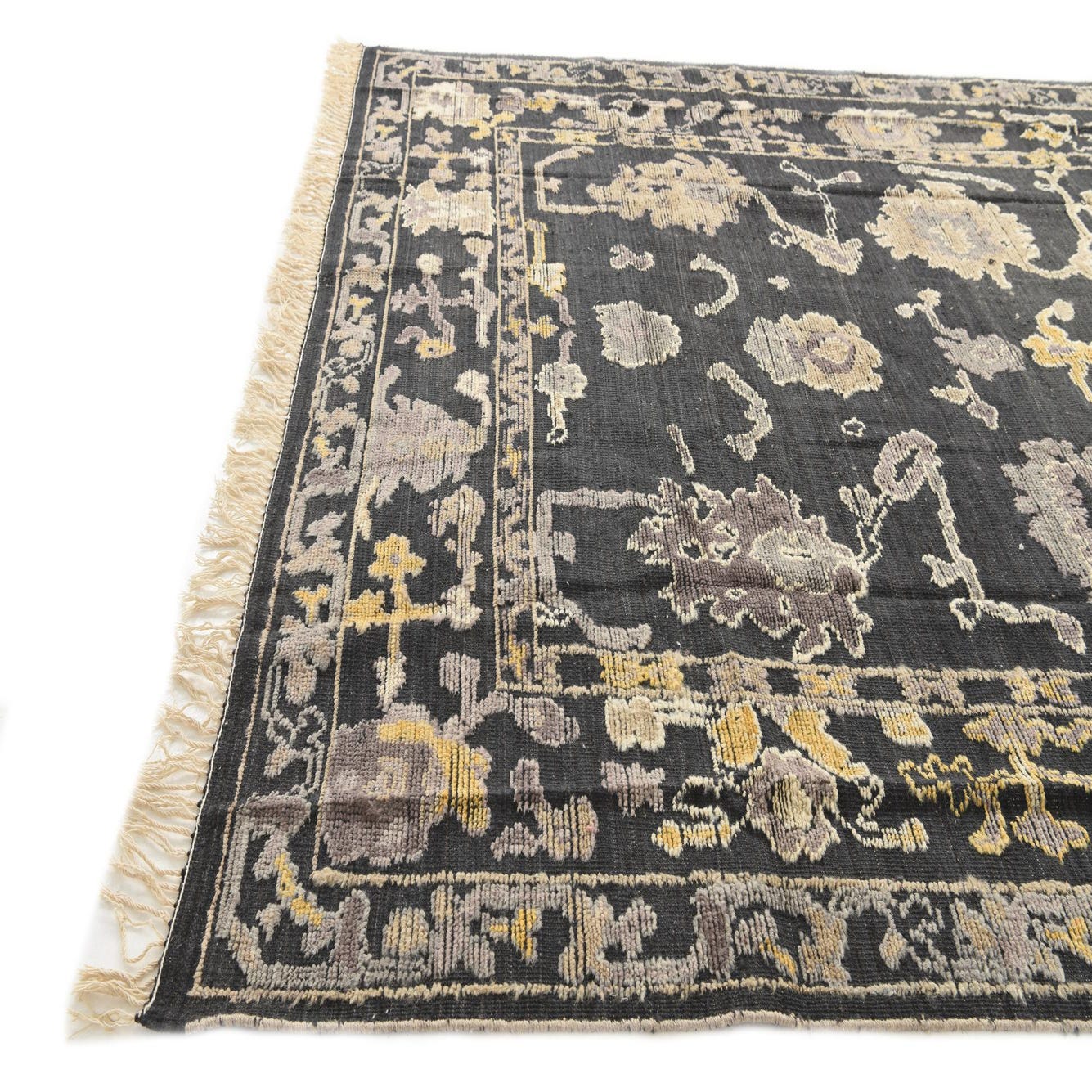 The Darya rug is a hand-knotted 8x10 piece that boasts a sophisticated balance of tradition and modernity. Crafted from 100% wool, the rug exhibits a robust black background that anchors the intricate pattern work highlighted in shades of ivory, yellow, and light brown. The design displays a classic array of ornamental motifs, combining florals and geometrics that bring both an old-world charm and a contemporary elegance to the piece.