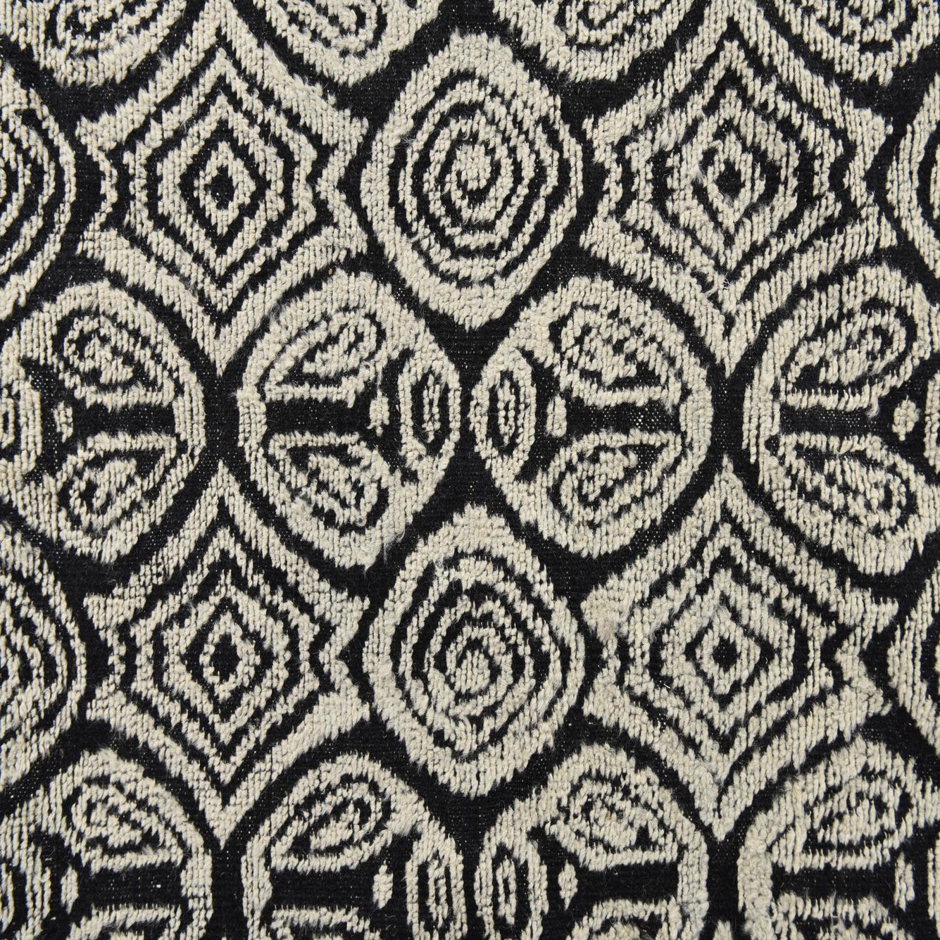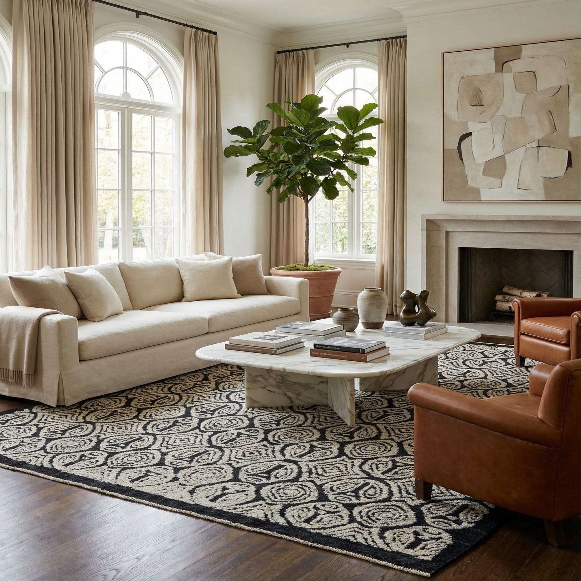 This rug pairs well with clean-lined, contemporary furniture—place it beneath a sofa and coffee table to ground a living area and introduce graphic contrast. It also fits a monochrome or minimalist scheme when layered under light-wood or metal pieces, and it can add pattern and depth to a home office or dining room with neutral upholstery. For an eclectic interior, combine it with warm woods, textured linens, and brass accents to balance the bold black-and-ivory palette.