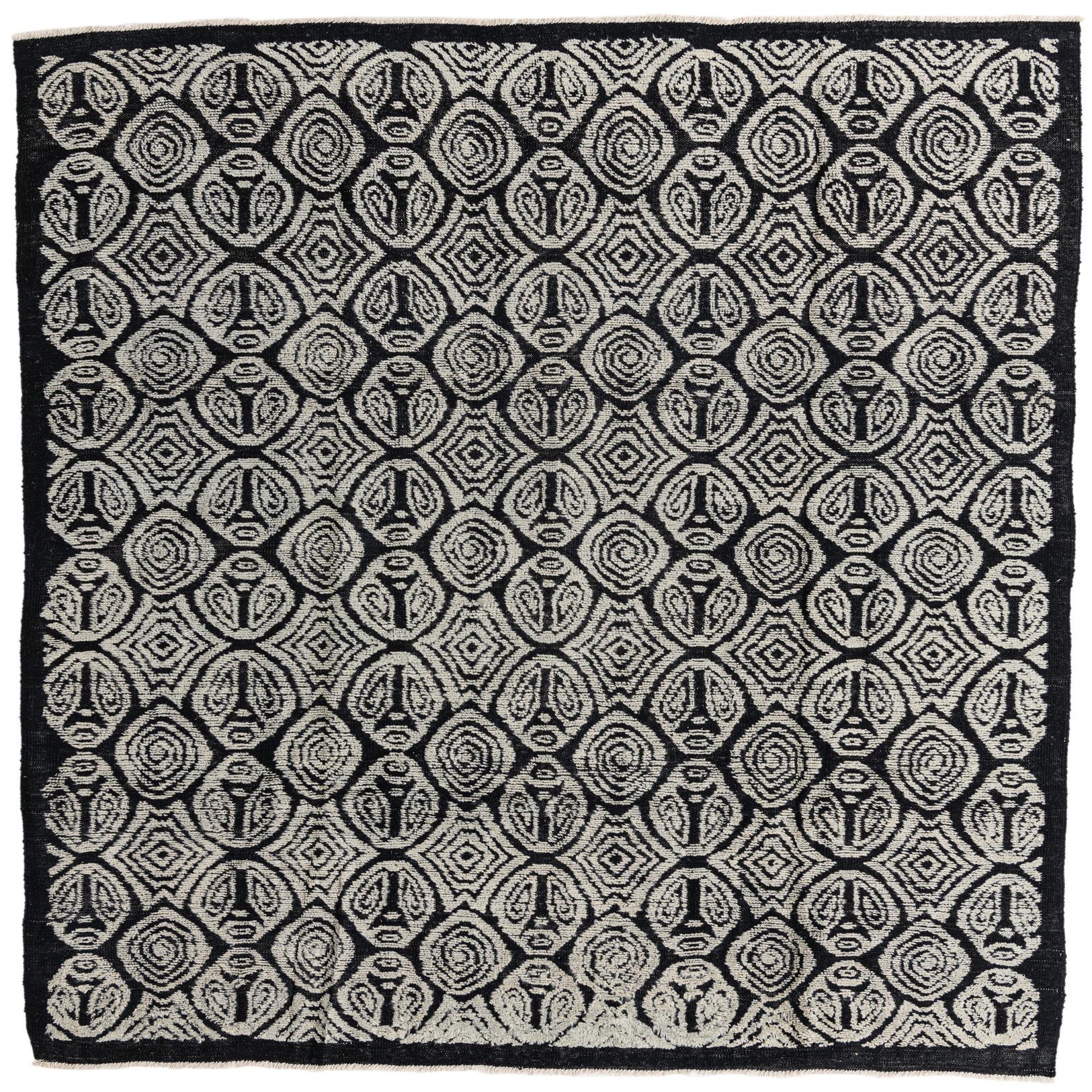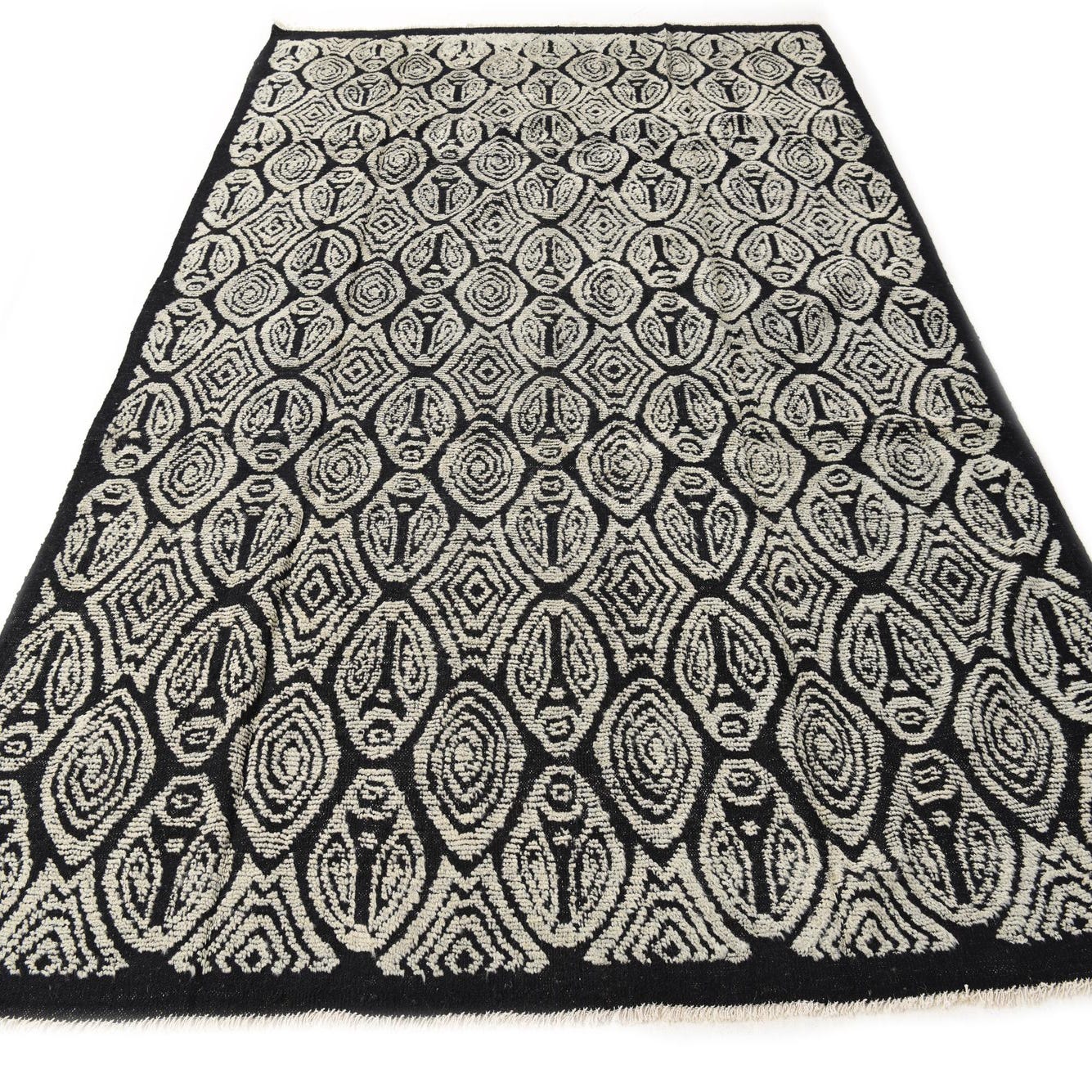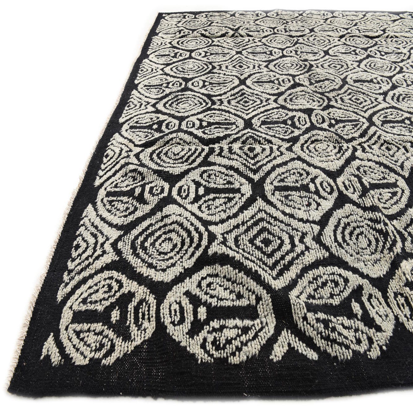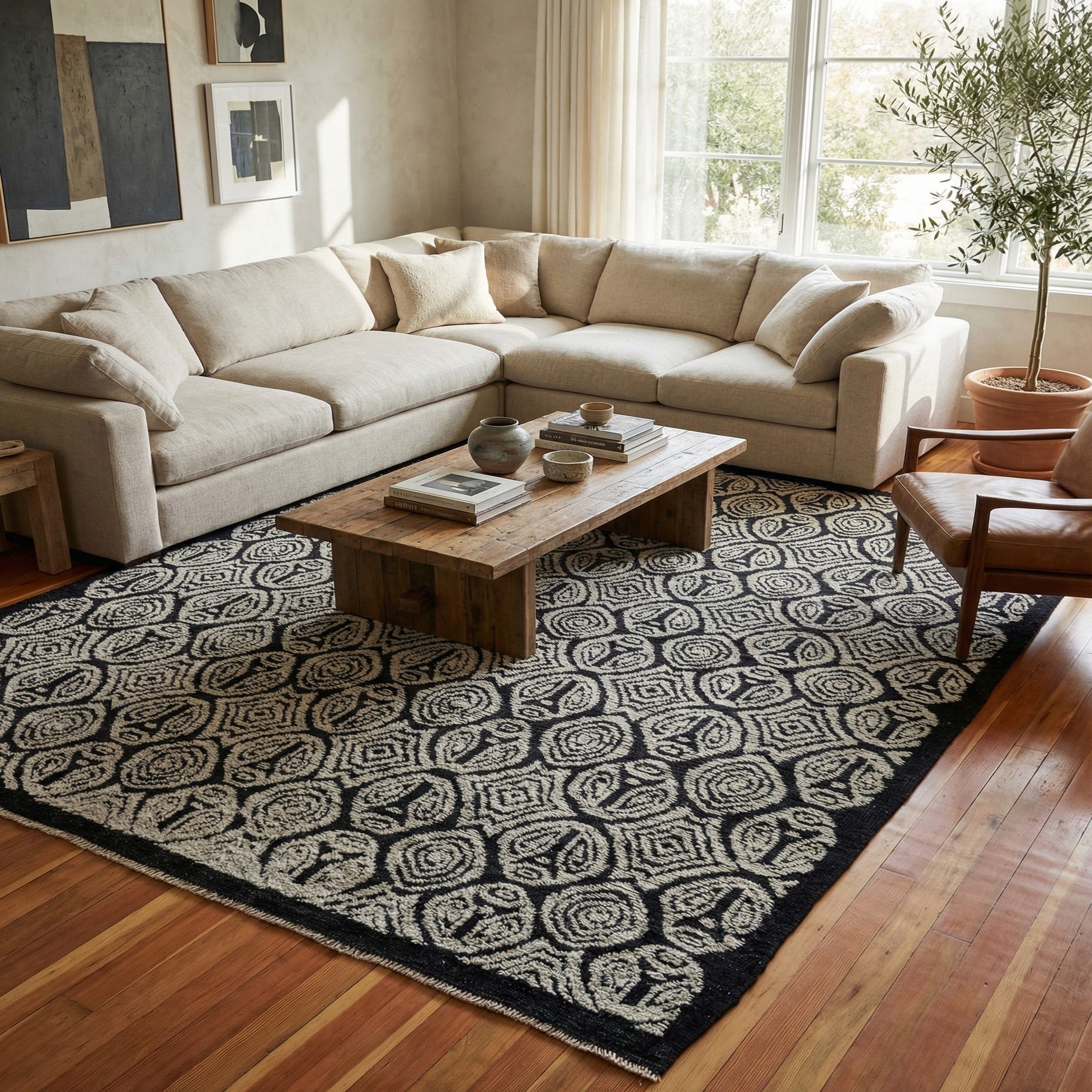 Hand-knotted from 100% wool, this rug presents a tightly ordered field of ivory medallions and concentric rings set against a deep black ground. The repeating oval motifs sit in a grid punctuated by small diamond accents, creating a structured, geometric rhythm that reads modern while nodding to traditional weaving techniques. Running your hand across the surface, you feel a subtle relief where the ivory knots lift slightly above the black pile, giving the rug a tactile, low-to-medium pile texture with a pleasant, natural wool softness.