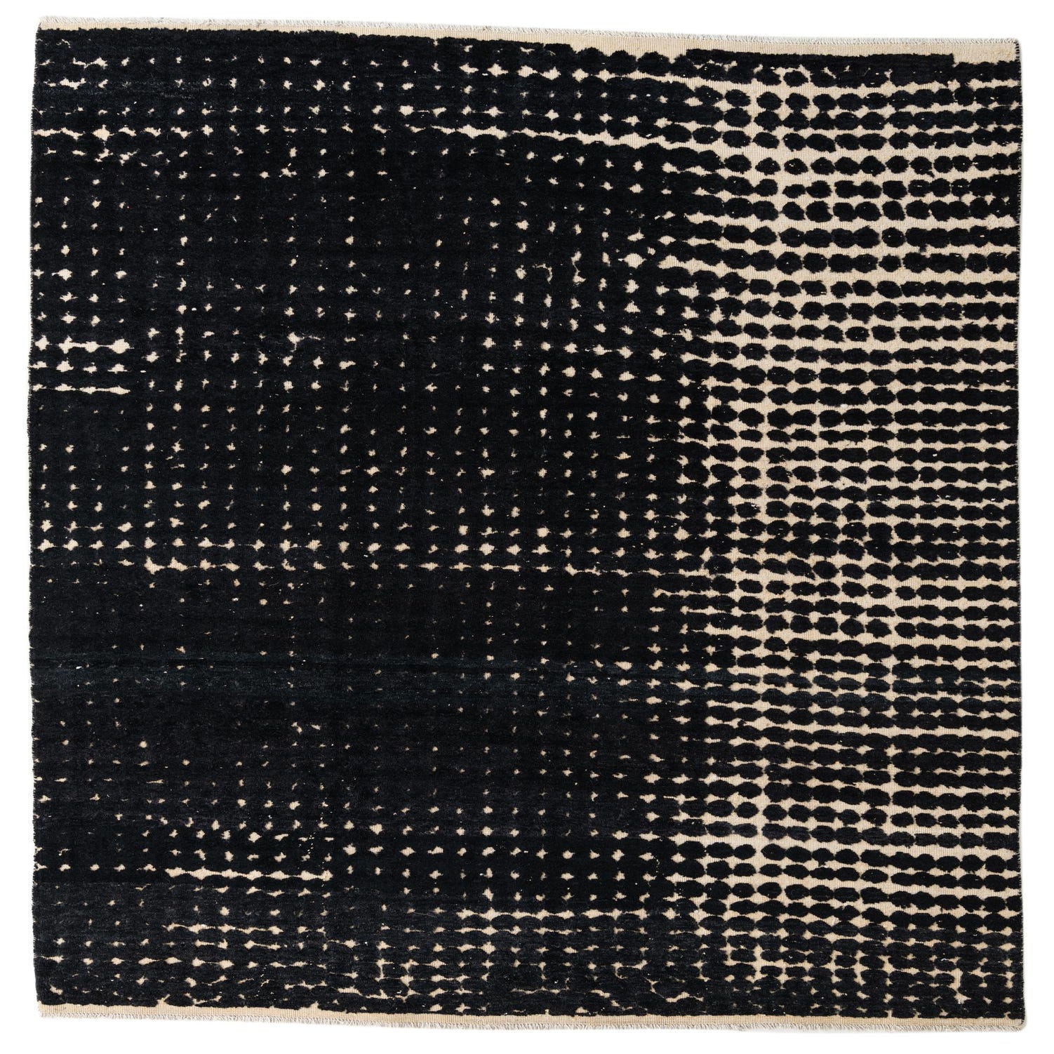 A rectangular 8x10 black and beige modern abstract wool area rug with a high pile, featuring a pixelated dot pattern.