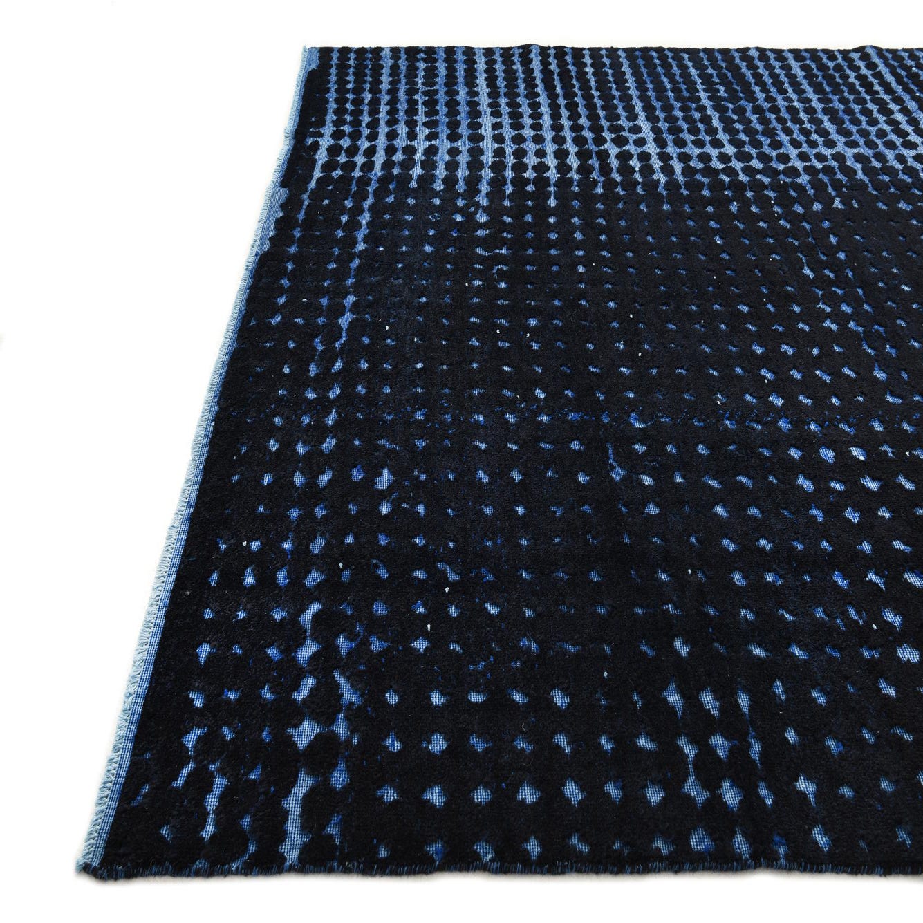 A rectangular 8x10 Darya rug in black and blue, featuring a modern abstract pattern with varying density of blue dots on a black background.