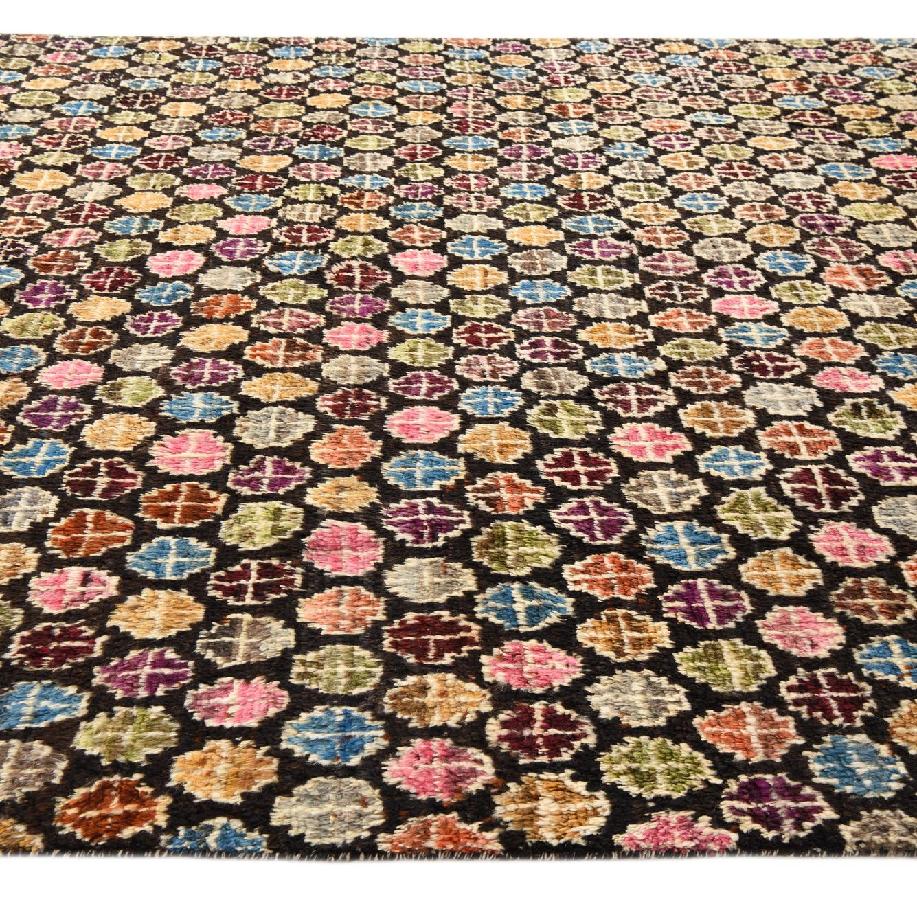 8x10 rectangular Darya rug with a black background and a repeating pattern of colorful, abstract, flower-like motifs in various hues.