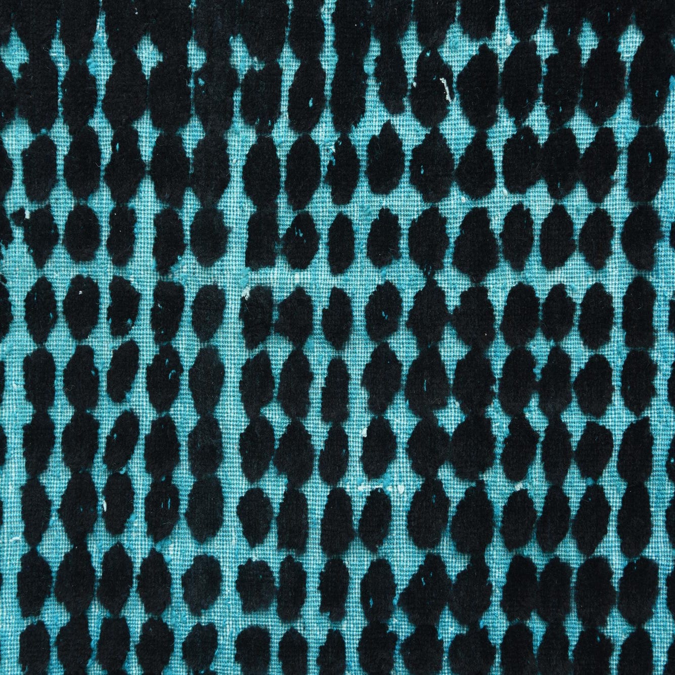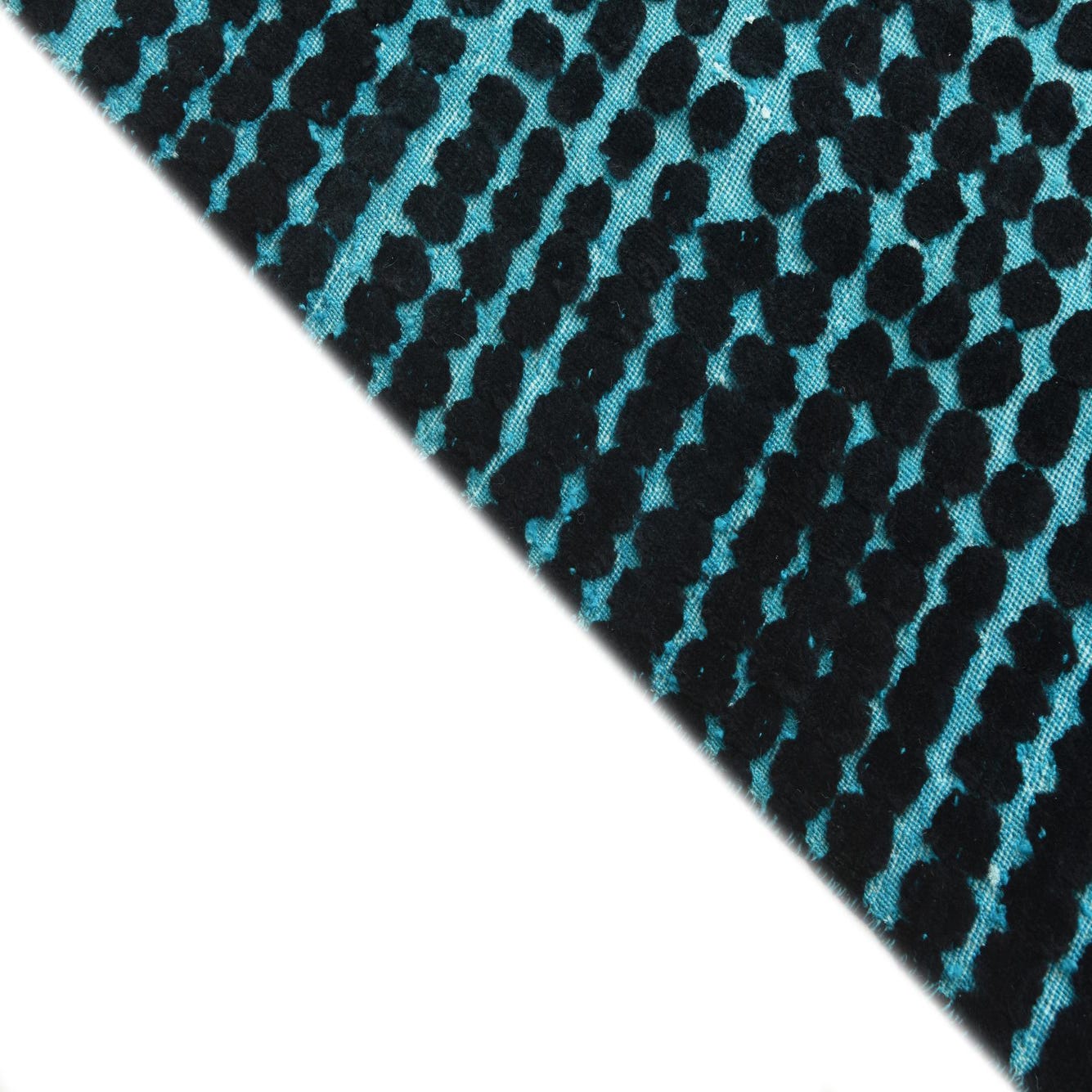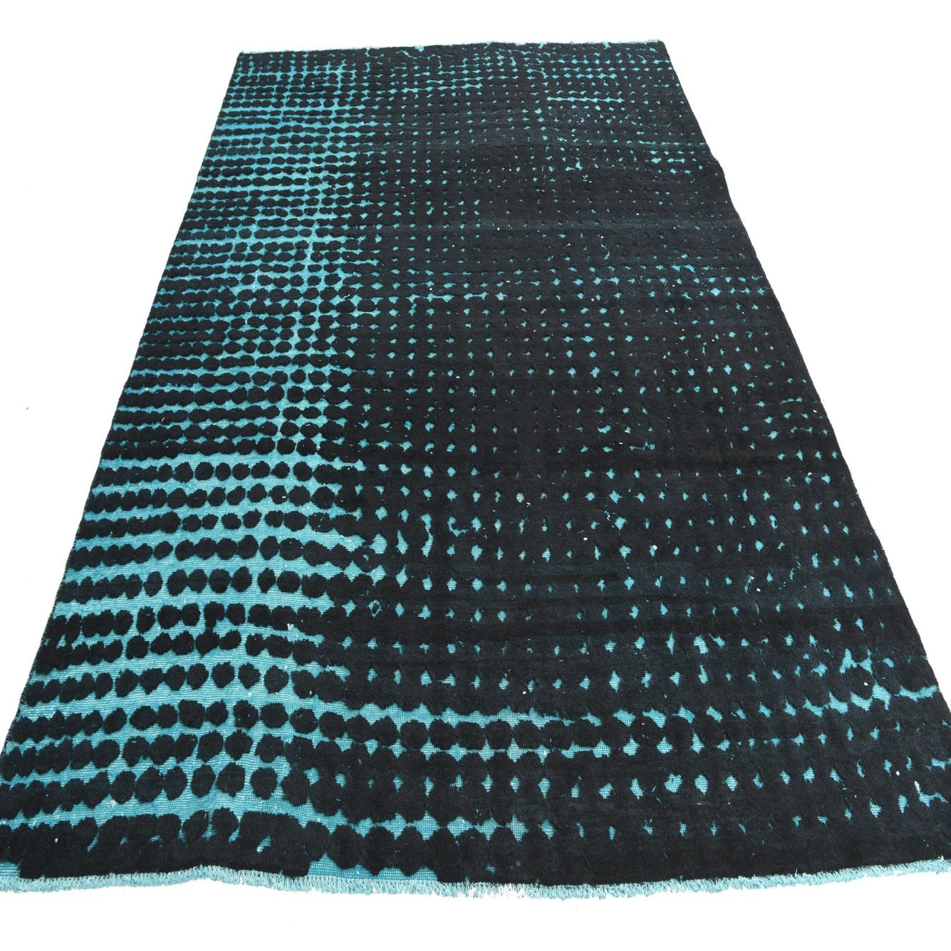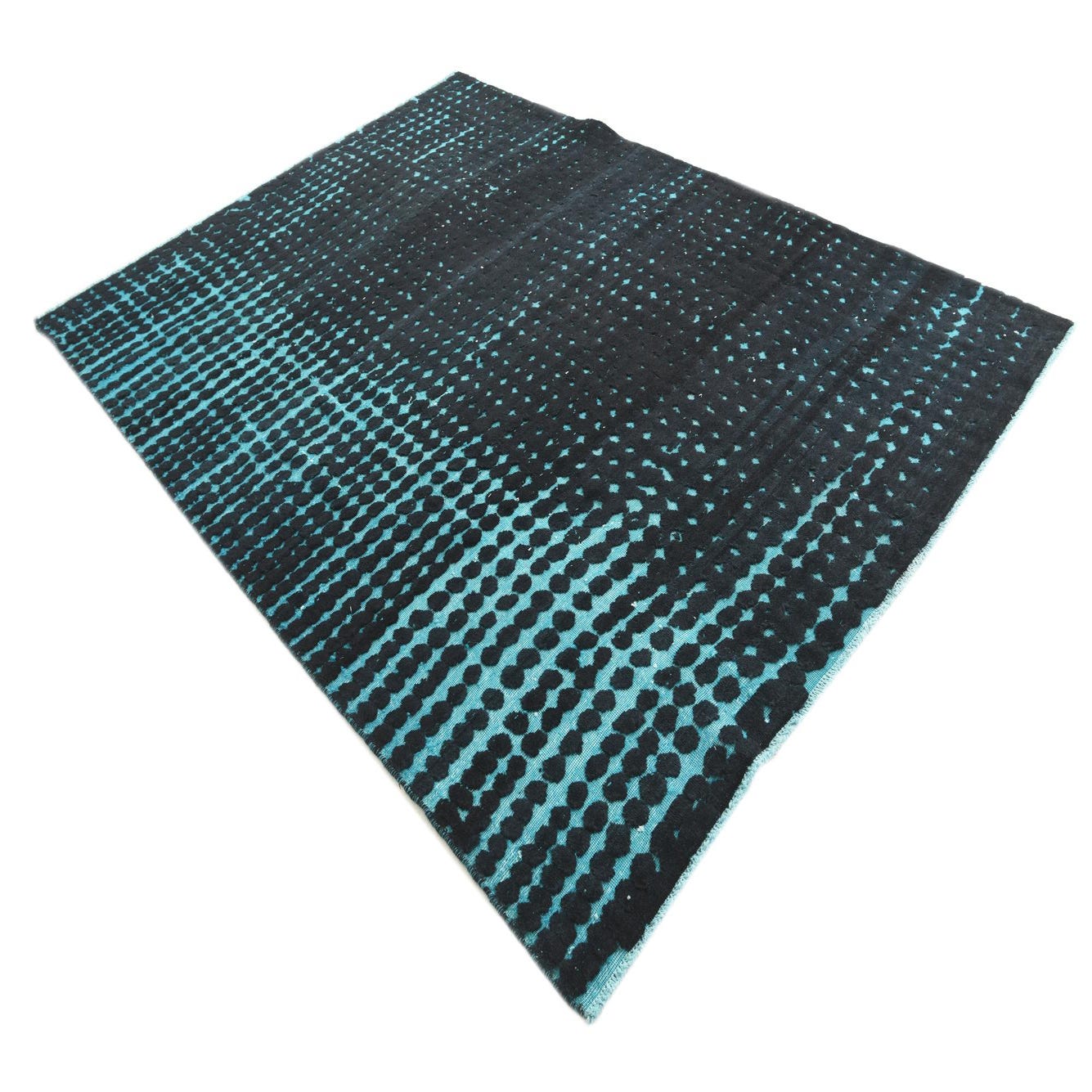 A rectangular 8x10 black and teal modern abstract wool rug with a high pile, featuring a pixelated dot pattern.