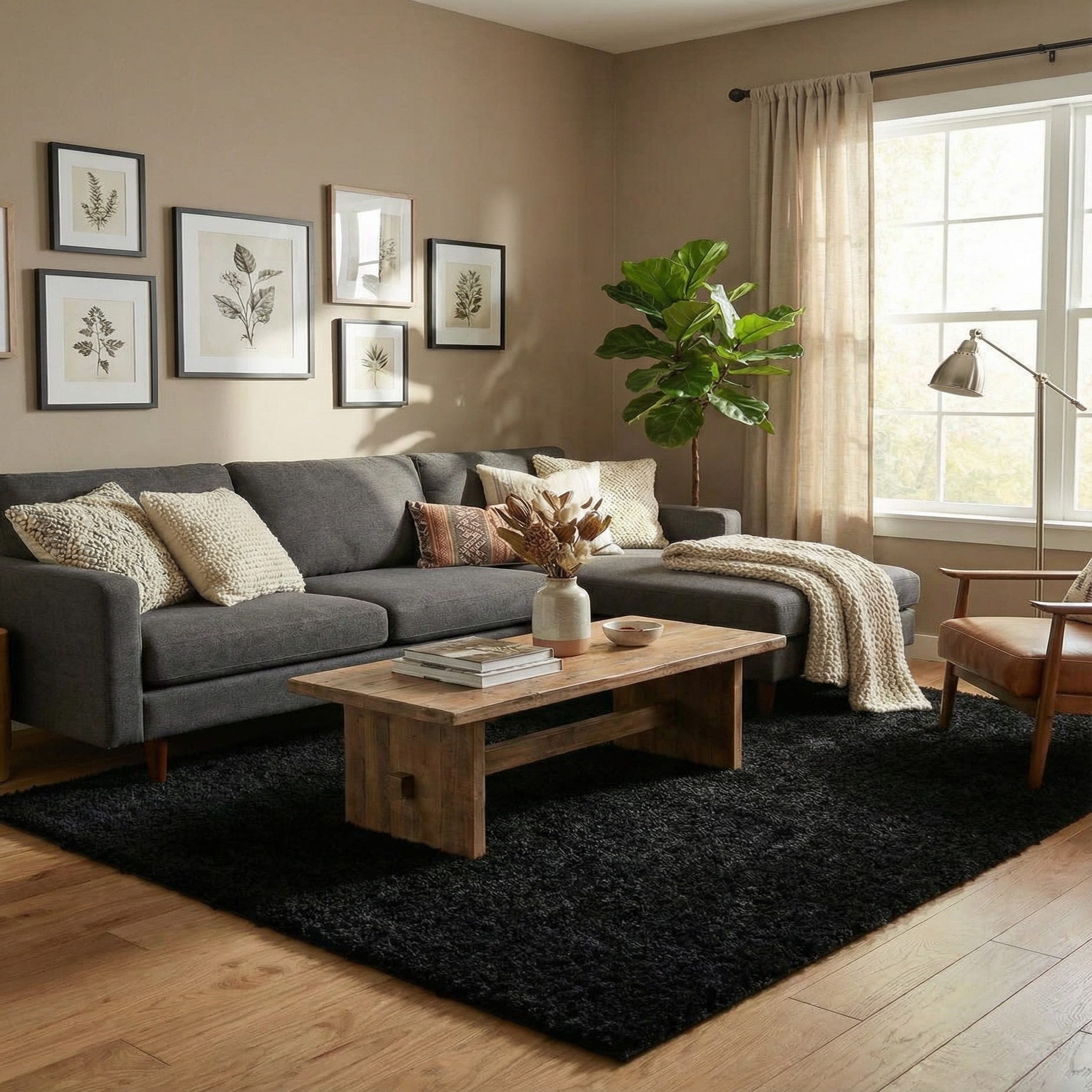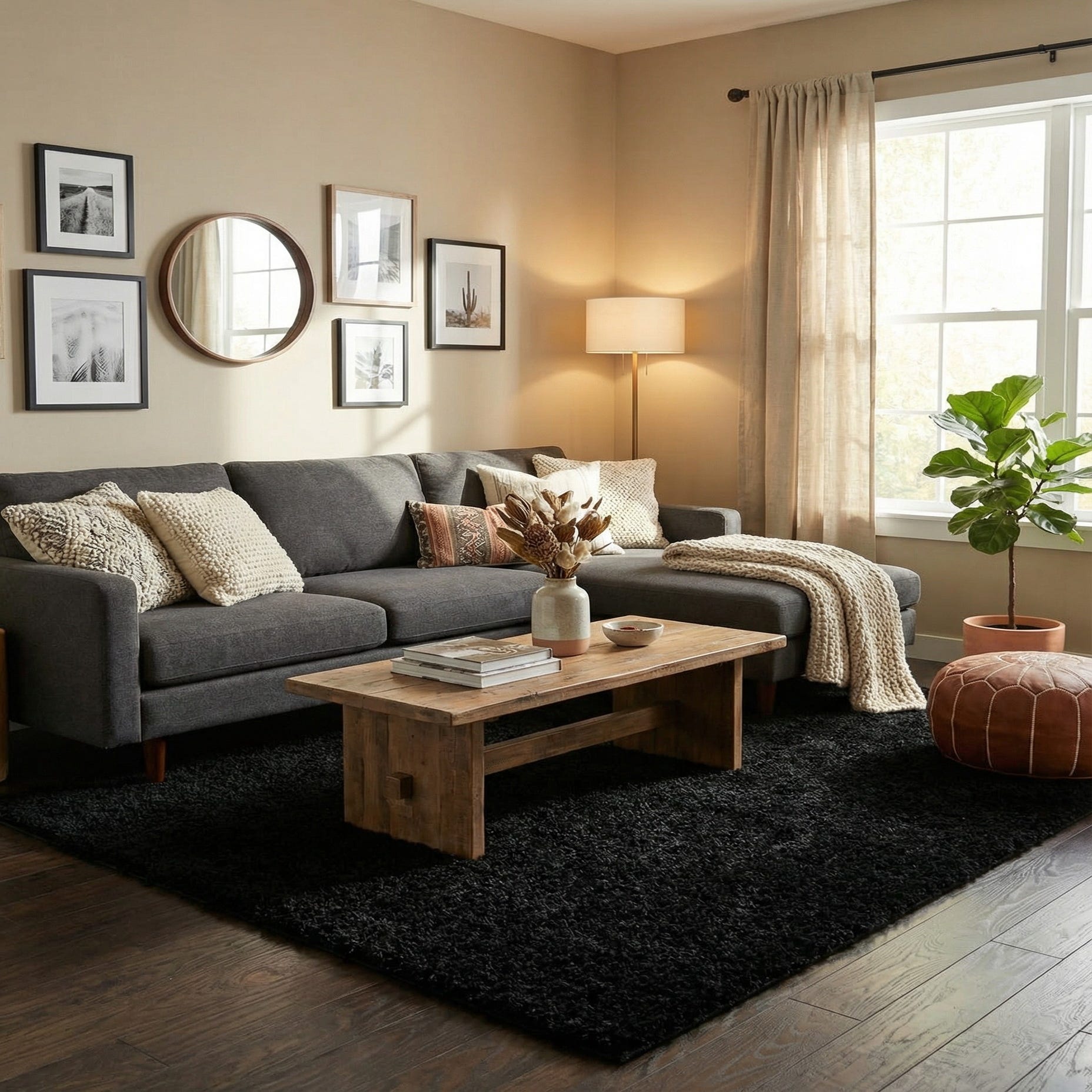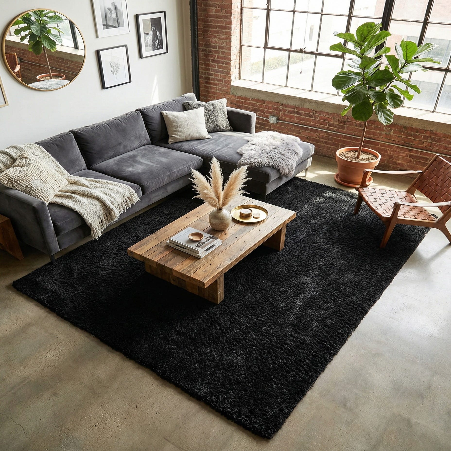 This rug works well where grounded contrast or a soft foundation is needed: place it beneath a low-profile sofa in a contemporary living room, use it to add depth and comfort to a bedroom, or anchor a media area where a dark field minimizes reflection. It pairs effortlessly with neutral linens, bold accent pillows, or industrial metal and wood finishes, and it also layers nicely over hardwood or tile to soften the space.