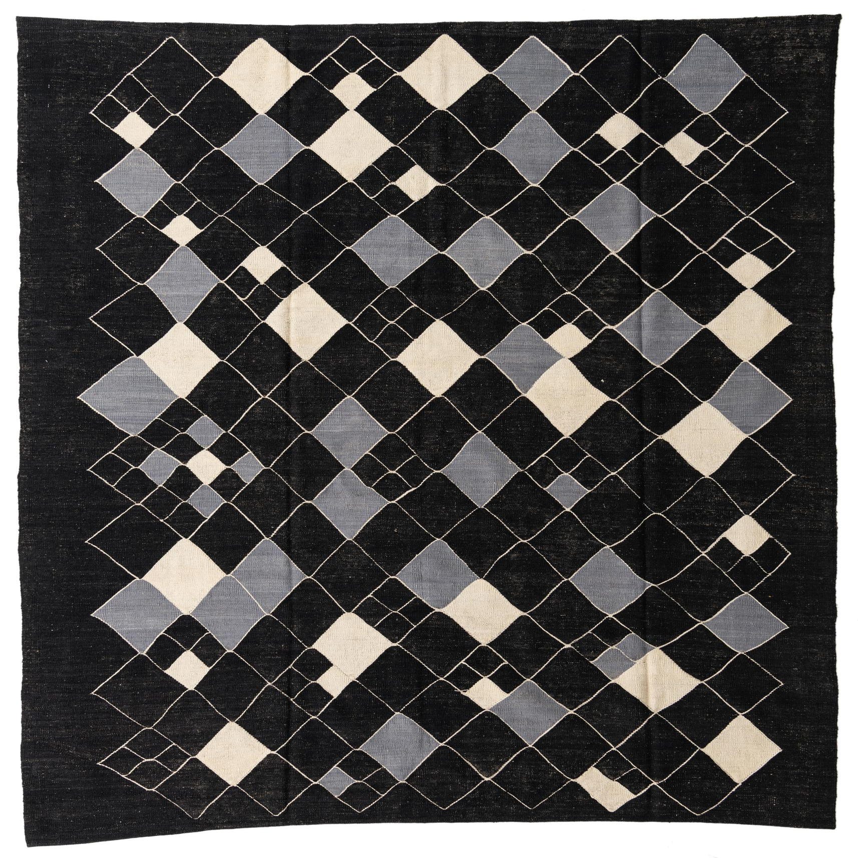 The Kilim Modern Collection presents a sophisticated hand-woven 8x10 rug crafted from 100% wool, ensuring durability and a soft texture underfoot. The pattern of this rug showcases a geometric diamond design, creating a dynamic visual effect that can anchor a room with its bold lines and angles. A stark black background provides a dramatic canvas for the contrasting diamond motifs in hues of ivory and gray, articulated with precise lines that add depth and dimension.