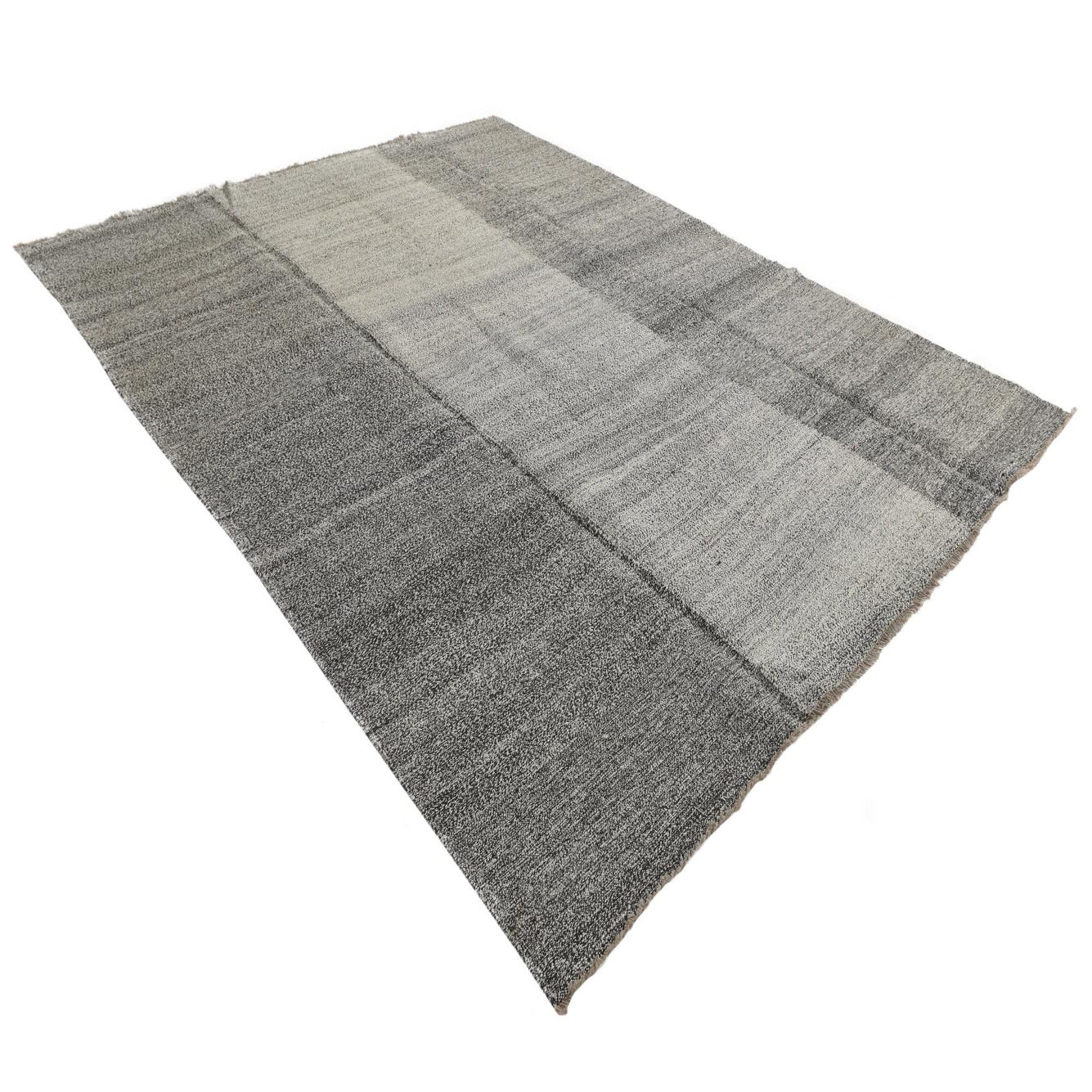 A rectangular 8x10 Kilim Modern wool rug featuring a striking abstract pattern of varying black and gray shades.