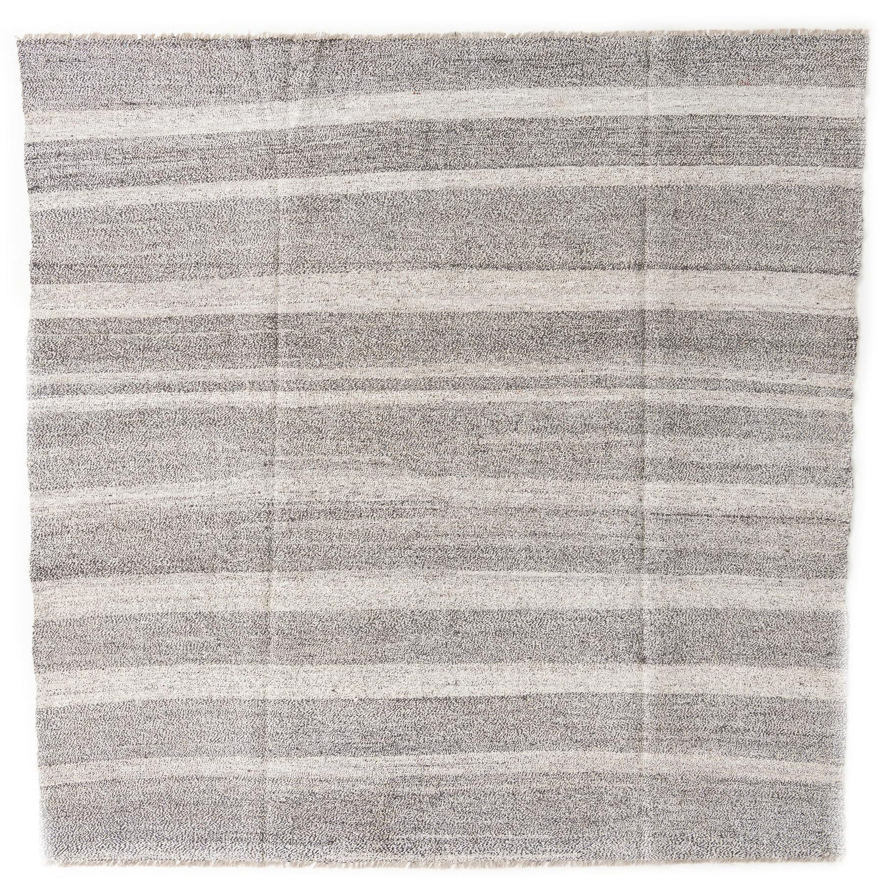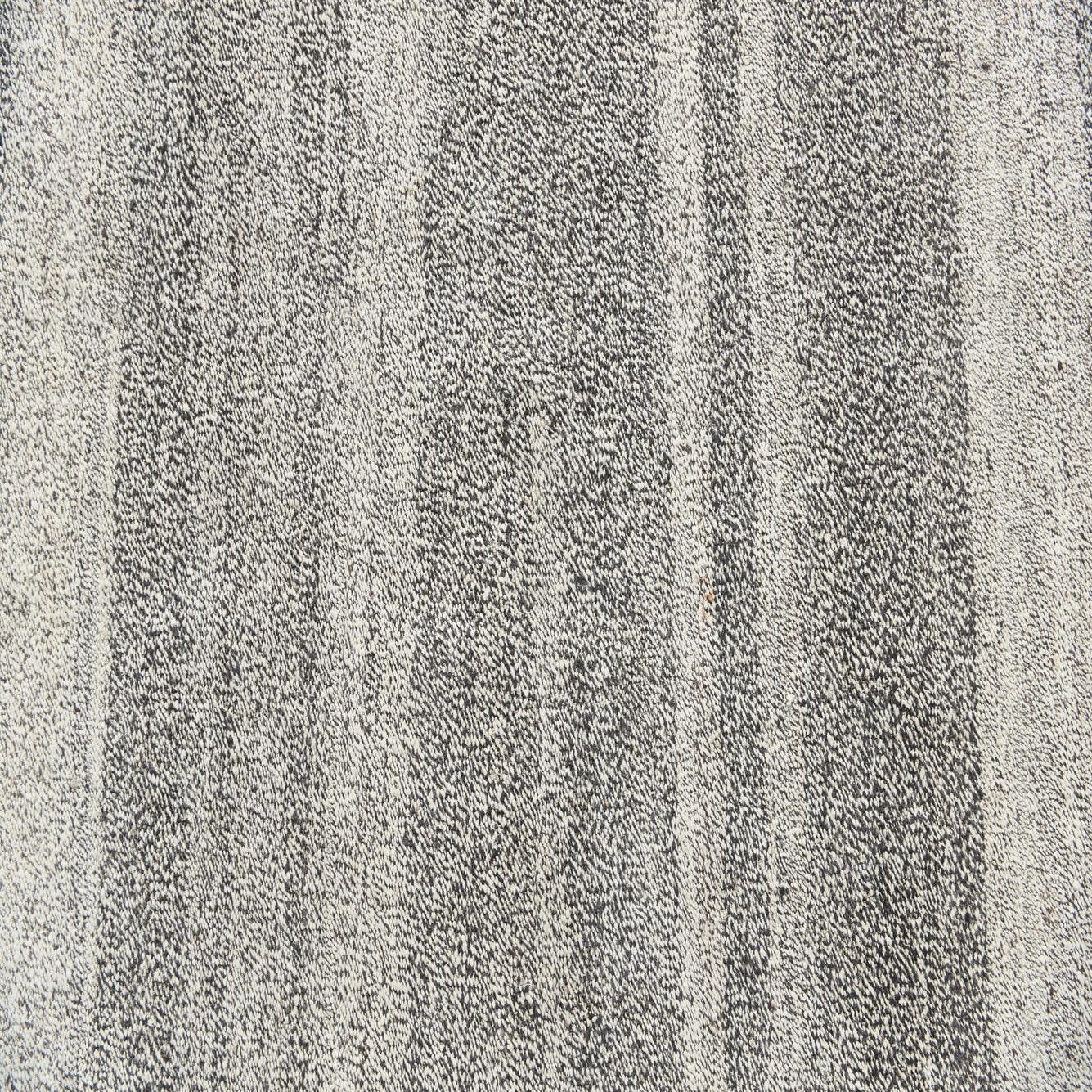 An 8x10 rectangular flatweave rug with abstract horizontal stripes in varying shades of black and grey.