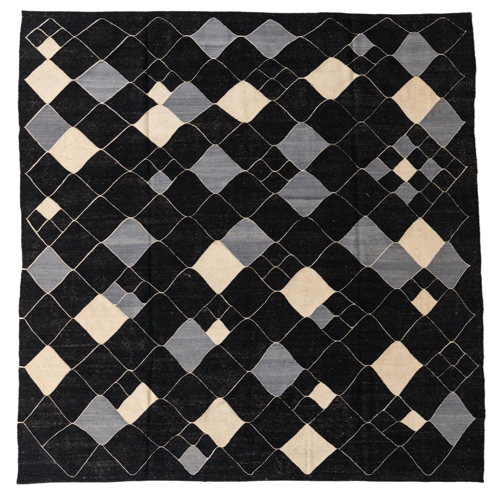 An 8x10 rectangular black wool flatweave rug with a modern tribal pattern of interlocking grey and cream diamonds.