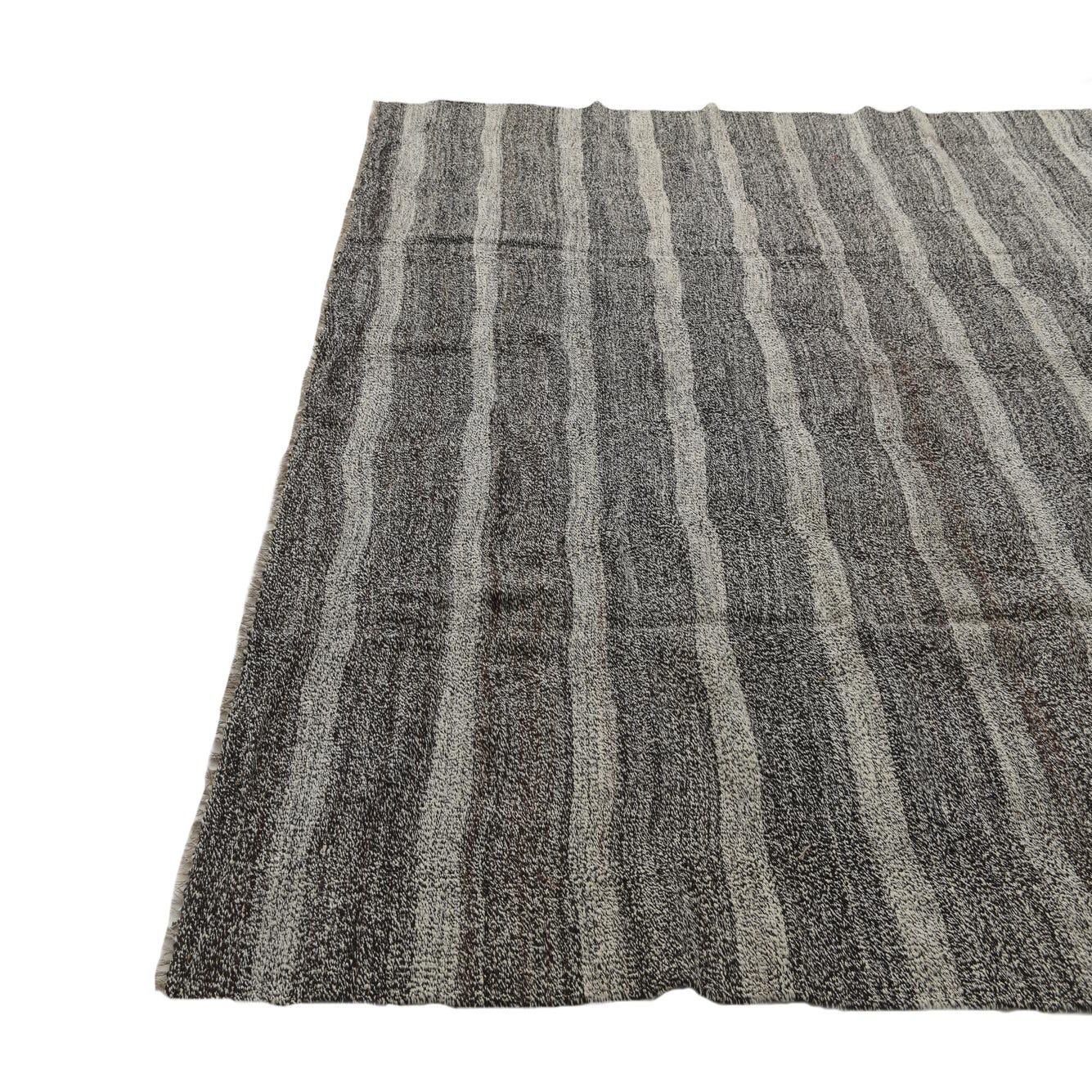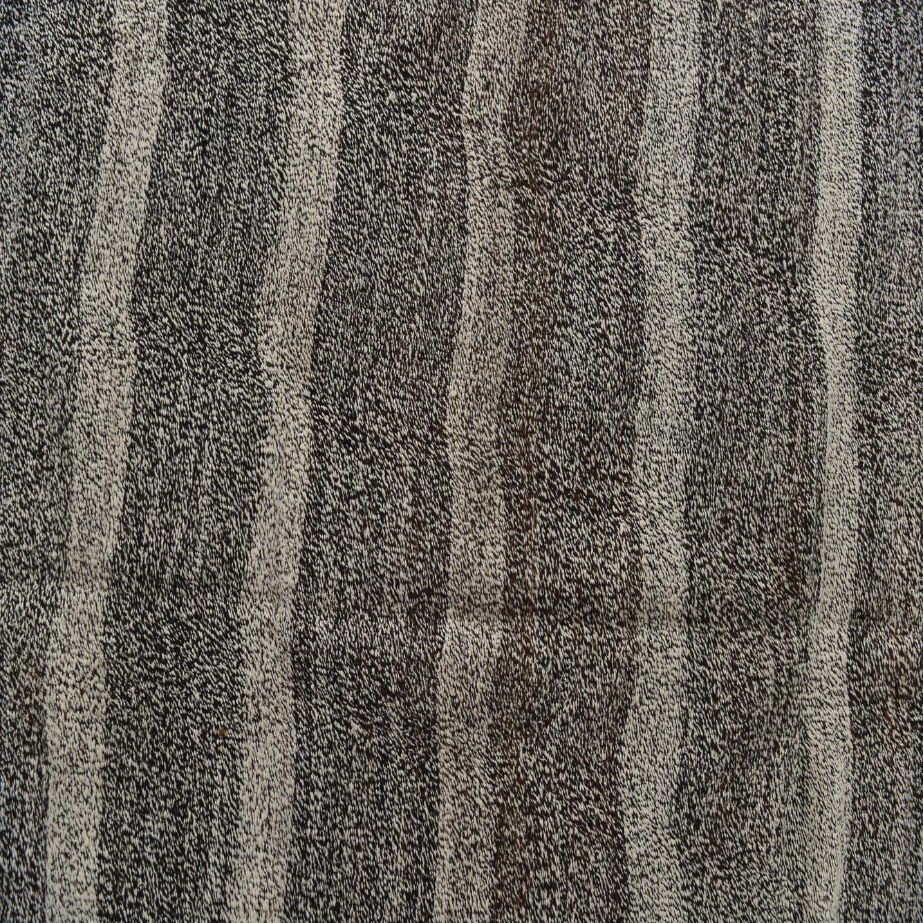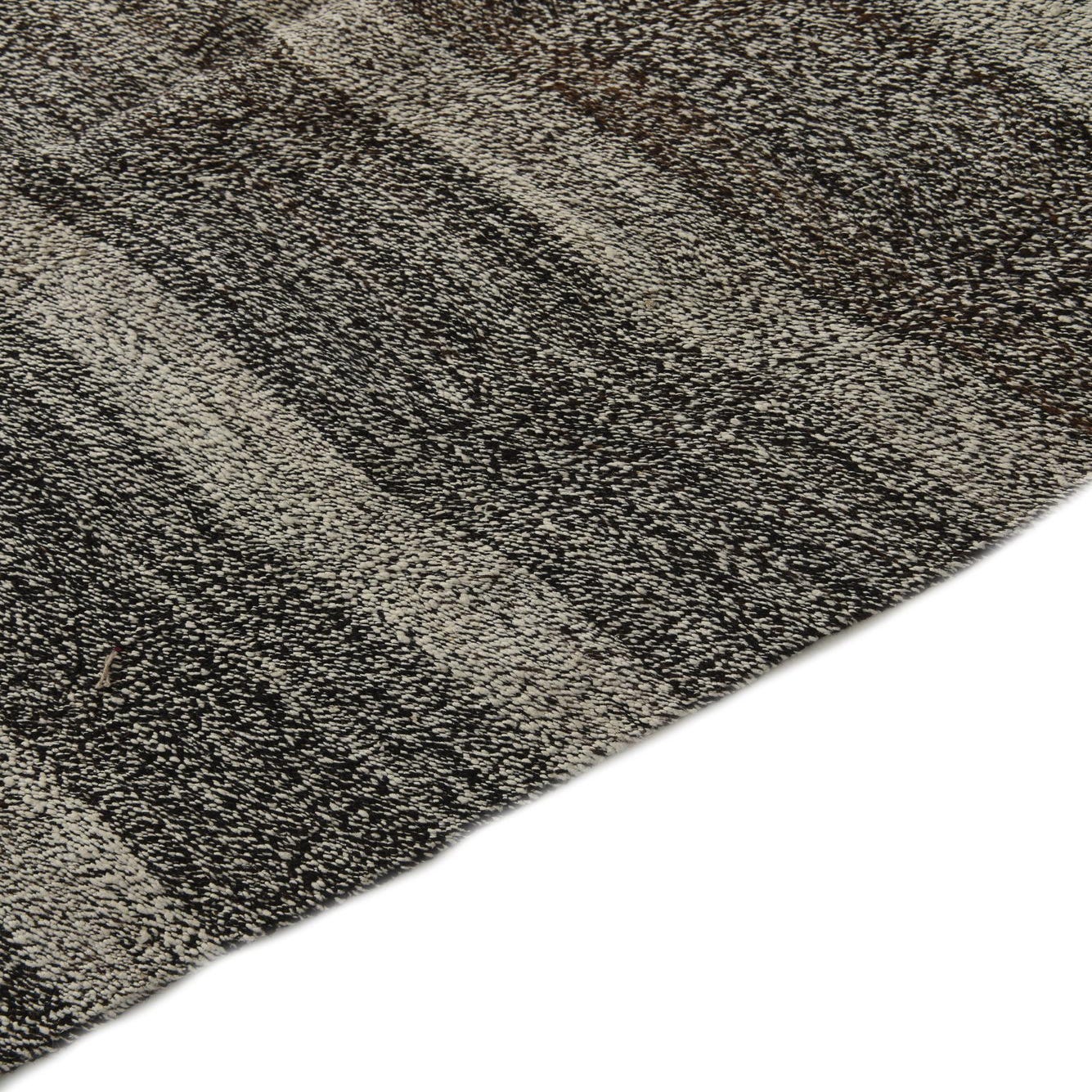 An 8x10 rectangular Kilim Modern rug with horizontal stripes in varying shades of black and gray, showcasing its flatweave texture.