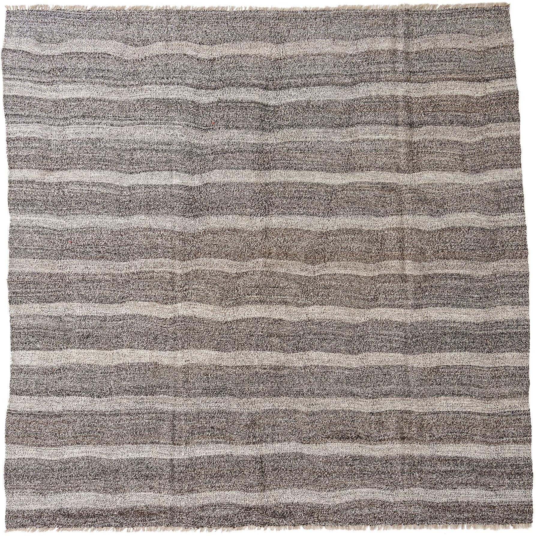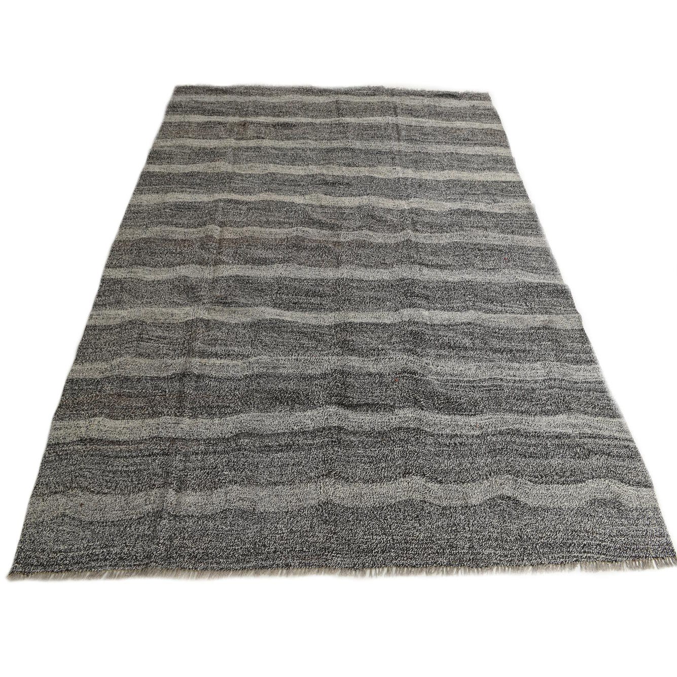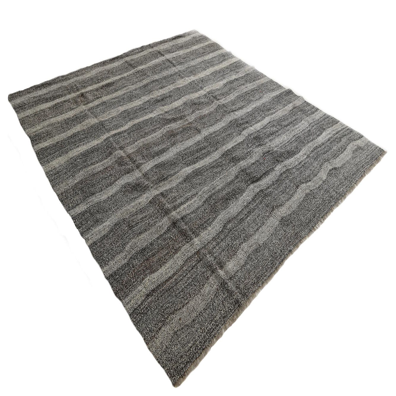 An 8x10 rectangular Kilim Modern rug with horizontal stripes in varying shades of black and gray, showcasing its flatweave texture.